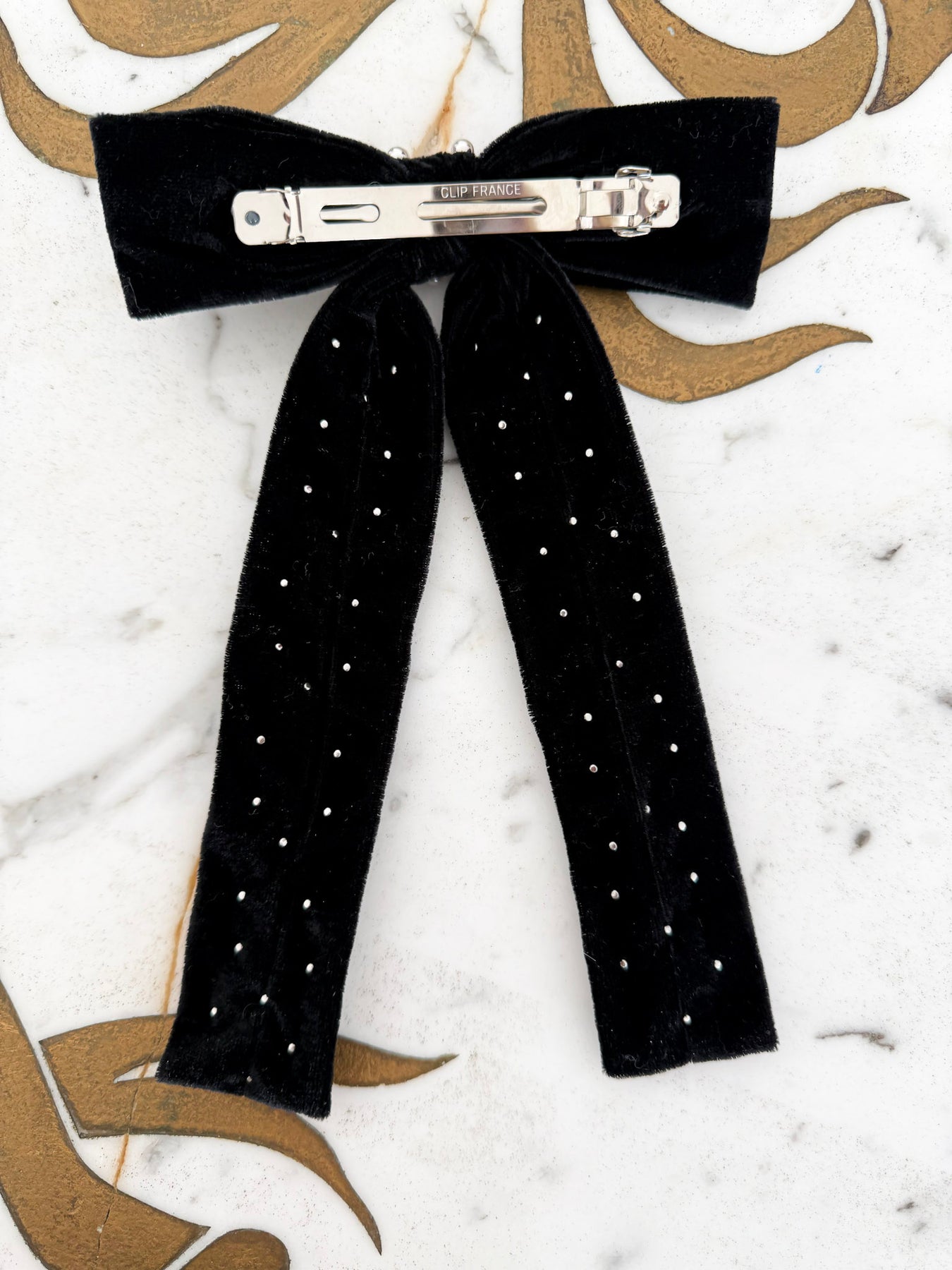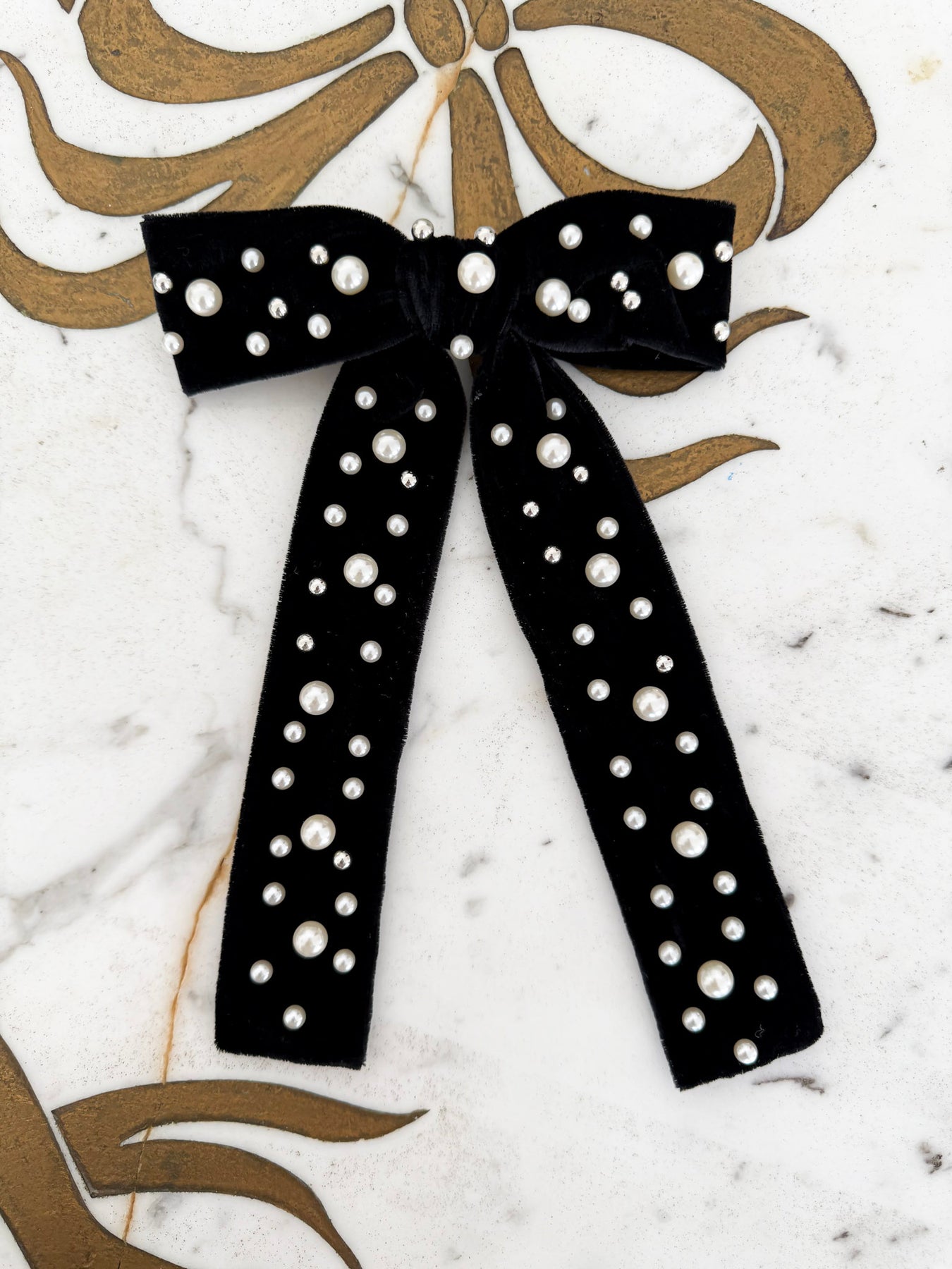 Add a touch of charm with this Black Velvet Hair Bow, adorned with delicate pearl and silver studs. Perfect for elevating any hairstyle, it combines soft velvet texture with sparkling accents for a playful yet elegant look. Whether for a casual day out or a special occasion, this bow brings a fun and stylish finish to your hair.