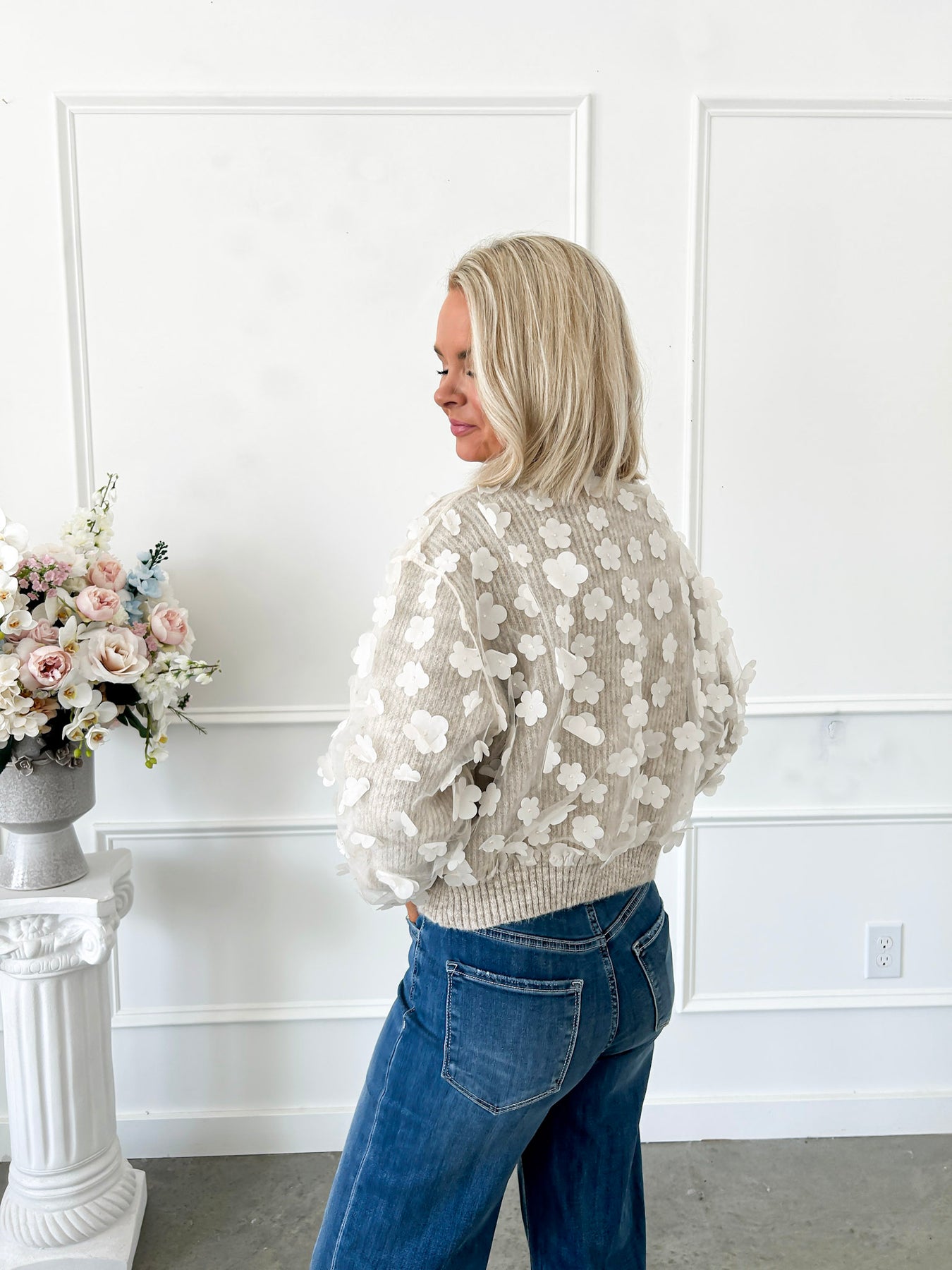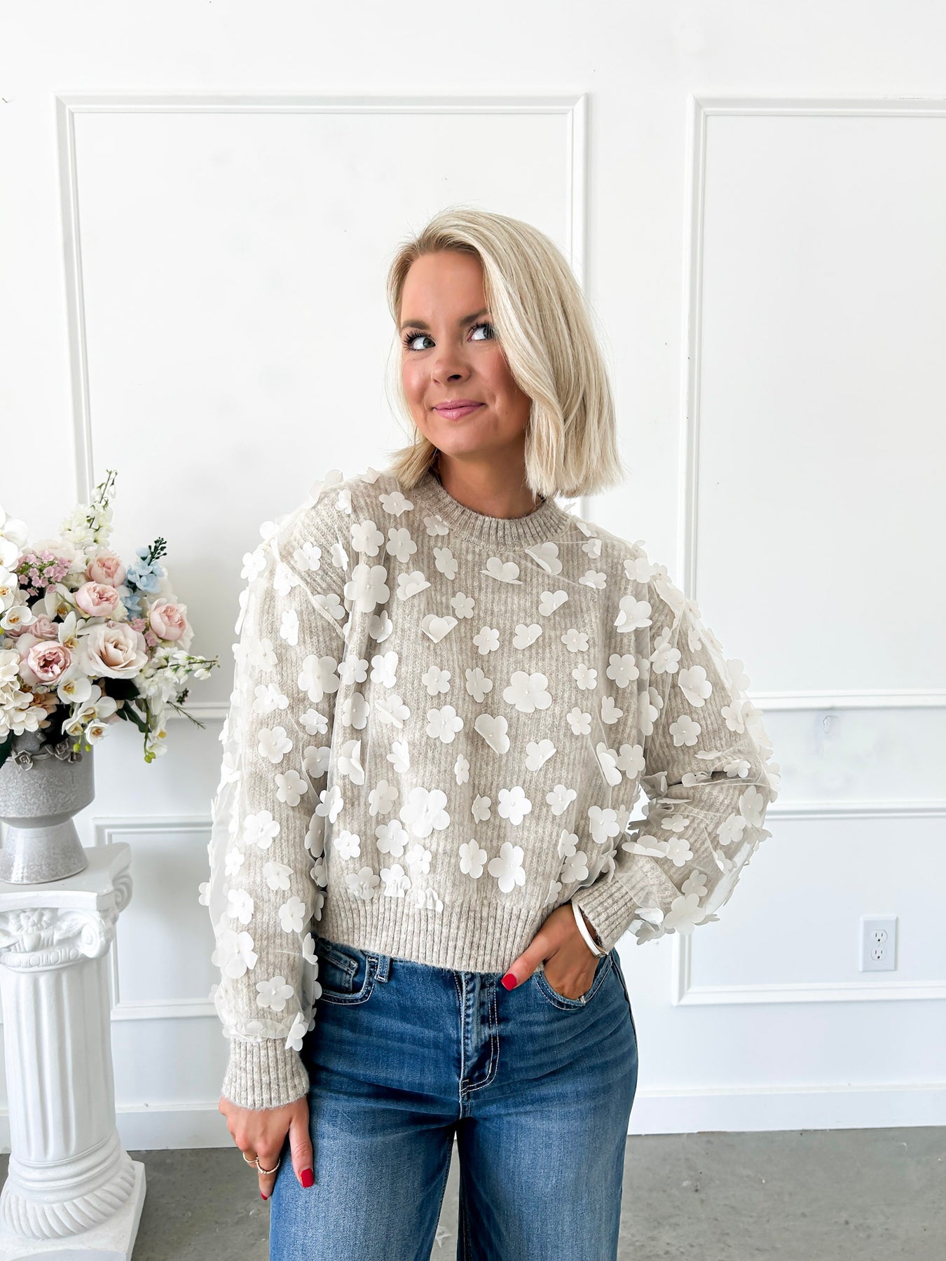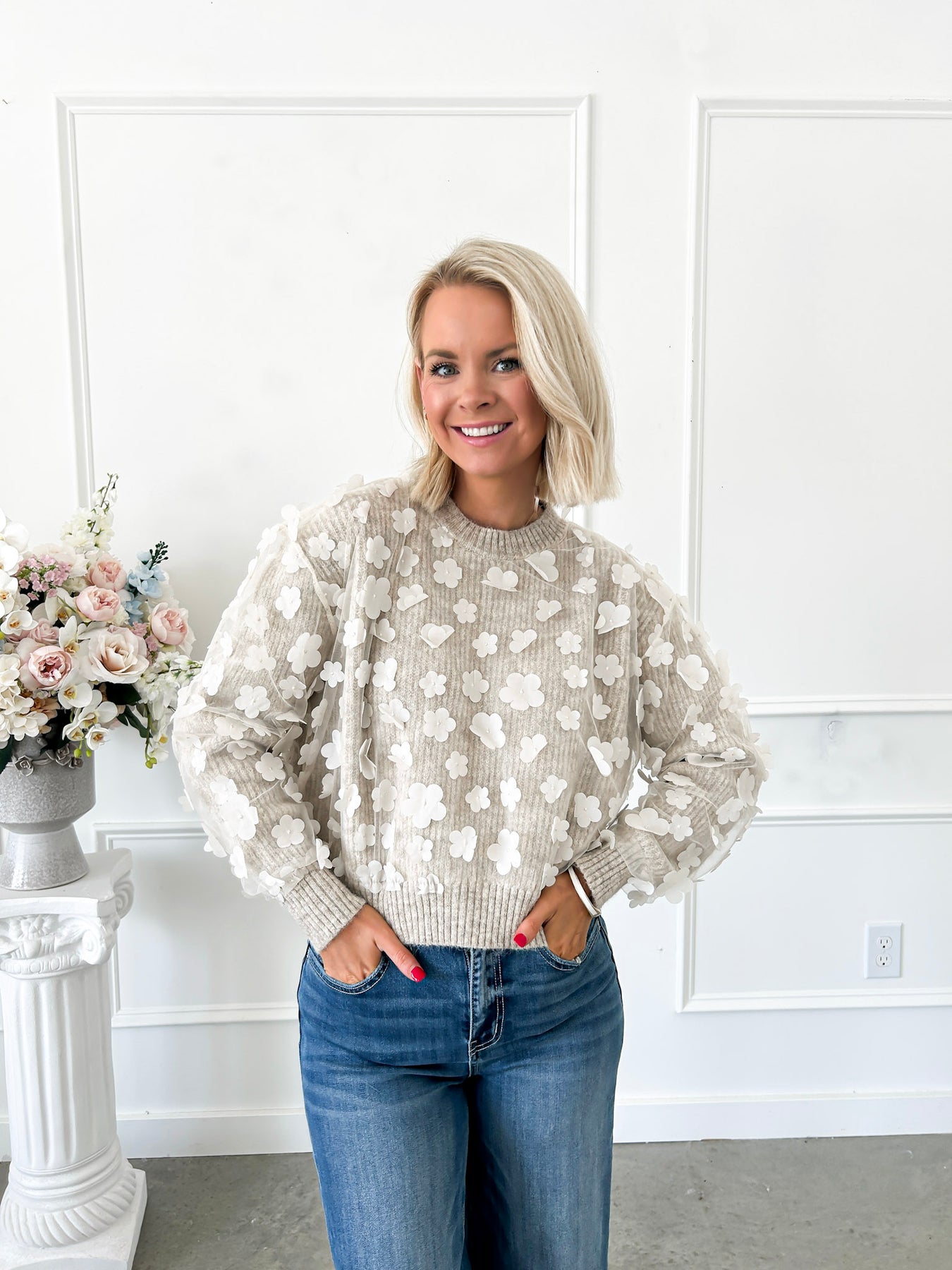 Cozy up your fall wardrobe with this oatmeal-colored sweater featuring delicate ivory 3D floral appliques all over. The playful, girly design adds a charming touch to chilly days, making it a perfect blend of warmth and sweetness. Embrace the season with a stylishly soft look that’s as cute as it is comfortable.