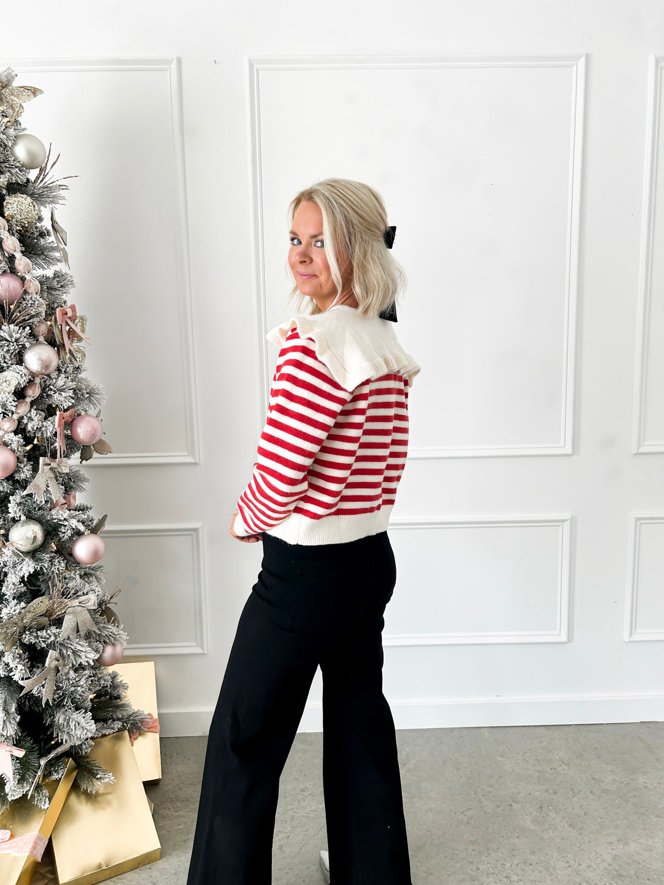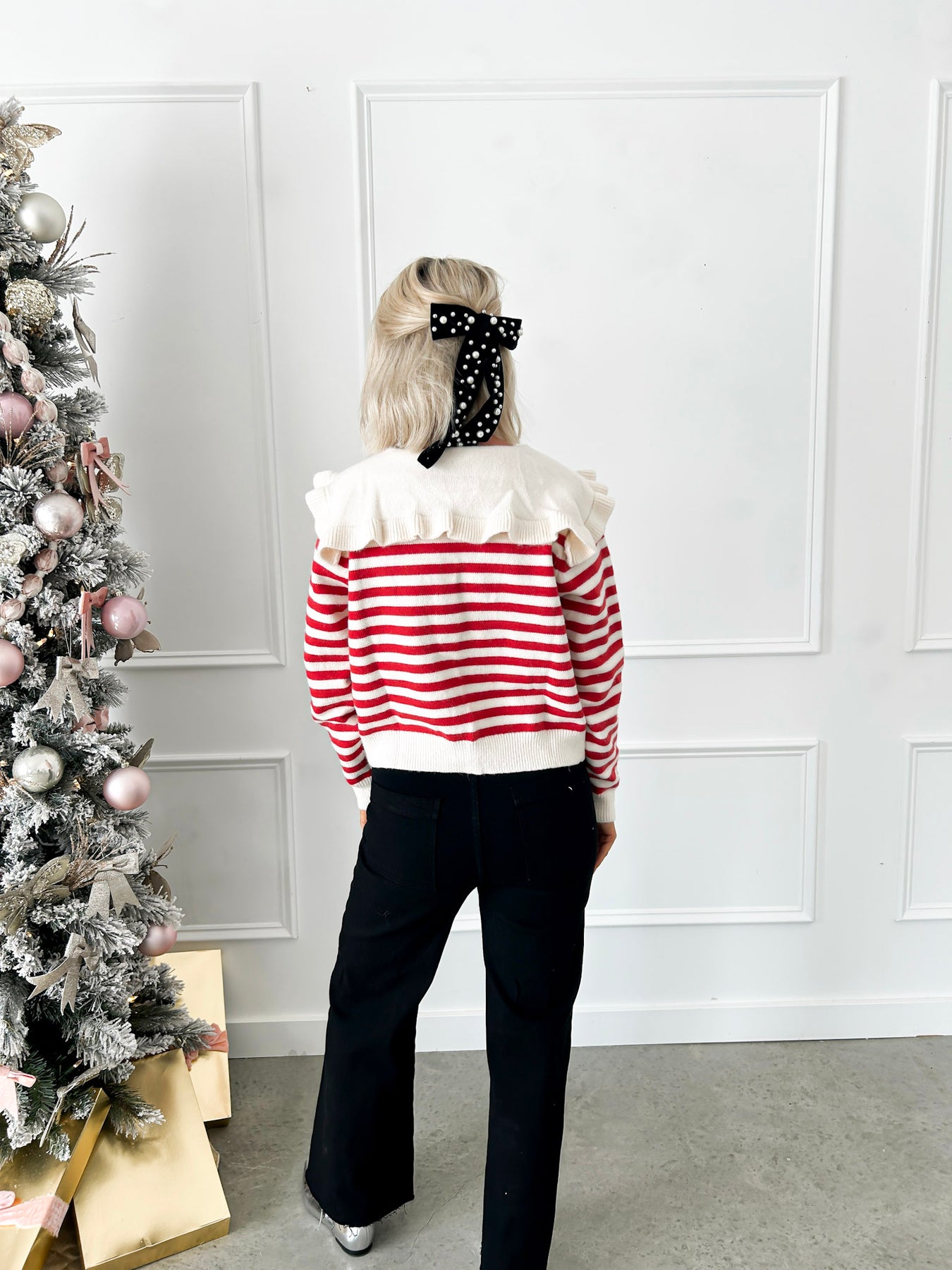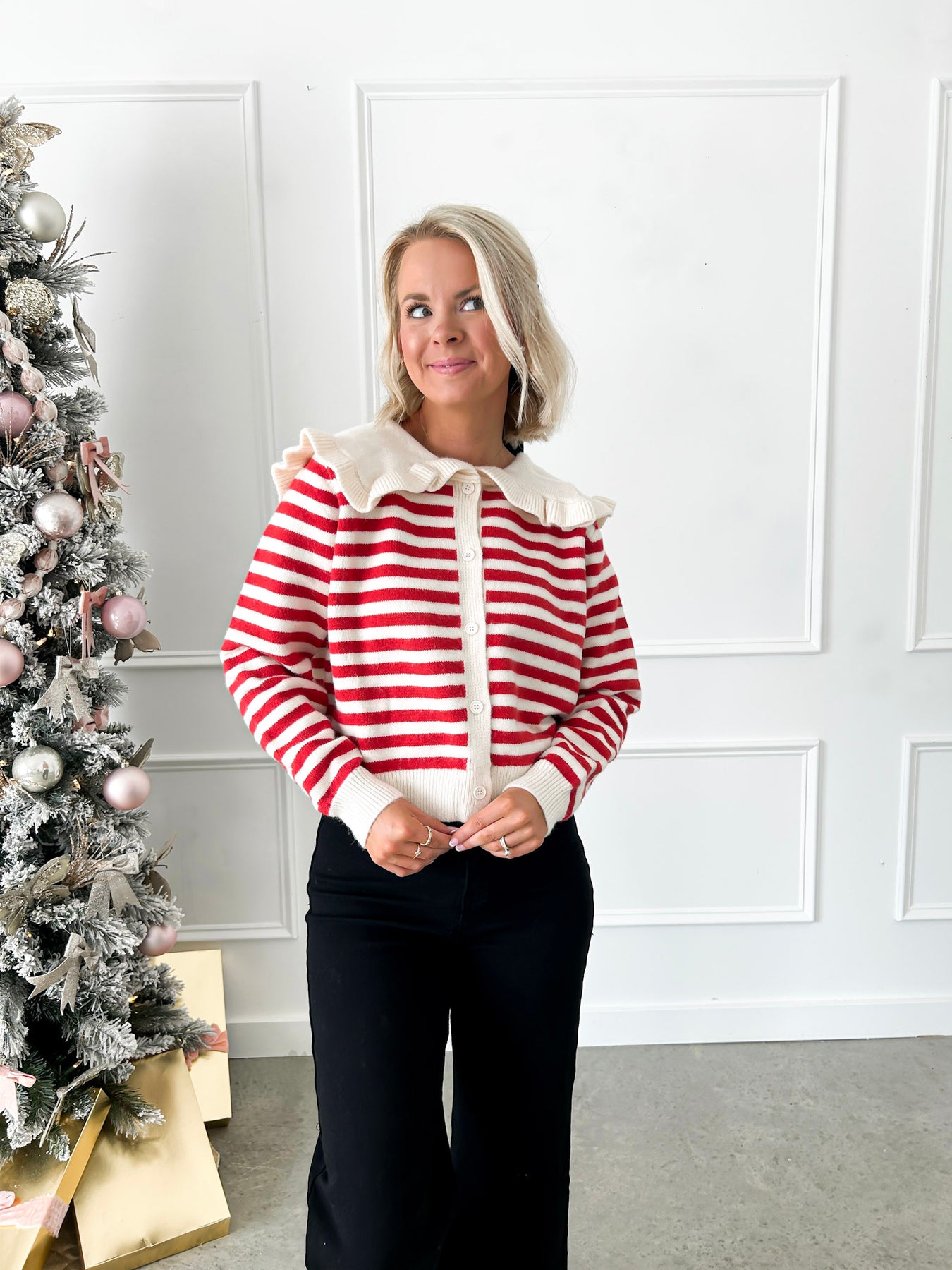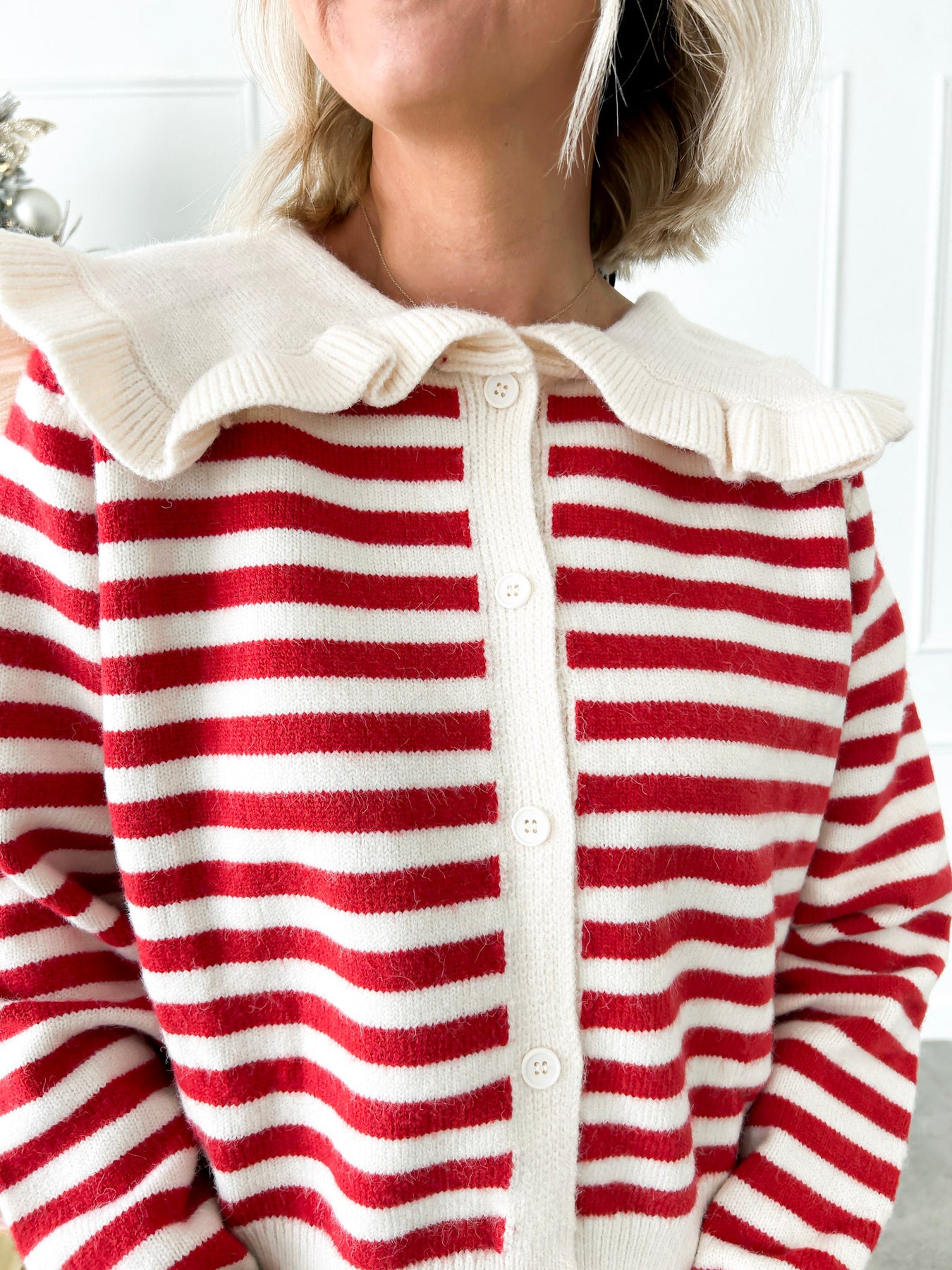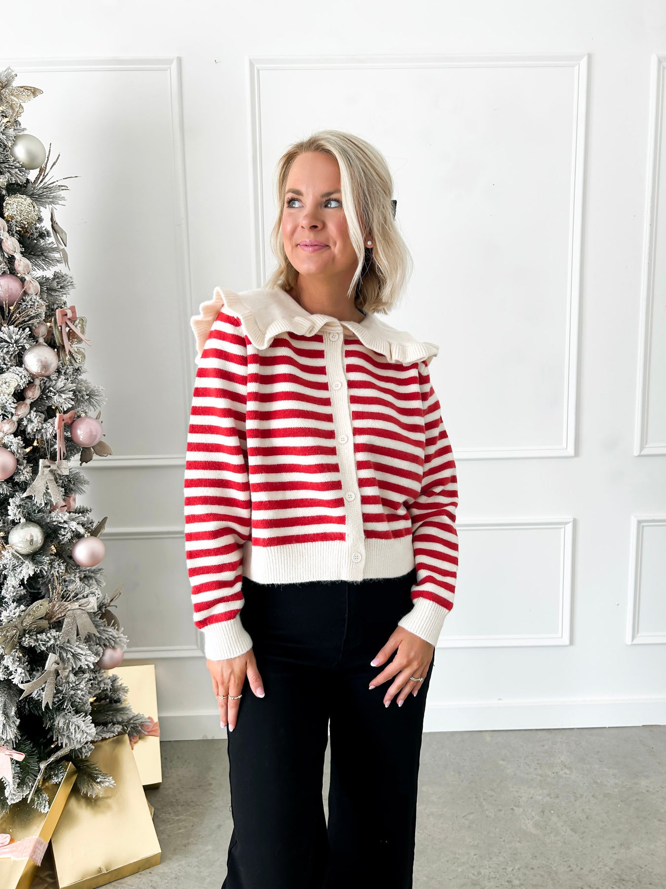 Add a splash of fun to your wardrobe with the Cranberry Crush Red Striped Cardigan. Its playful red stripes and charming Peter Pan collar bring a fresh, whimsical vibe, while the semi-cropped length keeps things flirty and modern. Perfect for layering over your favorite tops, this cardigan combines comfort and style for everyday adventures.