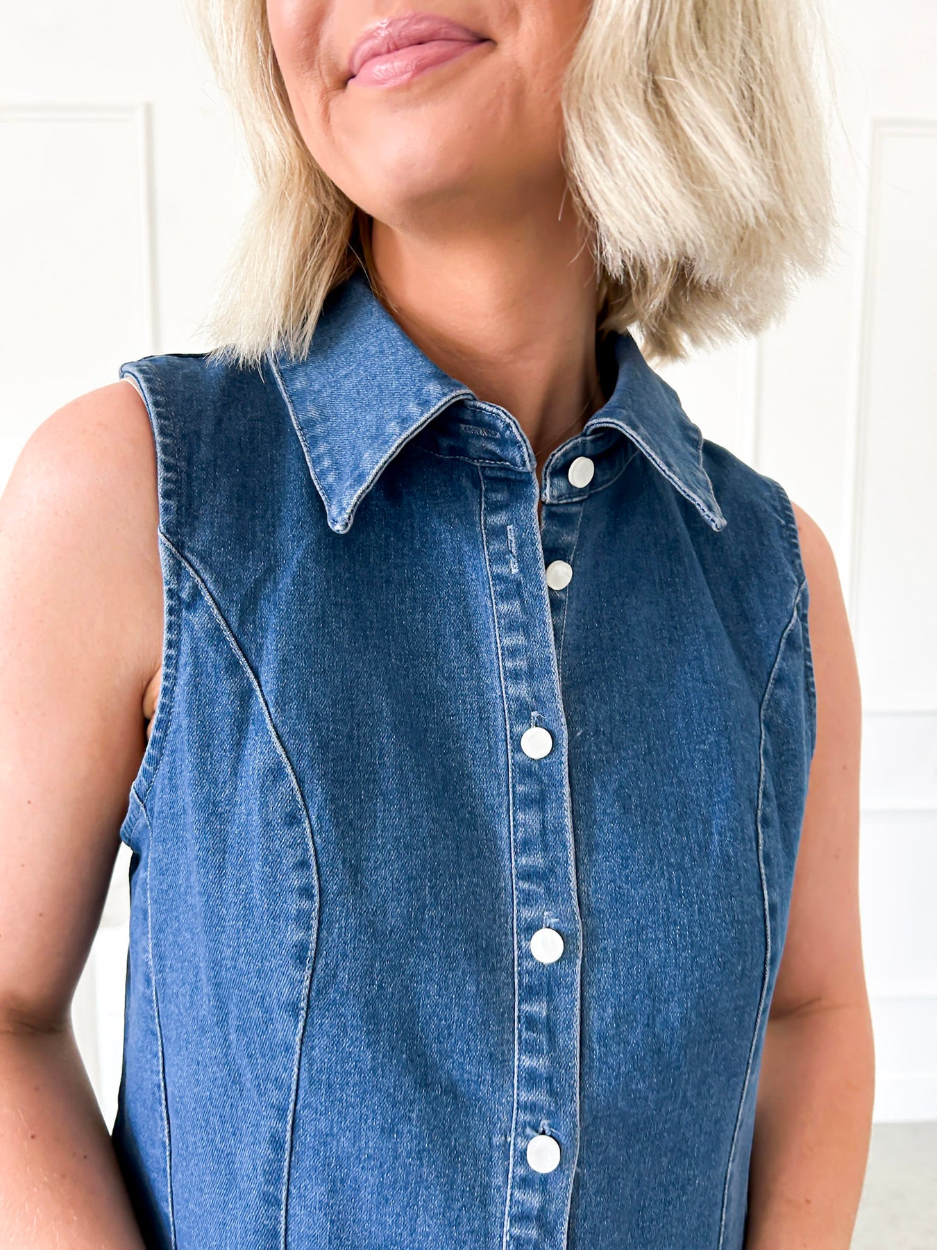 The Dainty Days Ahead Denim Shirt Dress features a sleeveless design and a playful swing-style skirt that moves with you. Its classic collared neckline adds a touch of timeless charm, perfect for layering with our Little Darling White Peter Pan Collared Jacket draped over your shoulders for an effortlessly cute look. Ideal for sunny days and easygoing adventures, this dress mixes comfort and style in a fun, flirty way.