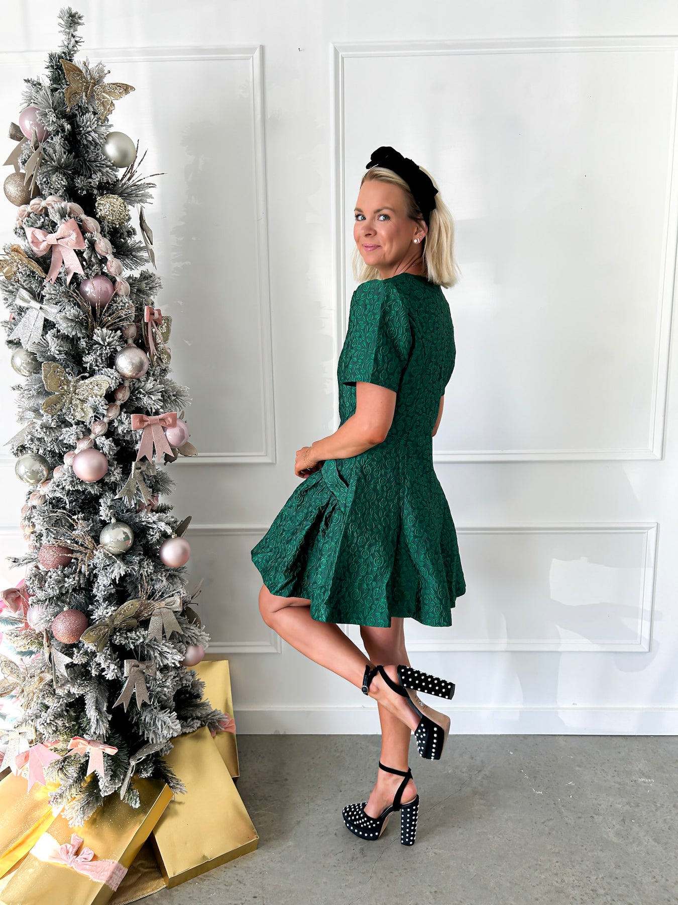 Turn heads in the Evergreen Emerald Jacquard Dress, featuring a delicate floral jacquard fabric that adds subtle texture and elegance. The puff sleeves and fitted bodice highlight your curves, while the flared skirt with gathered pockets brings a fun, flirty vibe. A back zipper ensures a smooth, flattering fit. Ideal for cocktail parties, weddings, or any festive occasion where you want to sparkle with playful charm.