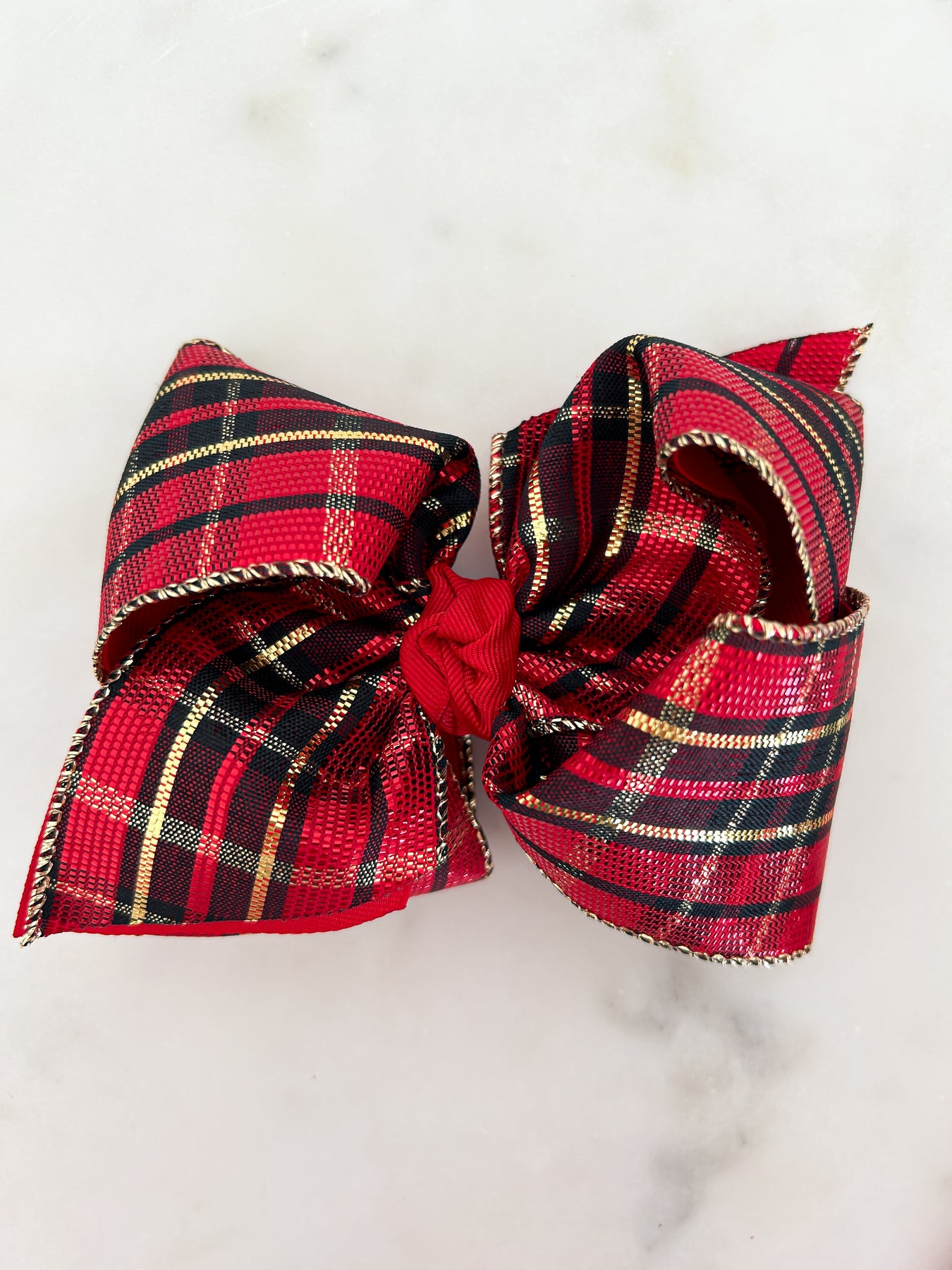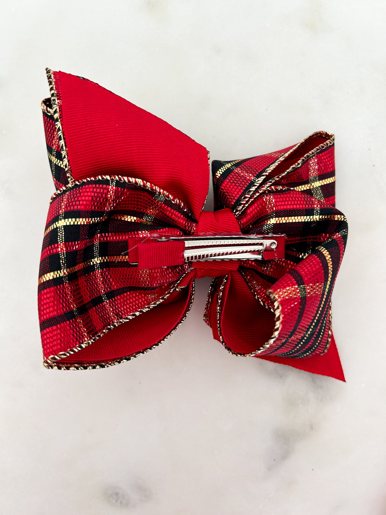 Add a festive touch to your child's hair with the Christmas Gold, Red & Black Plaid Hair Bow from Beyond Creations. This vibrant accessory is perfect for enhancing any holiday outfit. Our bows are handcrafted in the USA, ensuring consistent quality and durability. They are designed to stay secure while being gentle on your child's hair. Beyond Creations is committed to delivering the latest styles and trends in hair accessories, making every day a little more special.