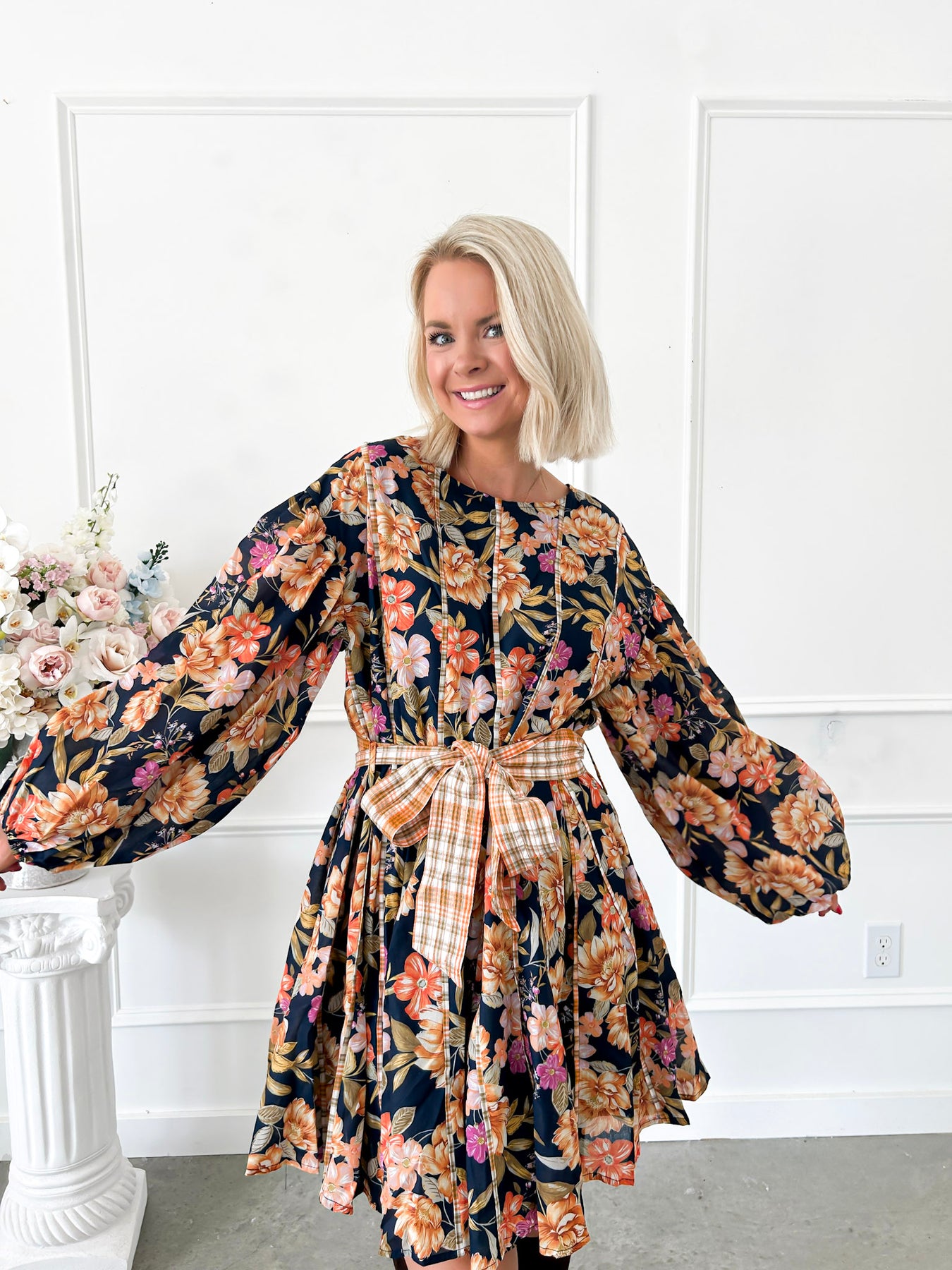 Celebrate the season in the Harvest Blooms Navy Floral Dress, bursting with warm fall hues of orange, yellow, and brown. Its playful all-over floral print pairs perfectly with a charming plaid orange bow at the waist, adding a pop of seasonal flair. The flared skirt creates a fun, twirl-worthy silhouette that’s perfect for crisp autumn days and cozy gatherings. This dress is your go-to for cute, comfortable fall style.