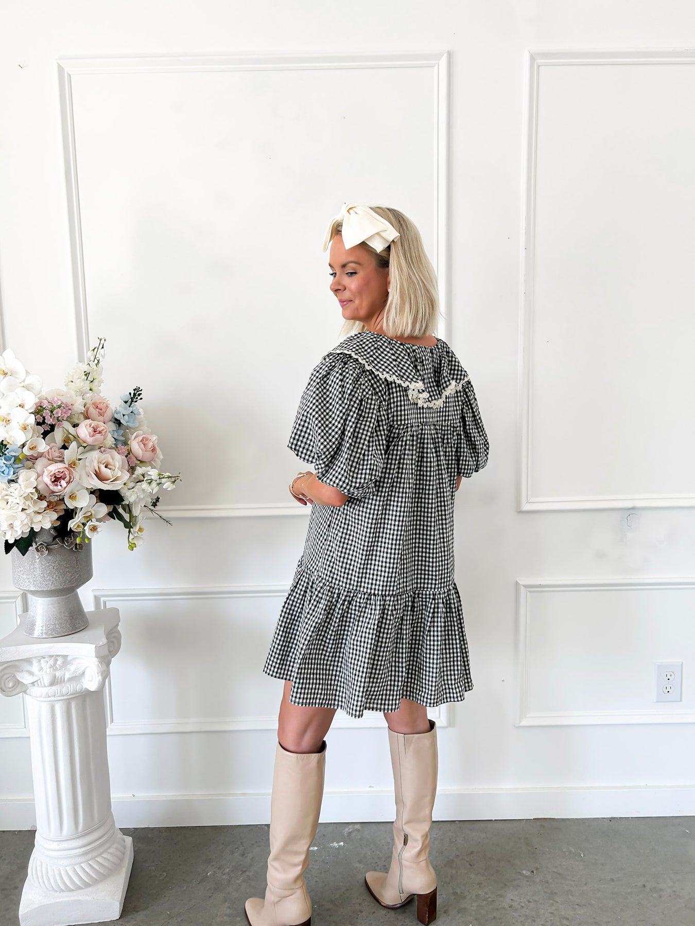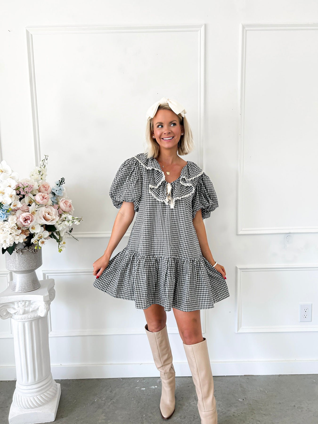 Embrace effortless style this fall with the Held Gently Black Gingham Dress. Featuring a charming bow detail at the neckline, puff sleeves, and a classic Peter Pan collar, this dress balances vintage flair with modern ease. The drop ruffle hem adds playful movement, while convenient pockets offer practicality without sacrificing style. Perfect for cozy days and crisp evenings, it’s a versatile wardrobe essential that combines comfort and elegance seamlessly.
