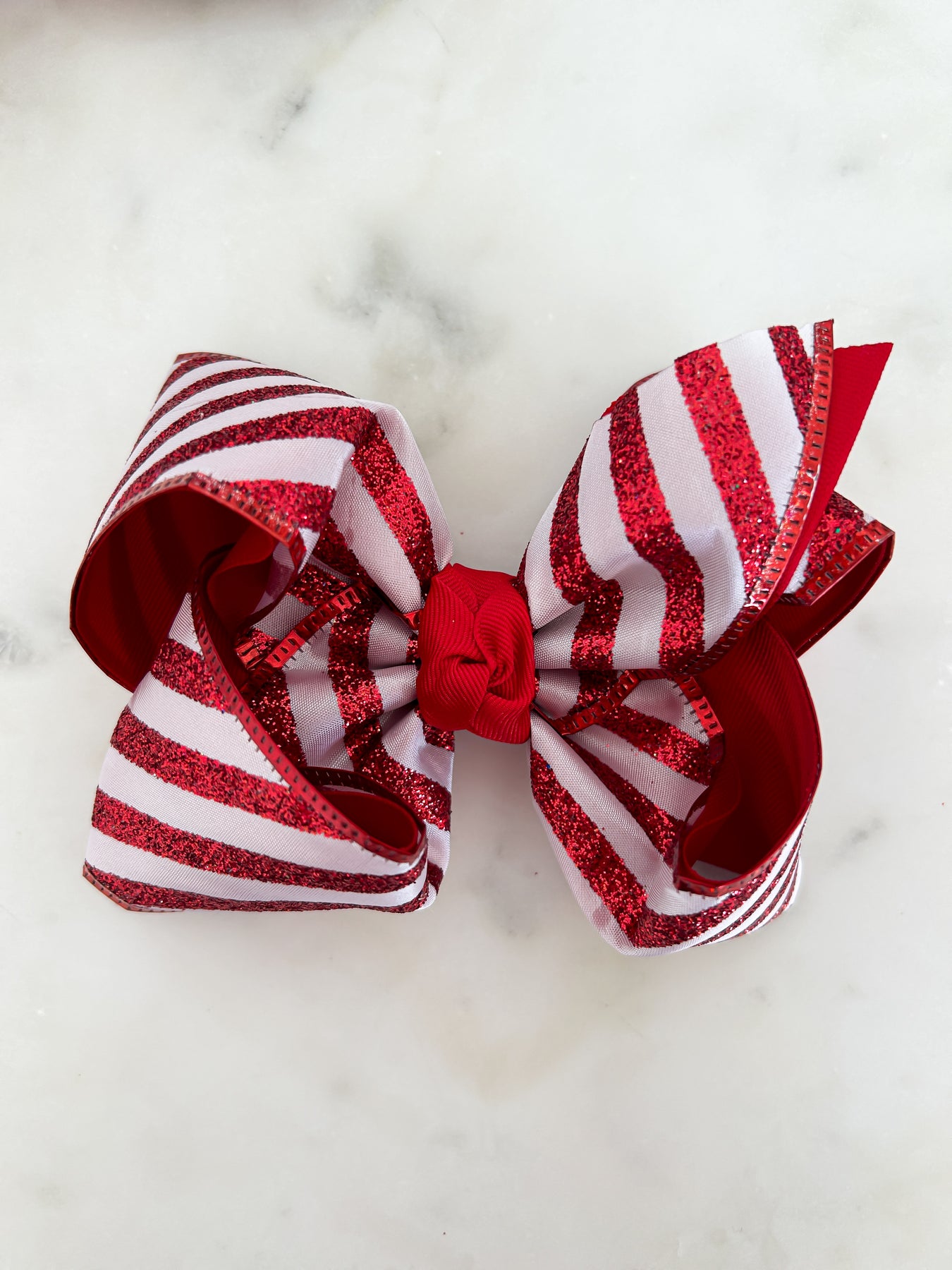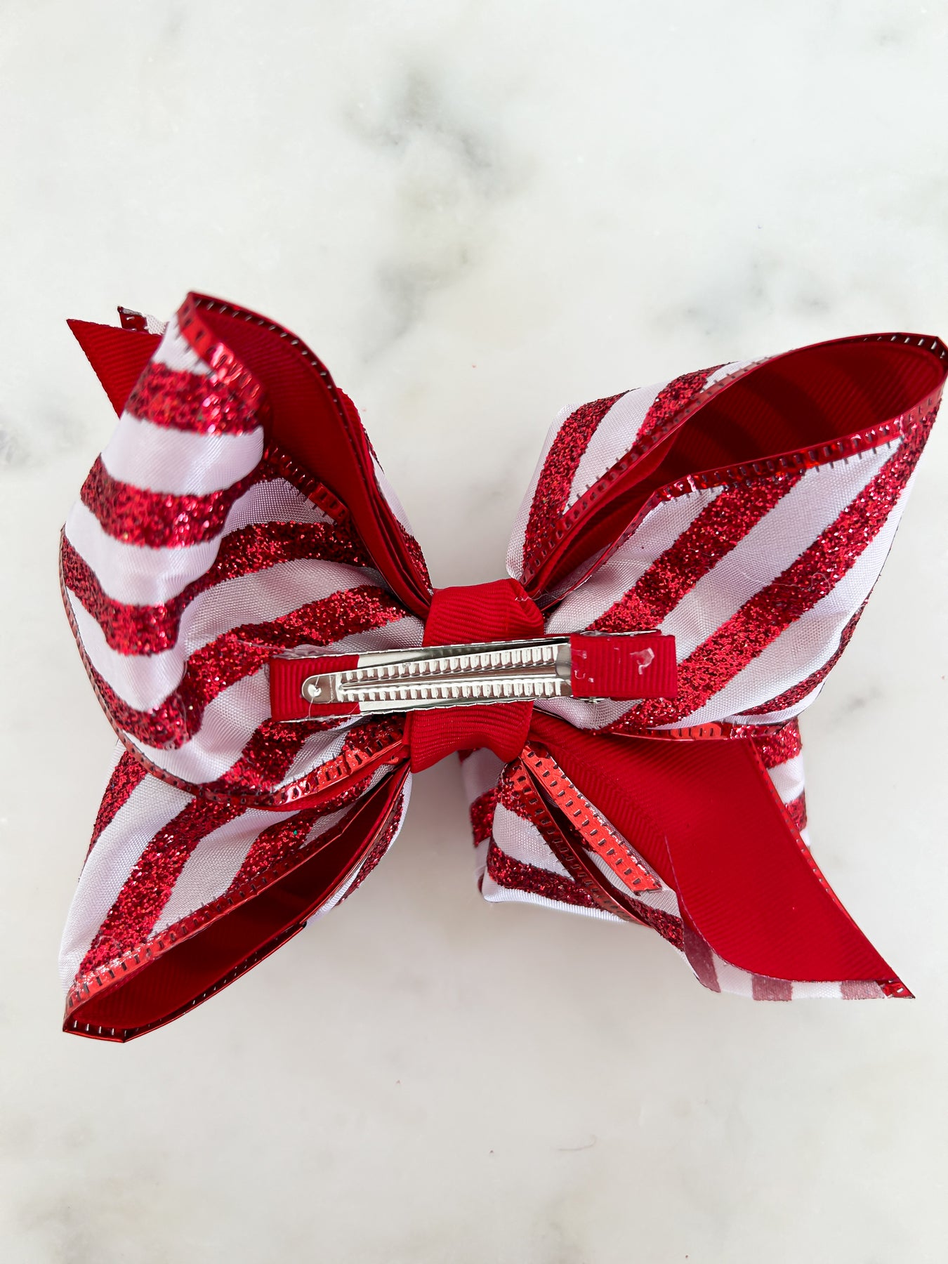 This festive 5.5" layered bow sparkles with red striped glitter, adding a cheerful pop to any look. Secured on an alligator clip, it easily attaches to any interchangeable headband (sold separately), making it perfect for mixing and matching holiday styles. Brighten up your Christmas outfits with this playful, glittery bow!