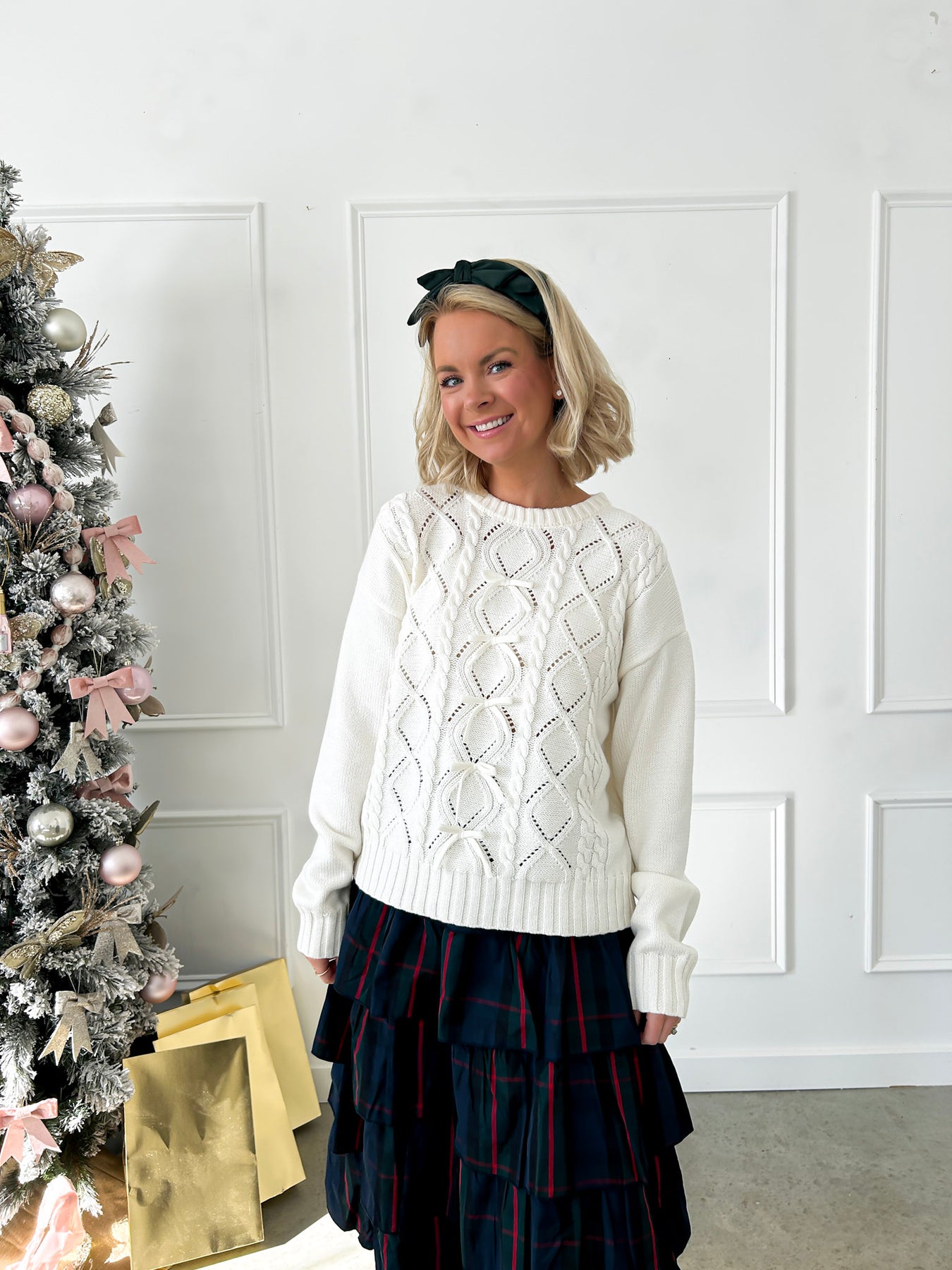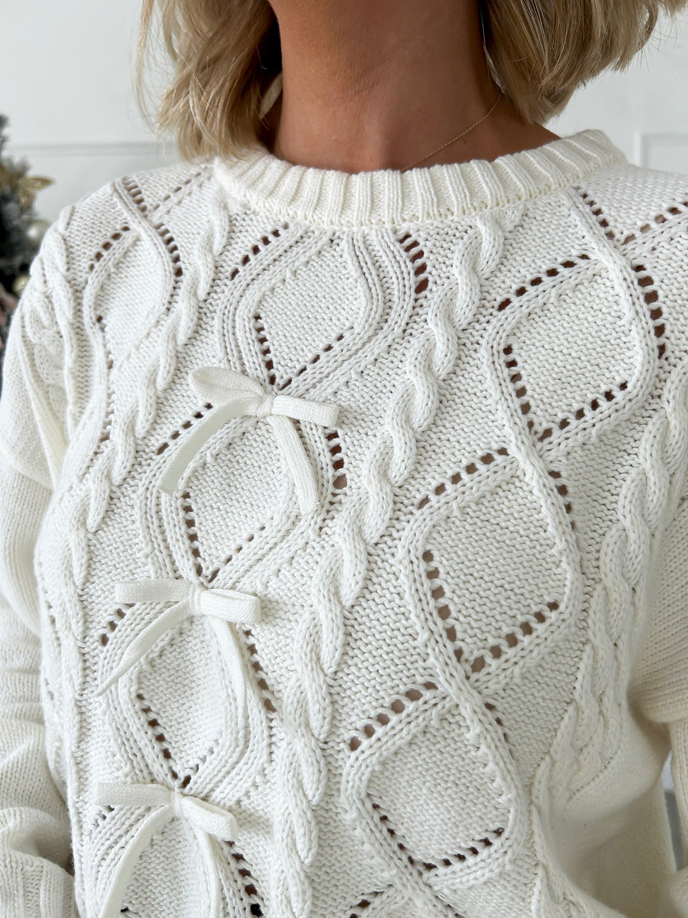 Introducing the Morning Dew Cream Bow Cable-Knit Sweater—where feminine charm meets everyday comfort. This delightful piece features an intricate openwork design adorned with delicate bows cascading down the front, creating a look that's both sophisticated and whimsical. Crafted from soft, cozy fabric, it's perfect for layering over collared shirts or pairing with tailored trousers and denim alike. The classic crew neckline and relaxed fit offer effortless versatility, whether you're heading to brunch or enjoying a casual day out. A timeless addition that brings playful polish to any wardrobe.