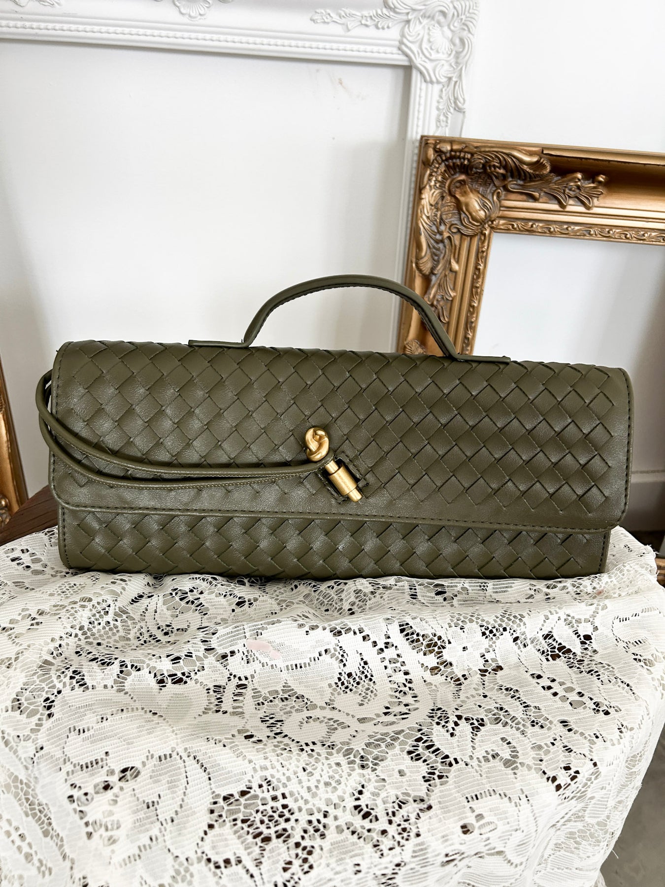 This olive green woven leather handbag is the perfect accessory to refresh your fall wardrobe. Featuring a rich, textured weave and a sophisticated gold closure, it combines durability with elegant style. Make a statement this season with a bag that effortlessly complements your autumn looks while providing reliable functionality.