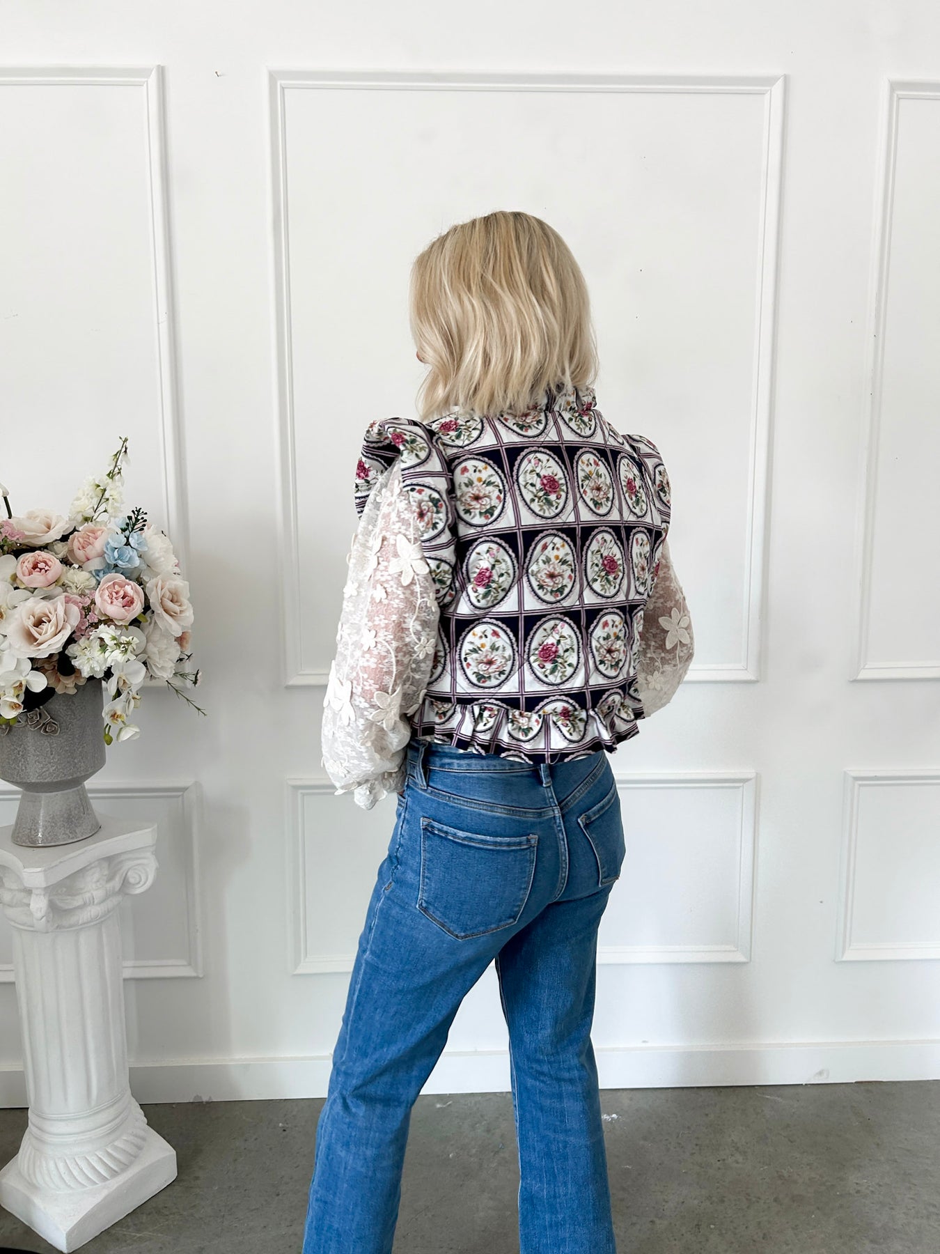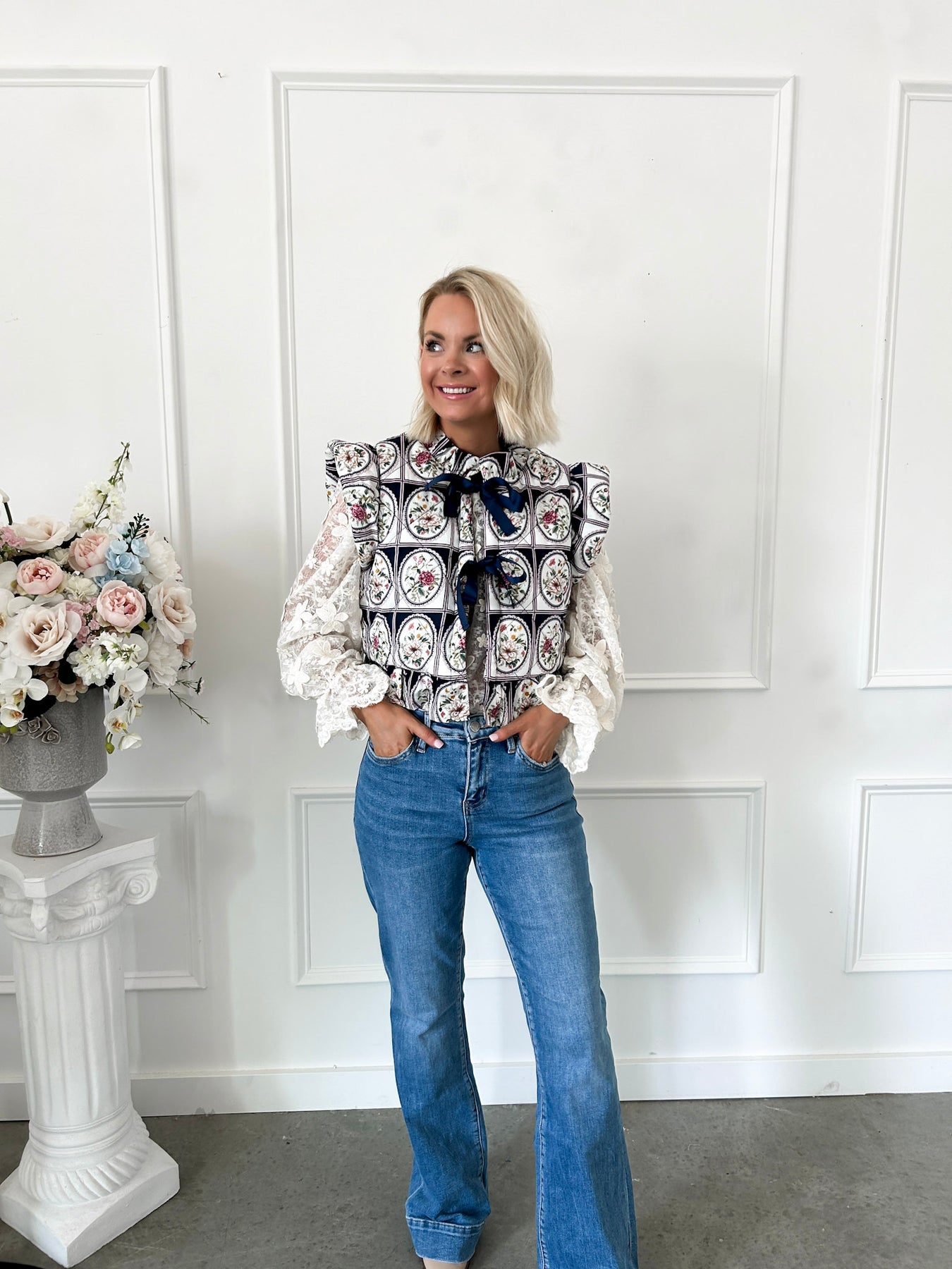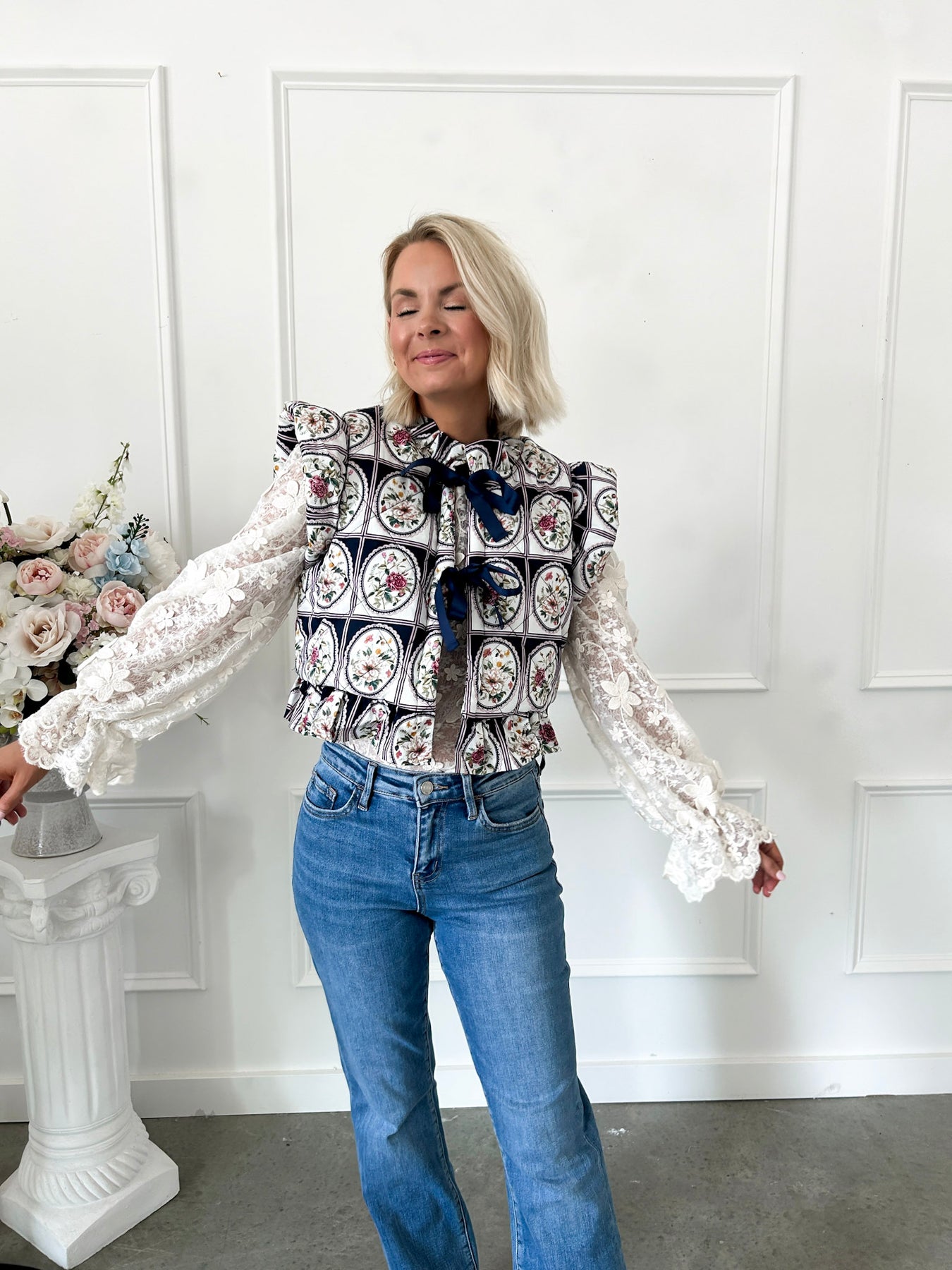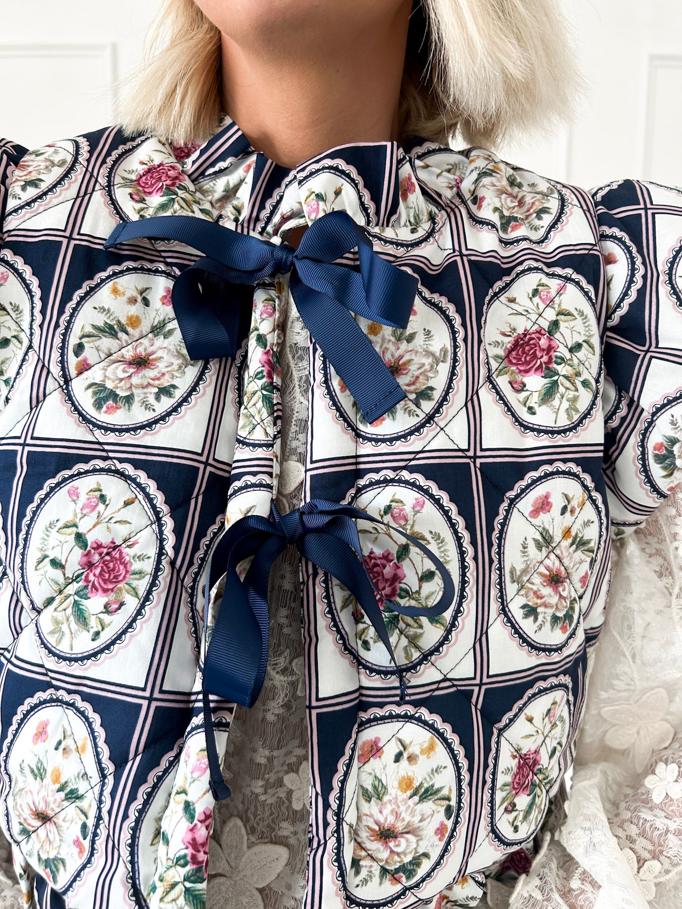Stay warm and chic this fall with our Quilted With Love Navy Floral Vest! The unique quilted patchwork design, complete with a cute bow tie closure and ruffled trim, adds a touch of whimsy to any outfit. With its navy and floral print, this vest is perfect for the girly fashionista.