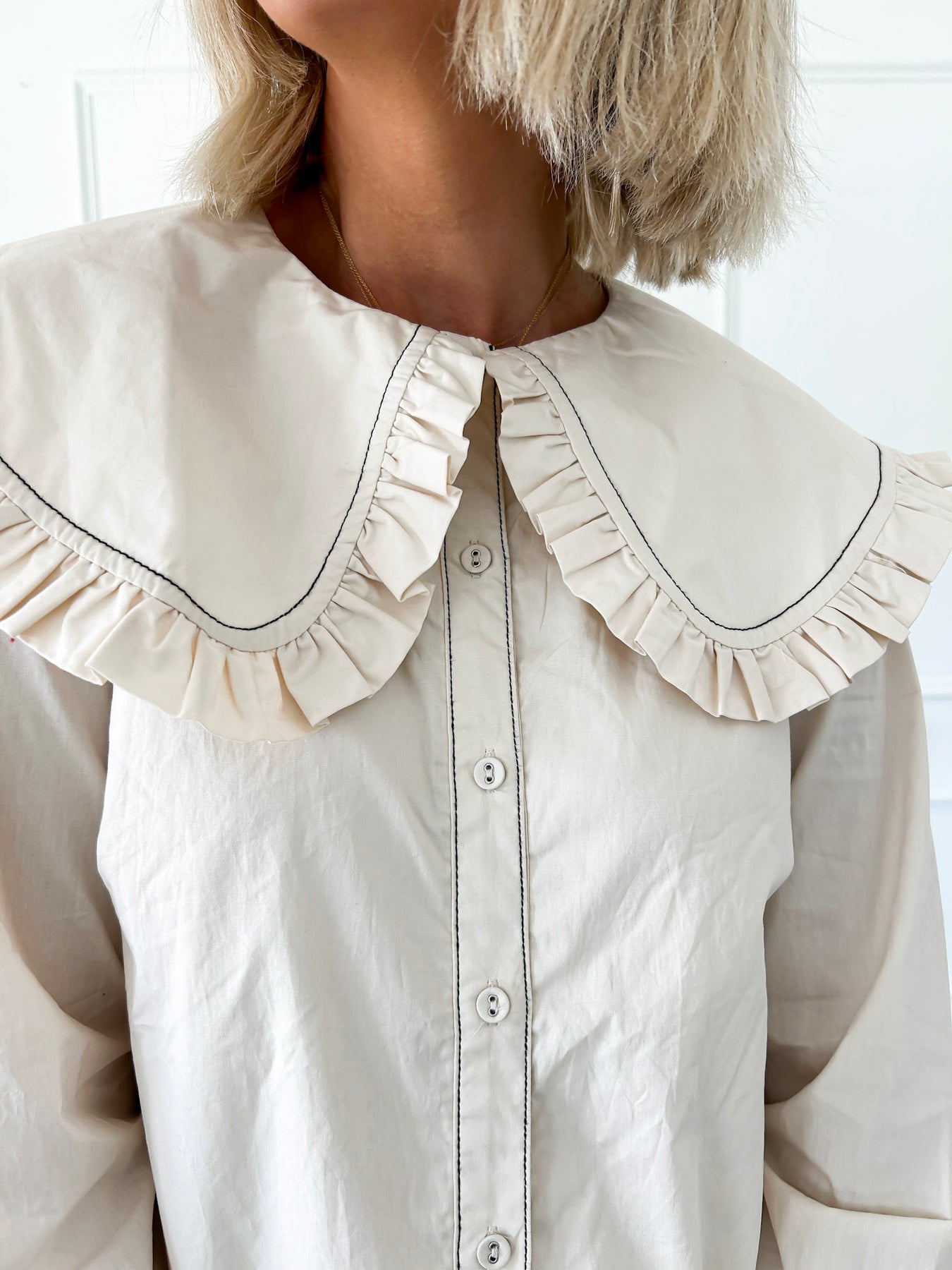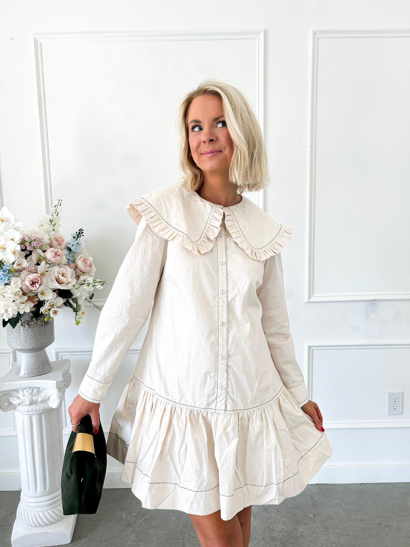 The Somehow Still Ivory Collared Dress is a must-have for your fall wardrobe. Crafted from soft ivory white poplin cotton, it features a classic Peter Pan collar and a delicate drop ruffle hem that brings subtle elegance to every movement. Its warm, neutral tone makes it a versatile staple, perfect for layering or wearing alone. Experience effortless style and comfort designed to become a cornerstone piece in your closet.