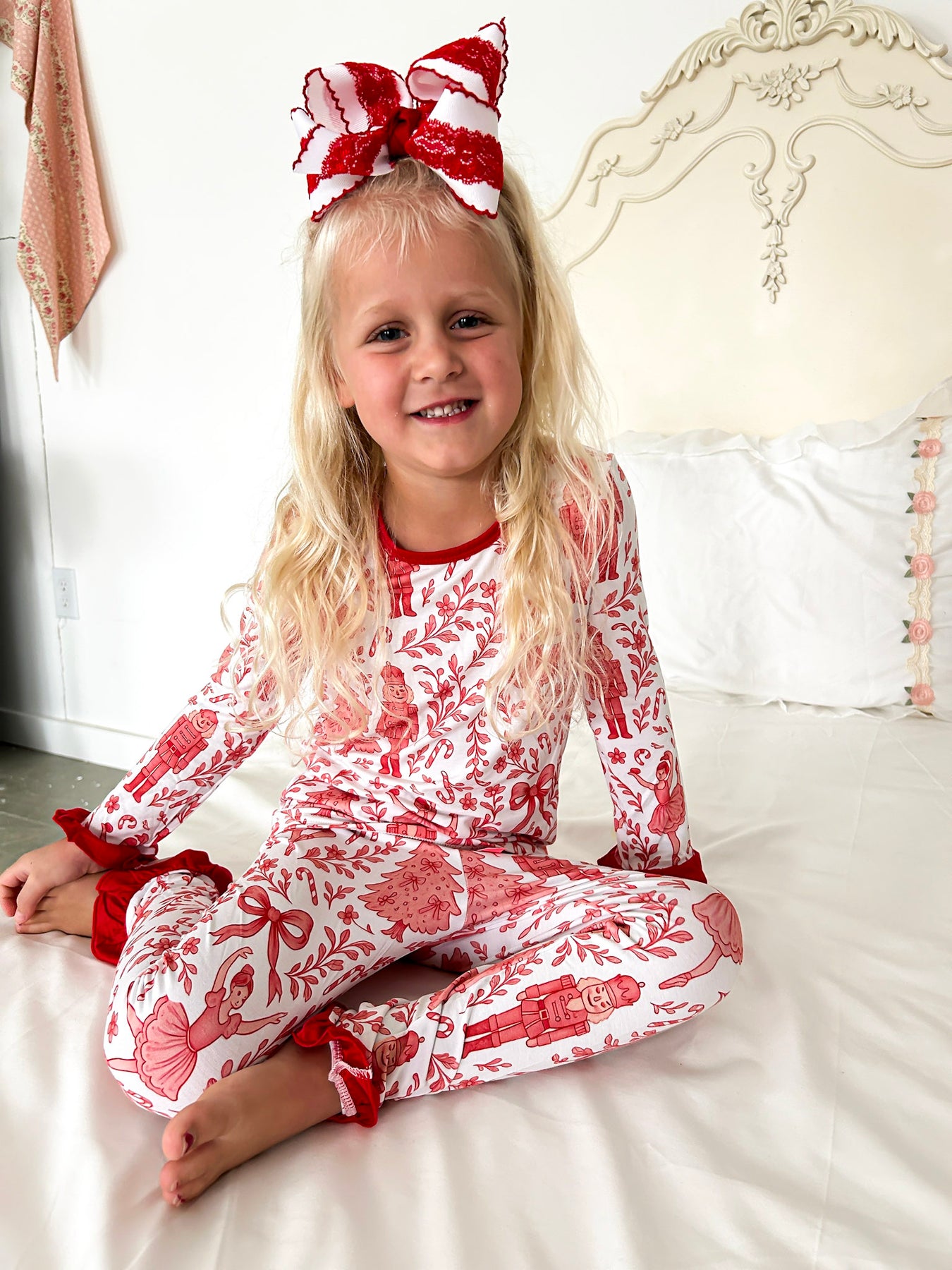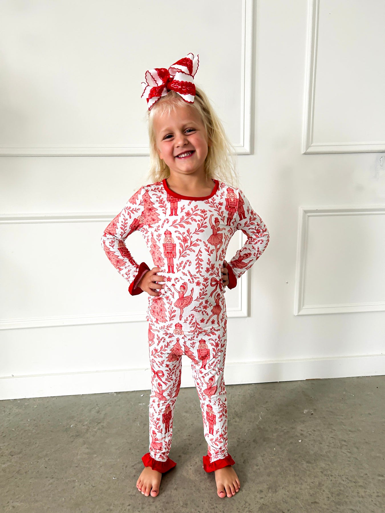 Bring festive cheer with the Wrapped In Wonder Toddler Christmas Pant Set! This playful set showcases a delightful ballerina, nutcracker, and tree print in vibrant Christmas red. Featuring a charming red ruffle cuff at the ankle and wrist, and a red fixed bow at the waist it’s perfect for coordinating with all the girls on Christmas morning.