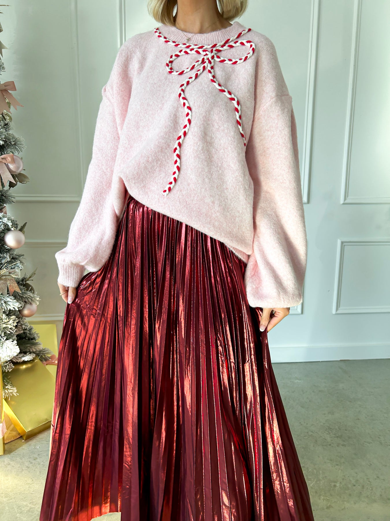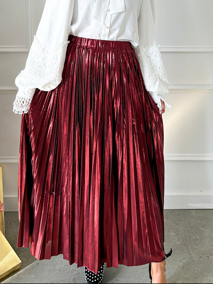 Shine your way through the season in our metallic burgundy pleated midi skirt — the ultimate statement piece for holiday moments big and small. Its rich, twirl-worthy pleats catch the light beautifully, giving just the right touch of shimmer without going over the top. Whether you’re dressing it up with heels and a bow blouse or keeping it casual with a cozy sweater and boots, this skirt brings festive charm to every occasion.