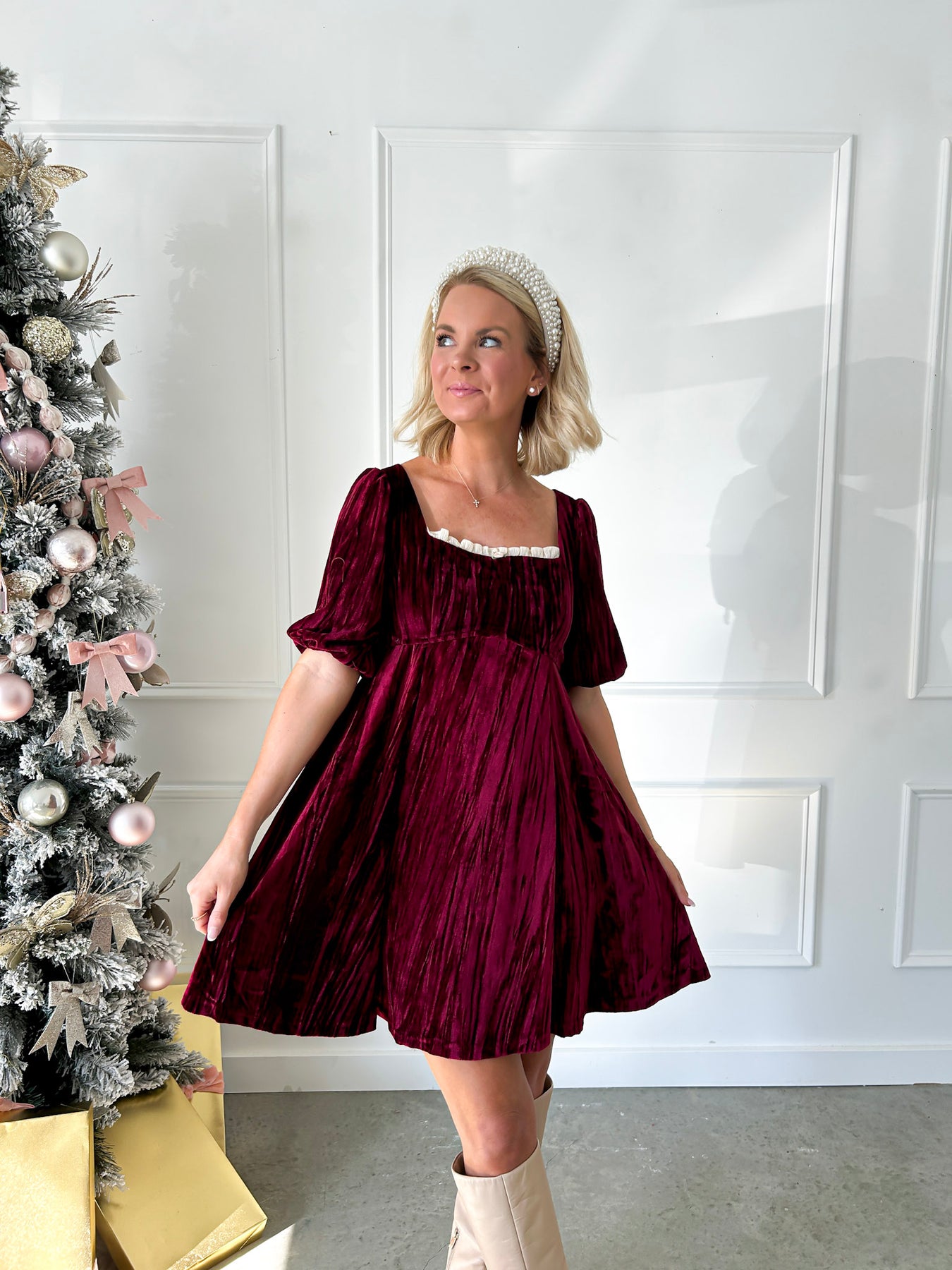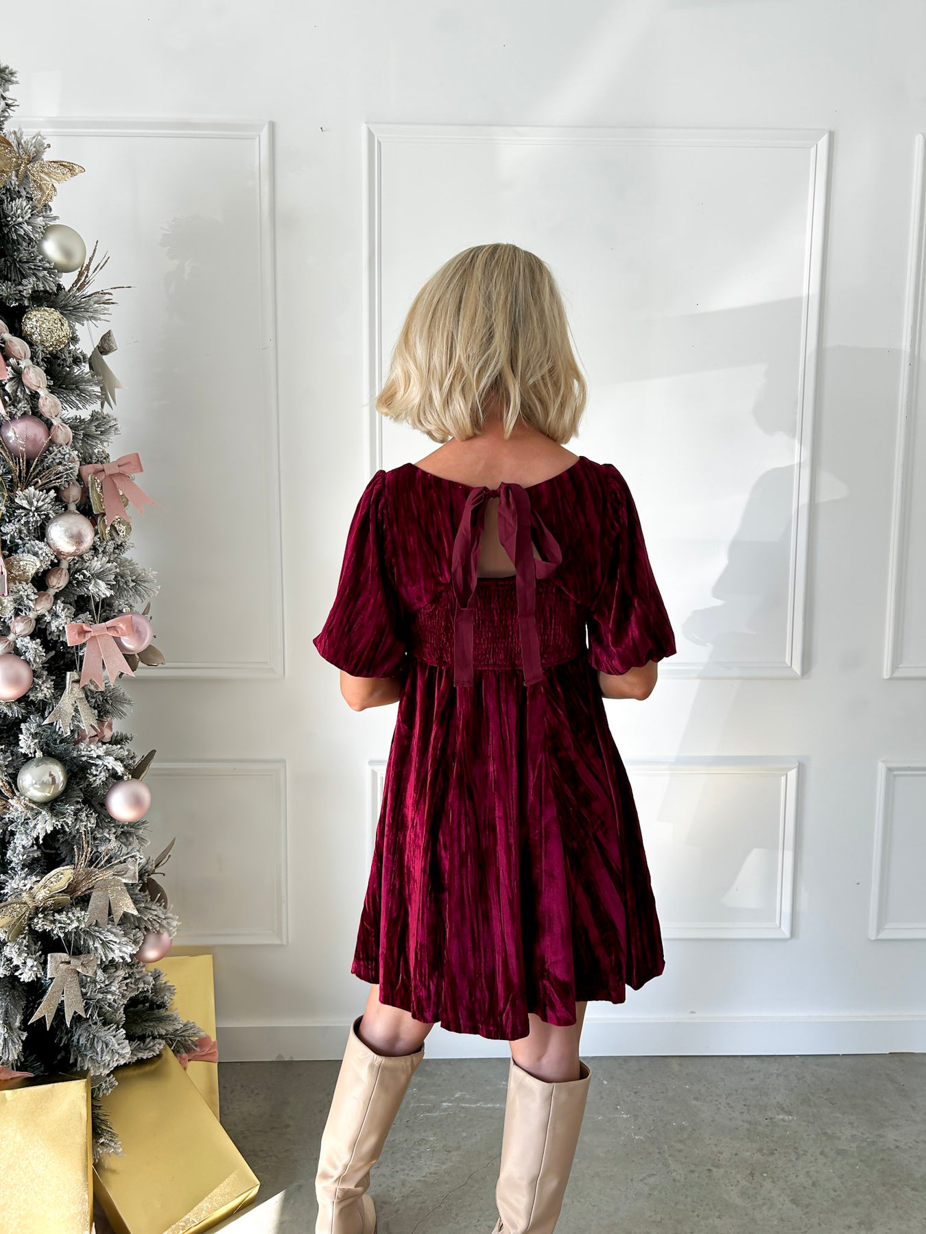 Crafted from rich textured velvet in a deep merlot hue, this dress features a gathered bust with delicate contrast ruffled accents and puff sleeves that add timeless elegance. The smocked back with a self-tie ribbon keyhole ensures a flattering fit, complemented by a hidden side zipper for seamless wear. Fully lined for comfort, this dress effortlessly combines classic sophistication with refined detail.
