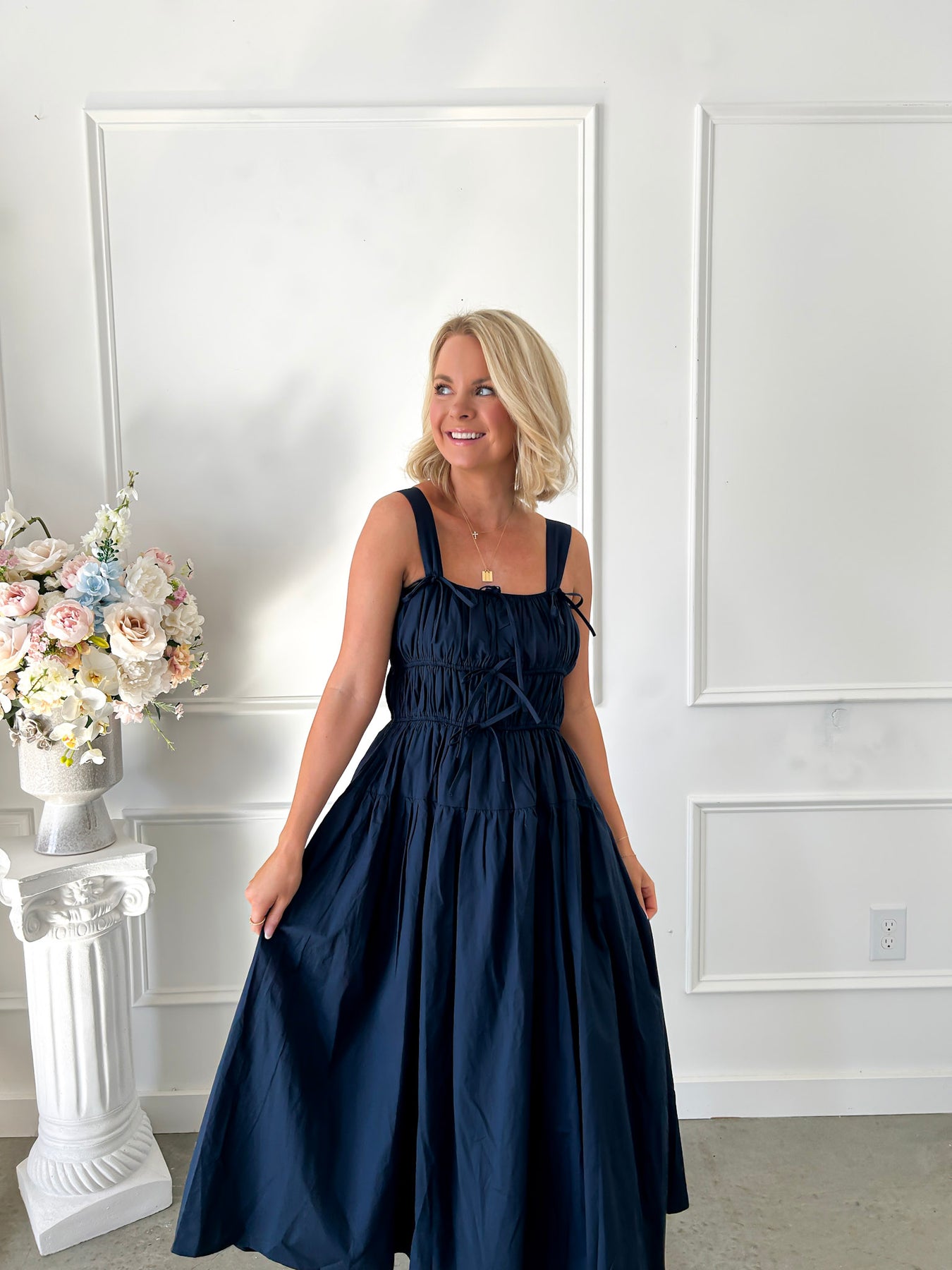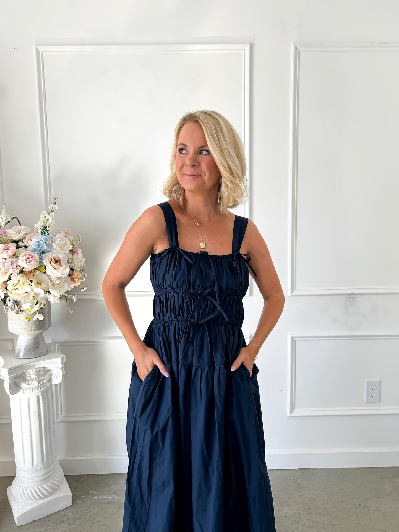 This navy midi dress blends casual ease with refined style, featuring an elasticated, smocked bodice adorned with charming bow details. Fully lined for comfort, it offers practical side seam floating pockets, making it a versatile fall staple that effortlessly balances sophistication with everyday wearability.