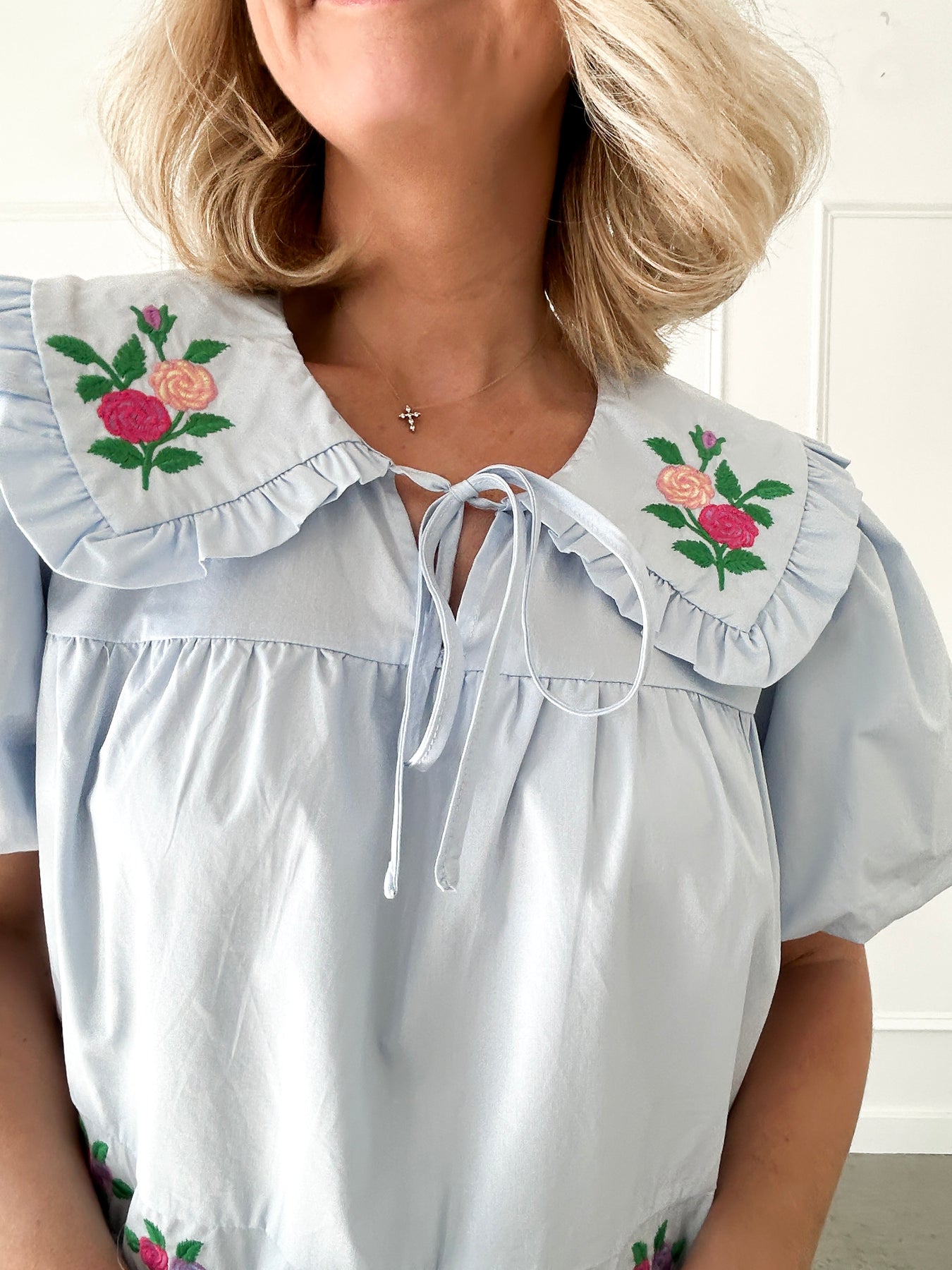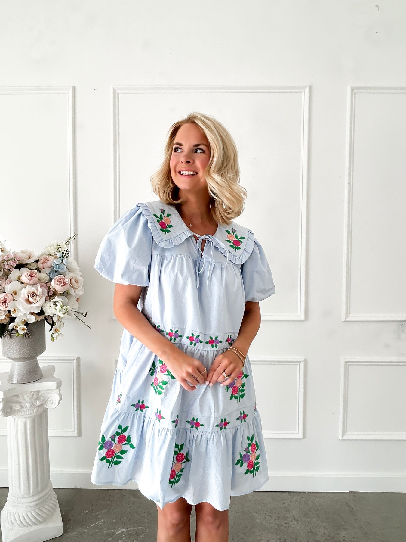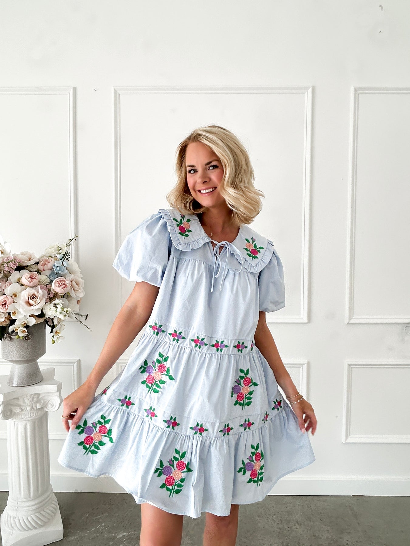 Step into a world of whimsy with this enchanting blue floral dress, where delicate embroidered blooms dance across the fabric. The charming Peter Pan collar adds a touch of vintage-inspired sweetness, while voluminous puff sleeves create a dreamy silhouette. Tiered layers build dimension and movement, perfect for twirling and celebrating your most playful moments. A girly essential that brings joy to every occasion.