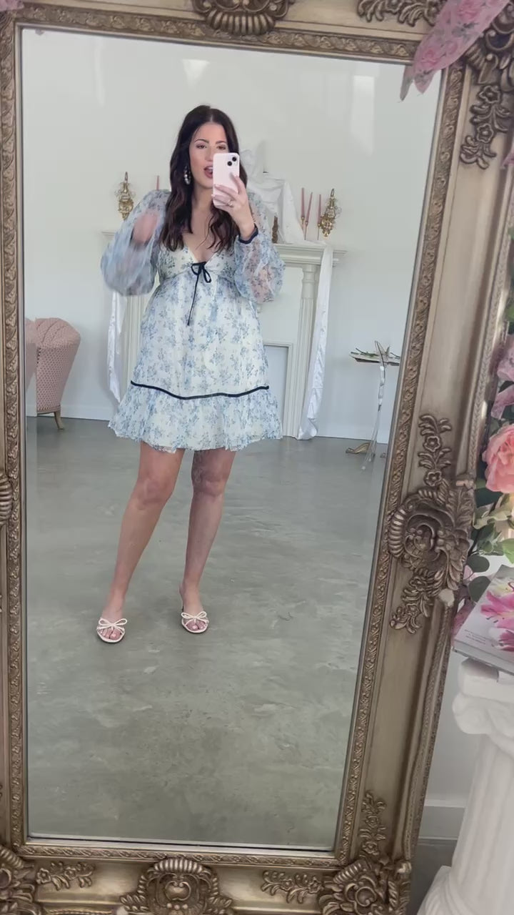This Out Of Love Blue Toile Mini Dress is perfect for spring weddings or upscale events. The blue toile fabric and sweetheart neckline add a touch of romance, while the bow detail and sheer sleeves give it a girly feel. Be ready to turn heads in this dress that is both elegant and charming.