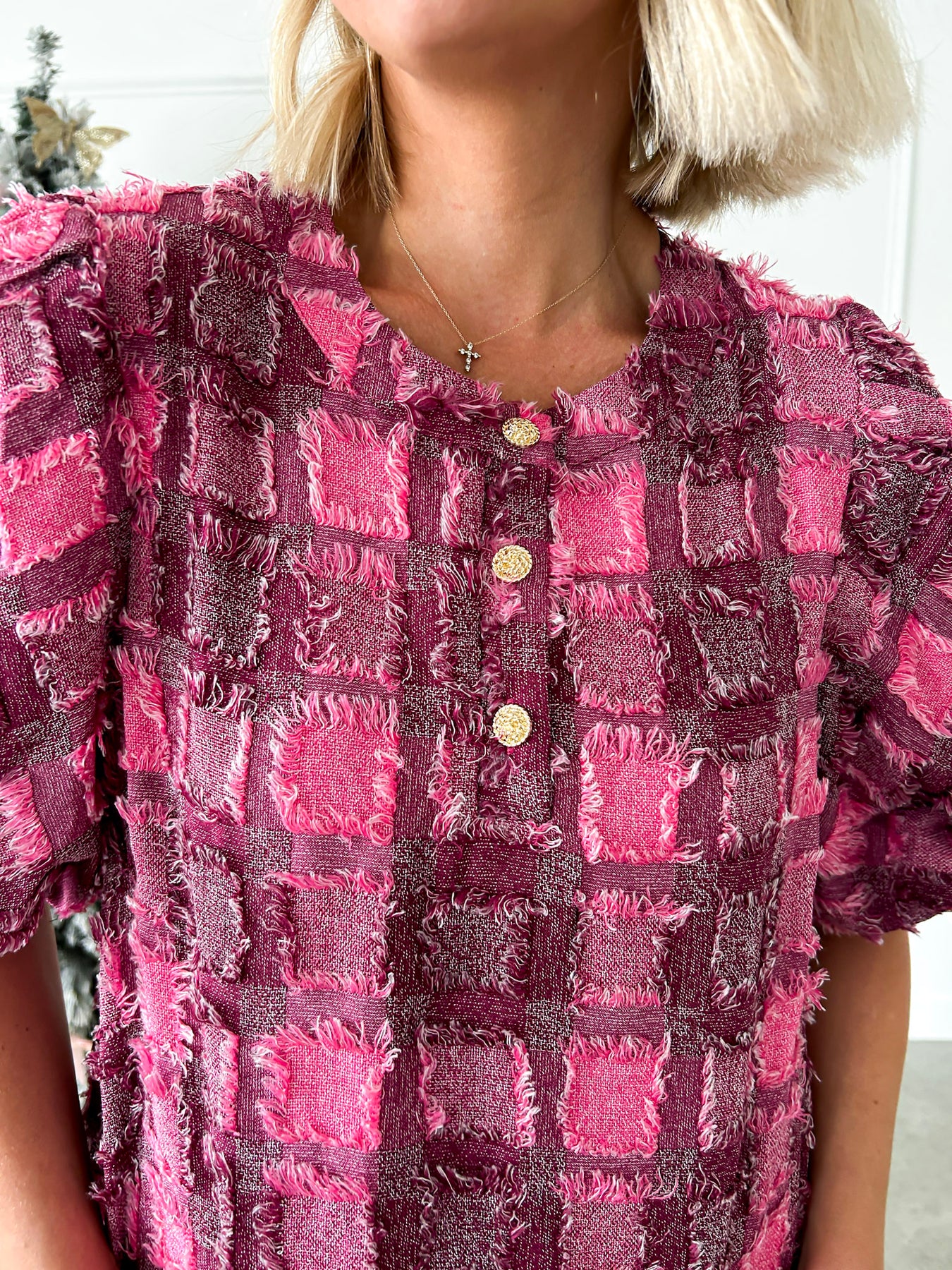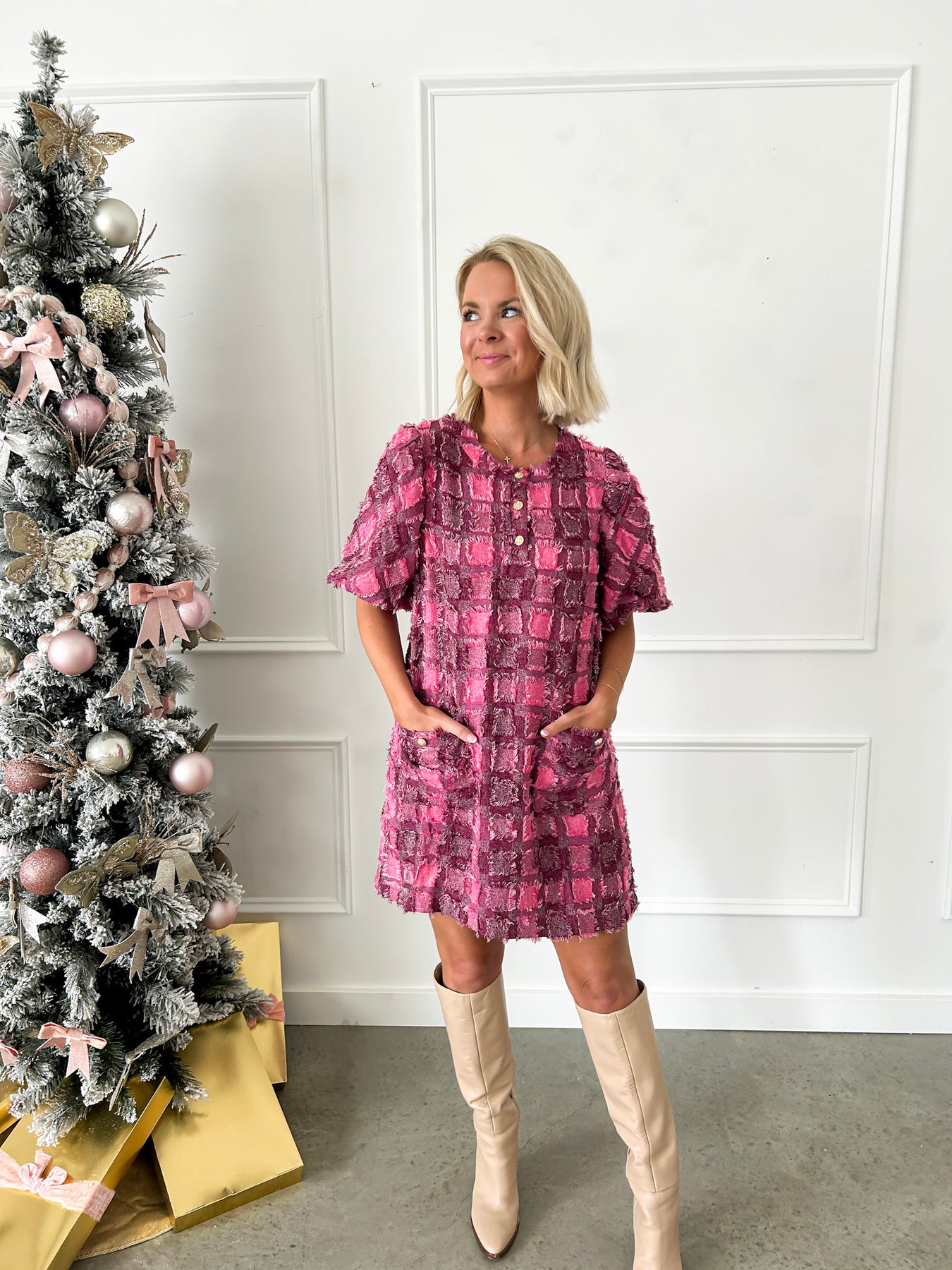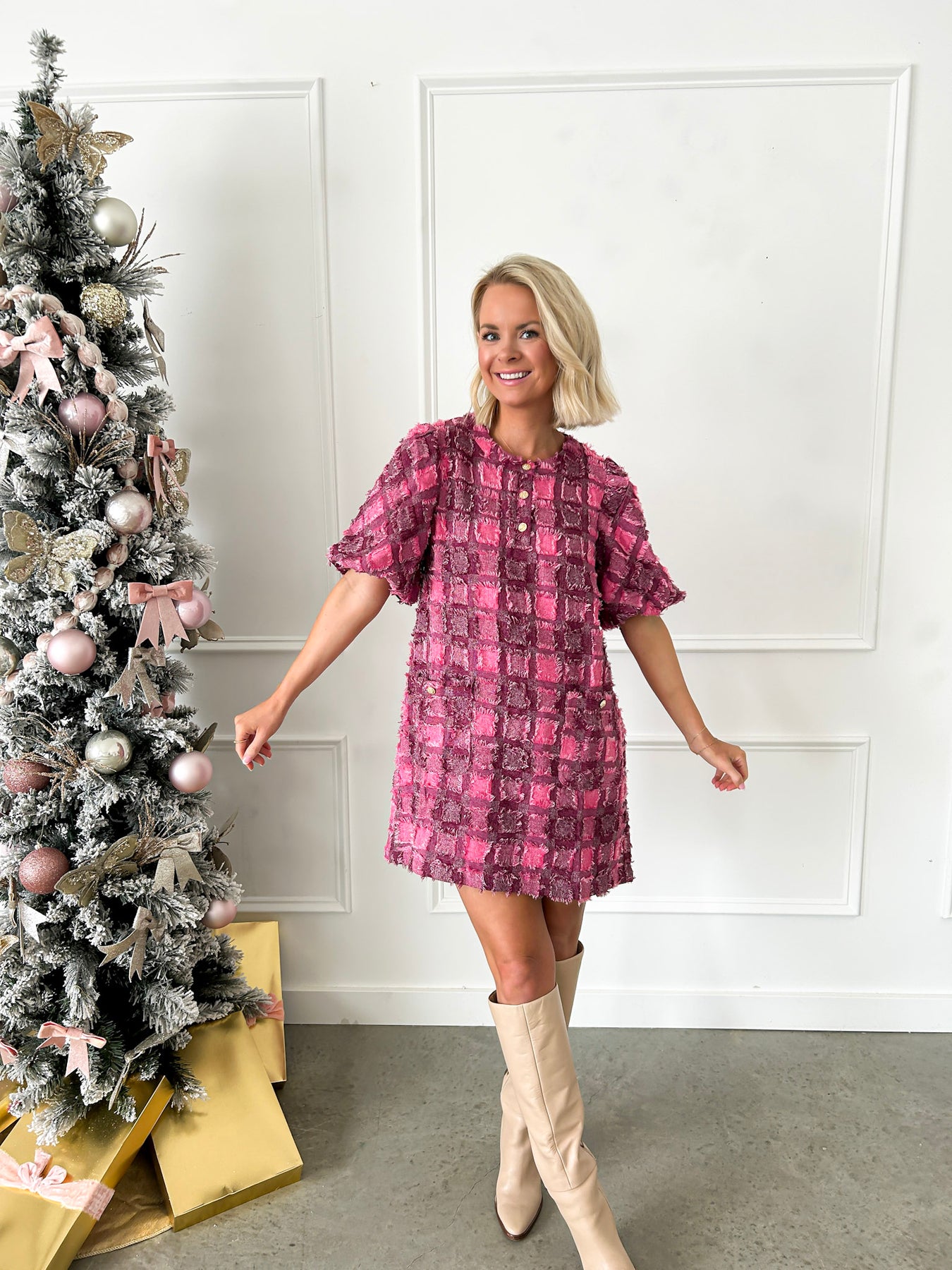 Celebrate the season in vibrant style with the Under Twinkling Lights Magenta Fringe Dress. Featuring playful puff sleeves, eye-catching gold buttons down the bust, and a lively magenta plaid pattern, this dress offers a fresh take on holiday attire. Its fun jewel tone and fringe details make it the perfect choice for standing out at any festive gathering—without the usual holiday colors. Shine bright and dance the night away in this irresistibly cute holiday dress.