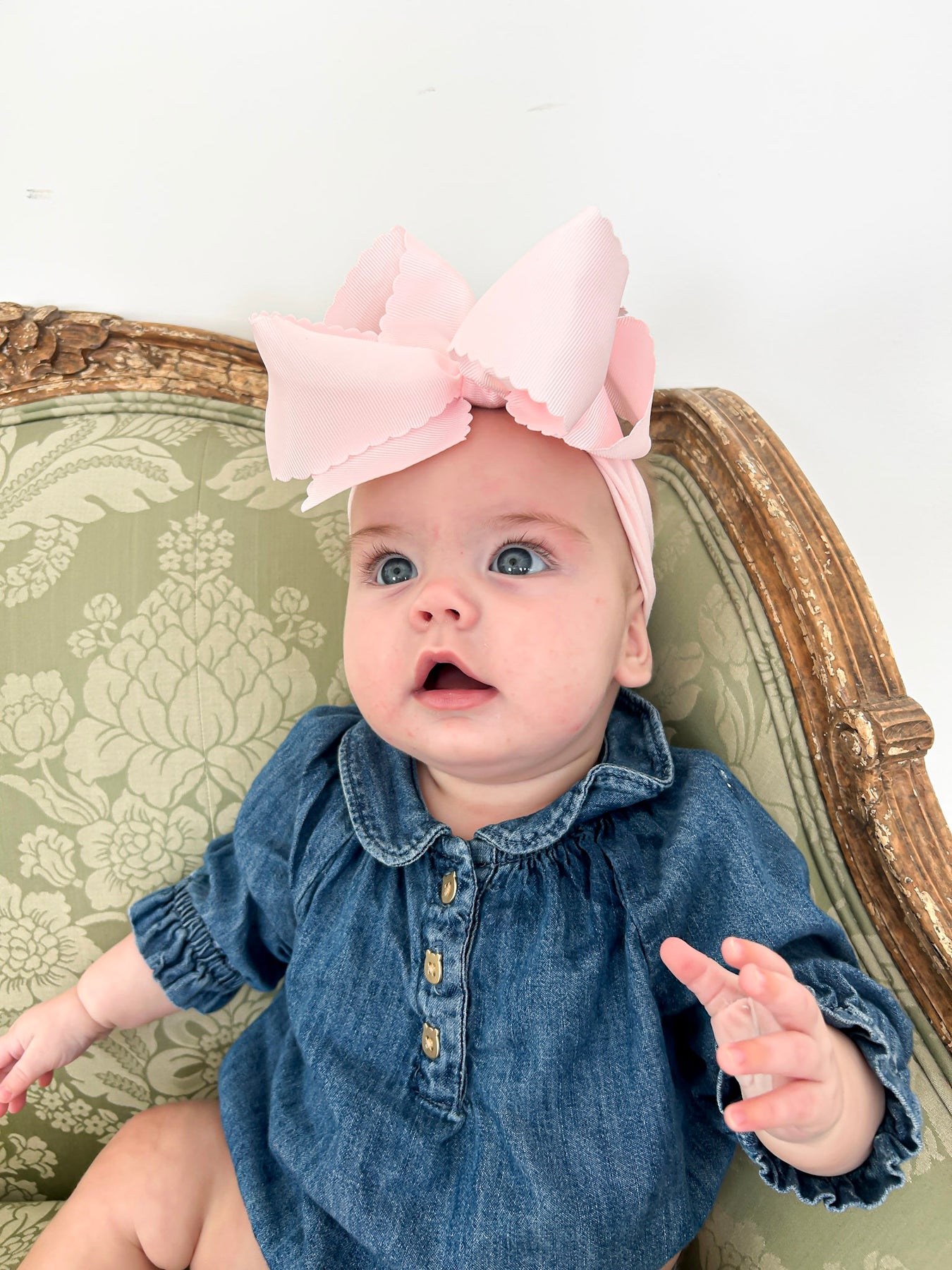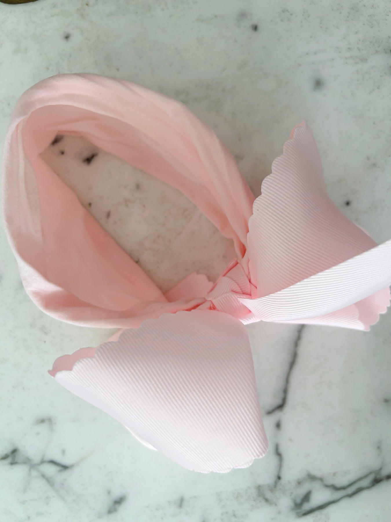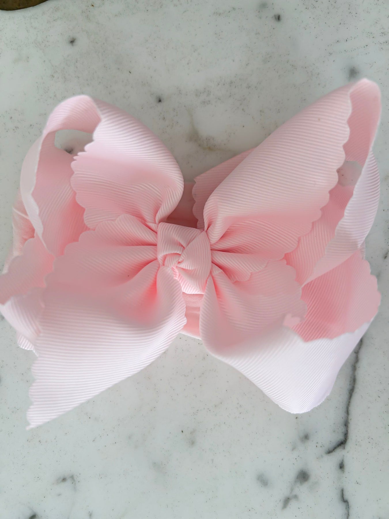 Add a touch of fun to your look with this powder pink headband featuring a wide band for comfy wear and an eye-catching 5.5-inch scalloped edge bow. Perfect for adding playful charm to any outfit while keeping hair neatly in place. Bow does not detach.