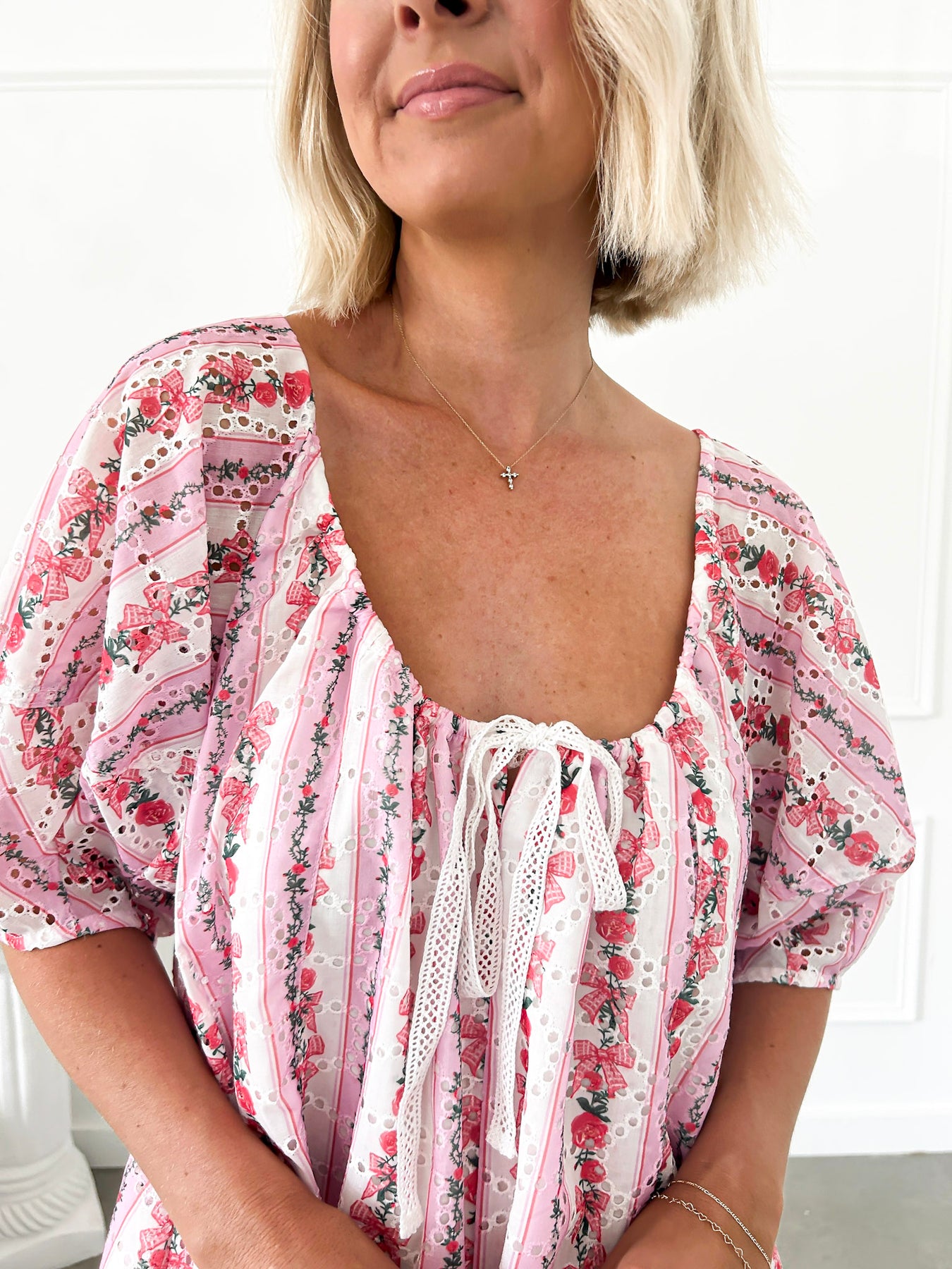 Introducing our Pretty As A Petal Floral Bow Romper  - the perfect mix of girly and fun. Made from eyelet material with a cute bow detail at the bust, this romper is versatile for any occasion. Dress it up for a girl's night or stay comfy while chasing after your kids.