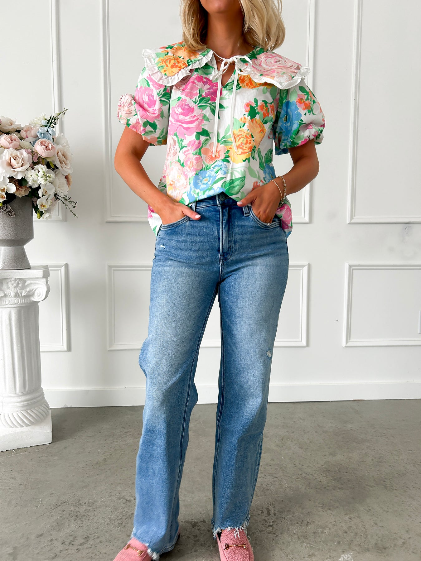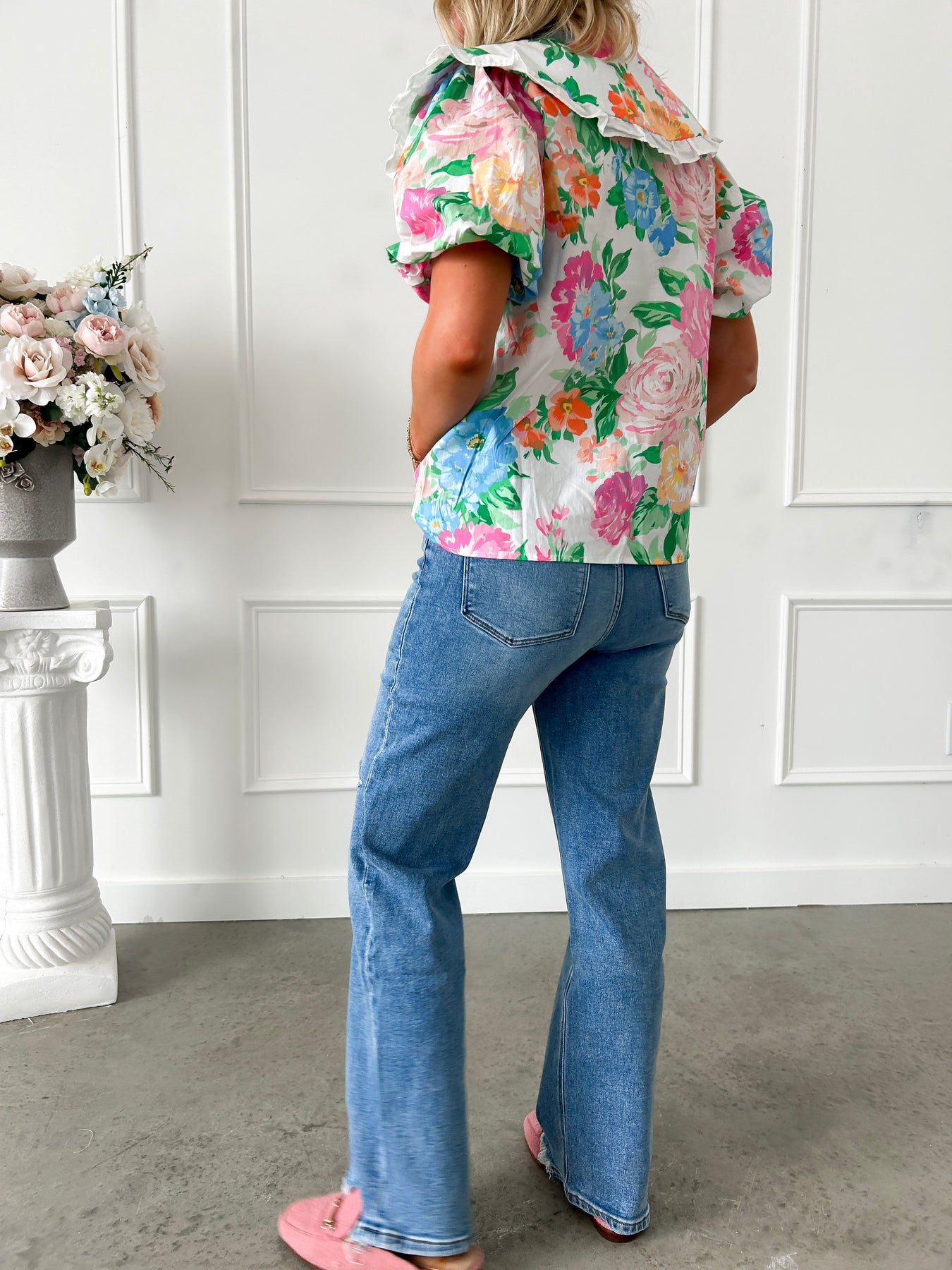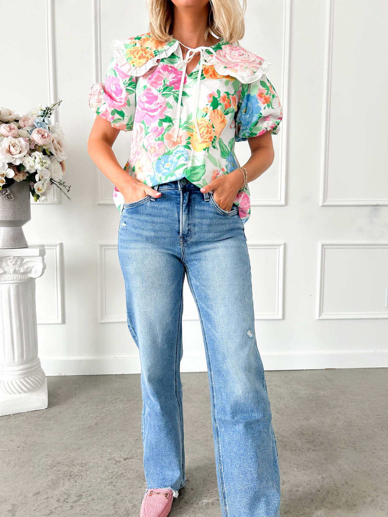Elevate your denim collection with these high-rise wide-leg jeans designed for modern comfort and style. Crafted from soft comfort stretch denim, they feature a flattering high-rise waist and a slim-wide silhouette that balances contemporary trends with wearability. The medium light wash pairs beautifully with the distressed hem detail at the front, adding an effortless edge. Complete with functional five-pocket styling and full-length cut, these jeans transition seamlessly from casual days to night-out ready looks.