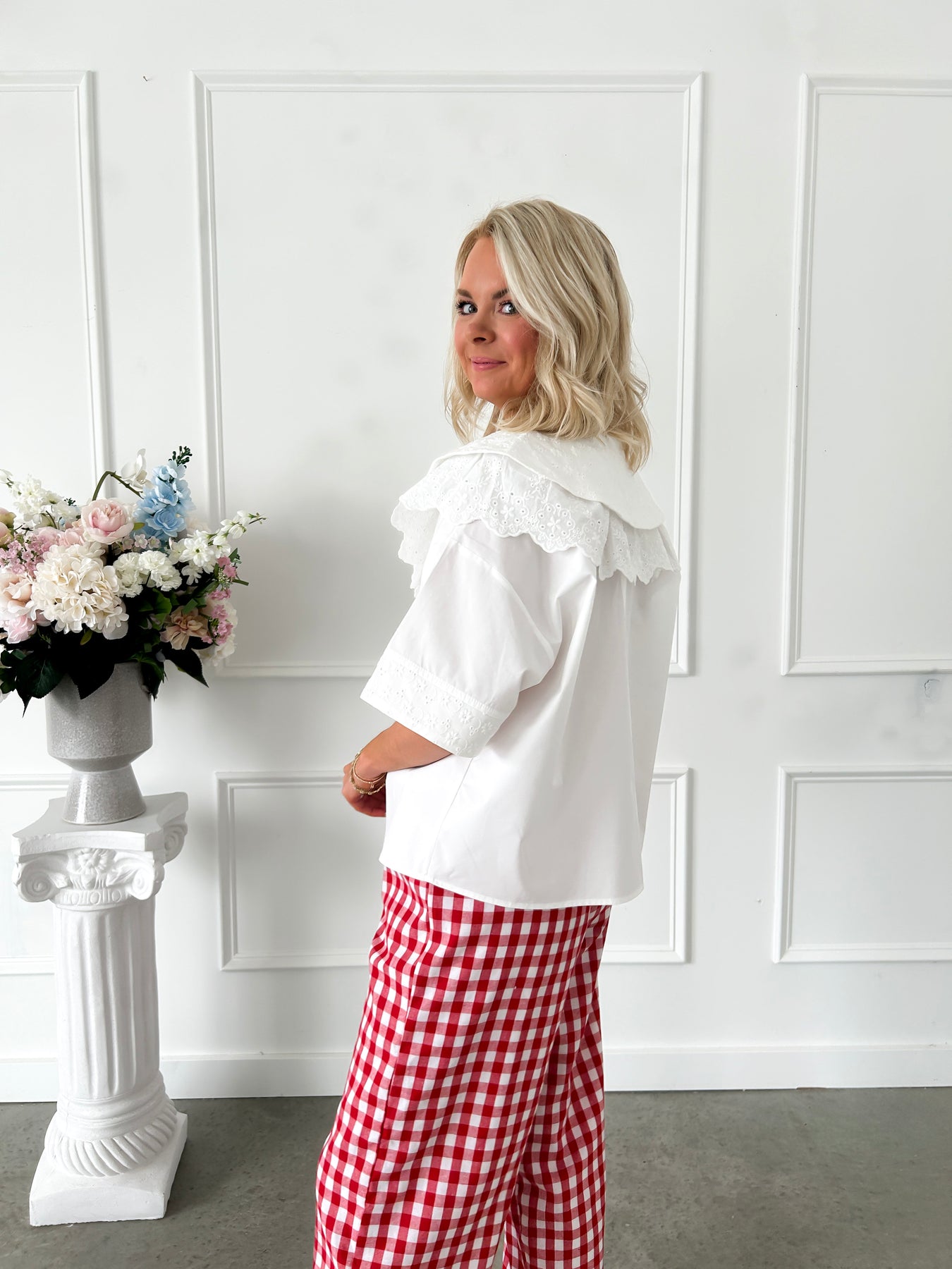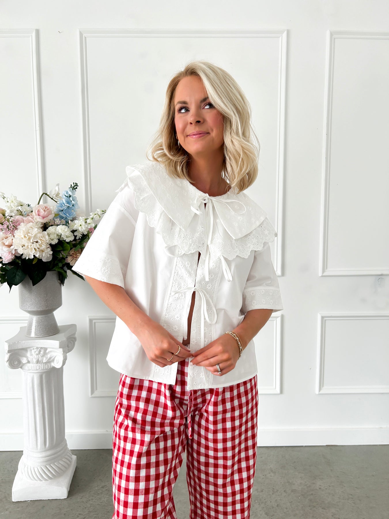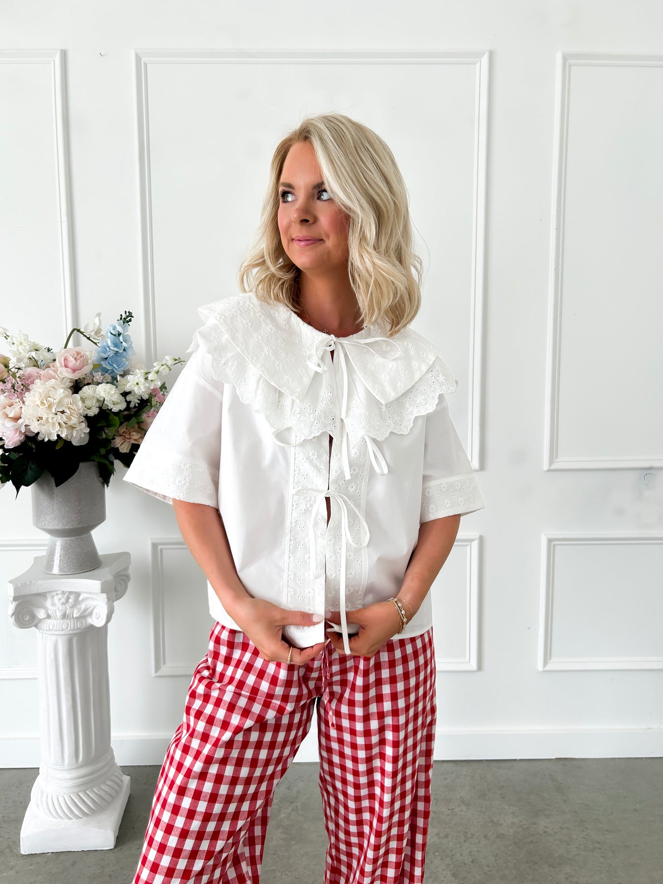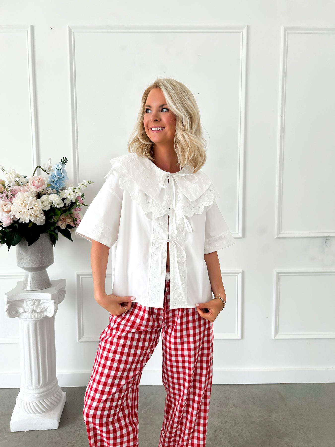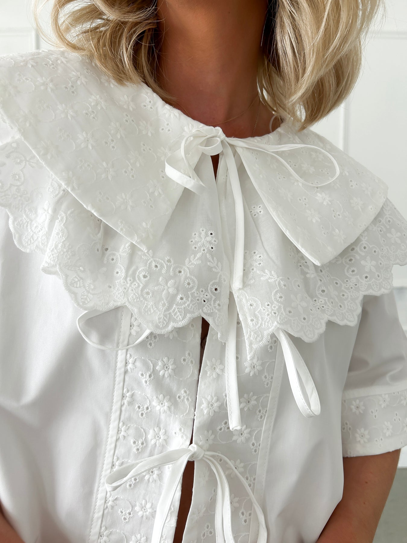 Embrace effortless elegance with this chic oversized collar eyelet blouse. Crafted in crisp white with delicate eyelet detailing, it features a self-tie front that lets you customize the fit to your style. The generous collar adds a girly, romantic touch perfect for dressing up or down. A versatile wardrobe essential that transitions seamlessly from casual days to special occasions.