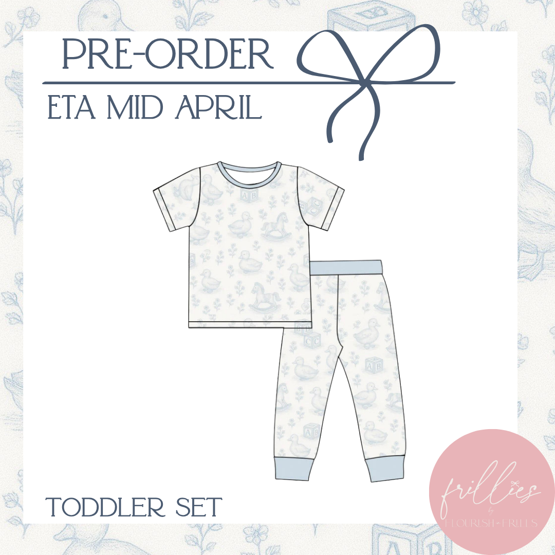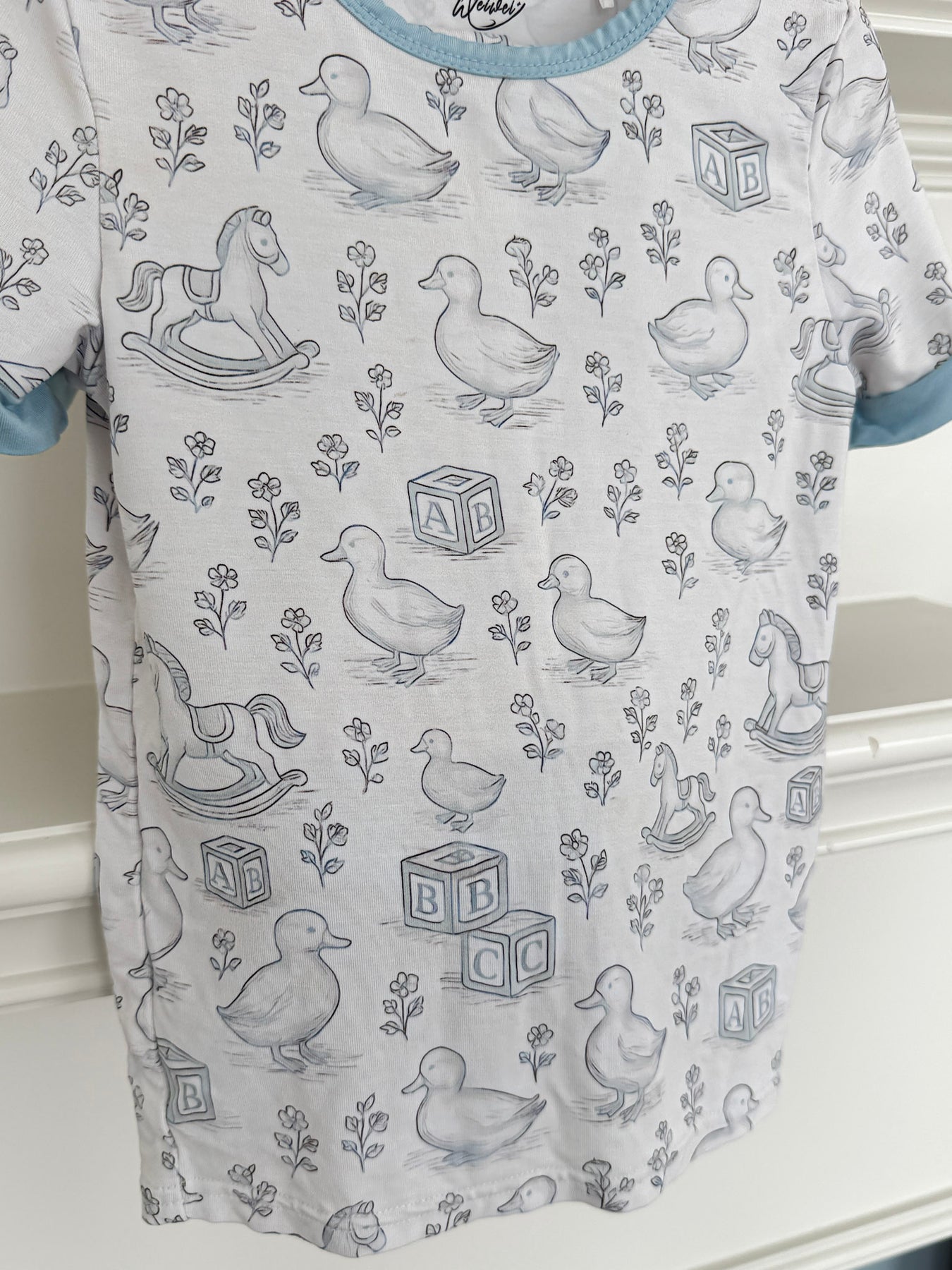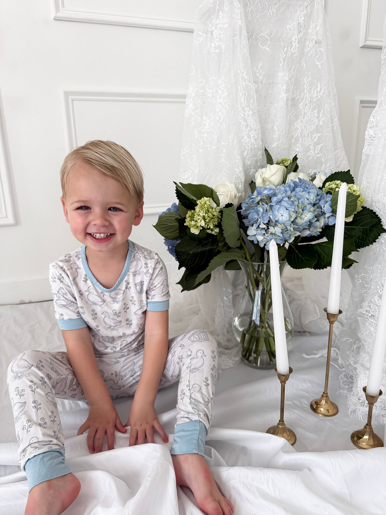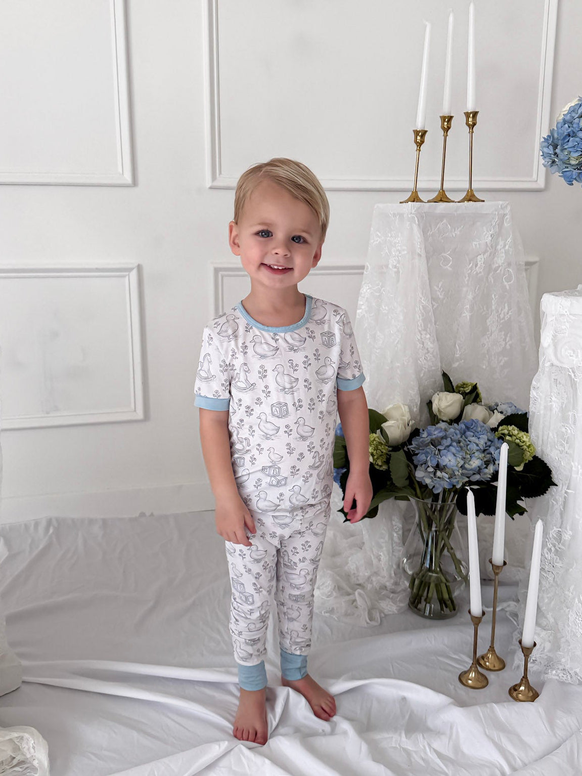Hop into bedtime with these charming toddler boy pants featuring a delightful blue rocking horse, ducks, and blocks print that sparks imagination. Soft and comfortable with an elastic waistband for easy dressing, these Little Traditions pants are perfect for active little ones. The cheerful blue trim adds a polished touch to this must-have wardrobe staple.