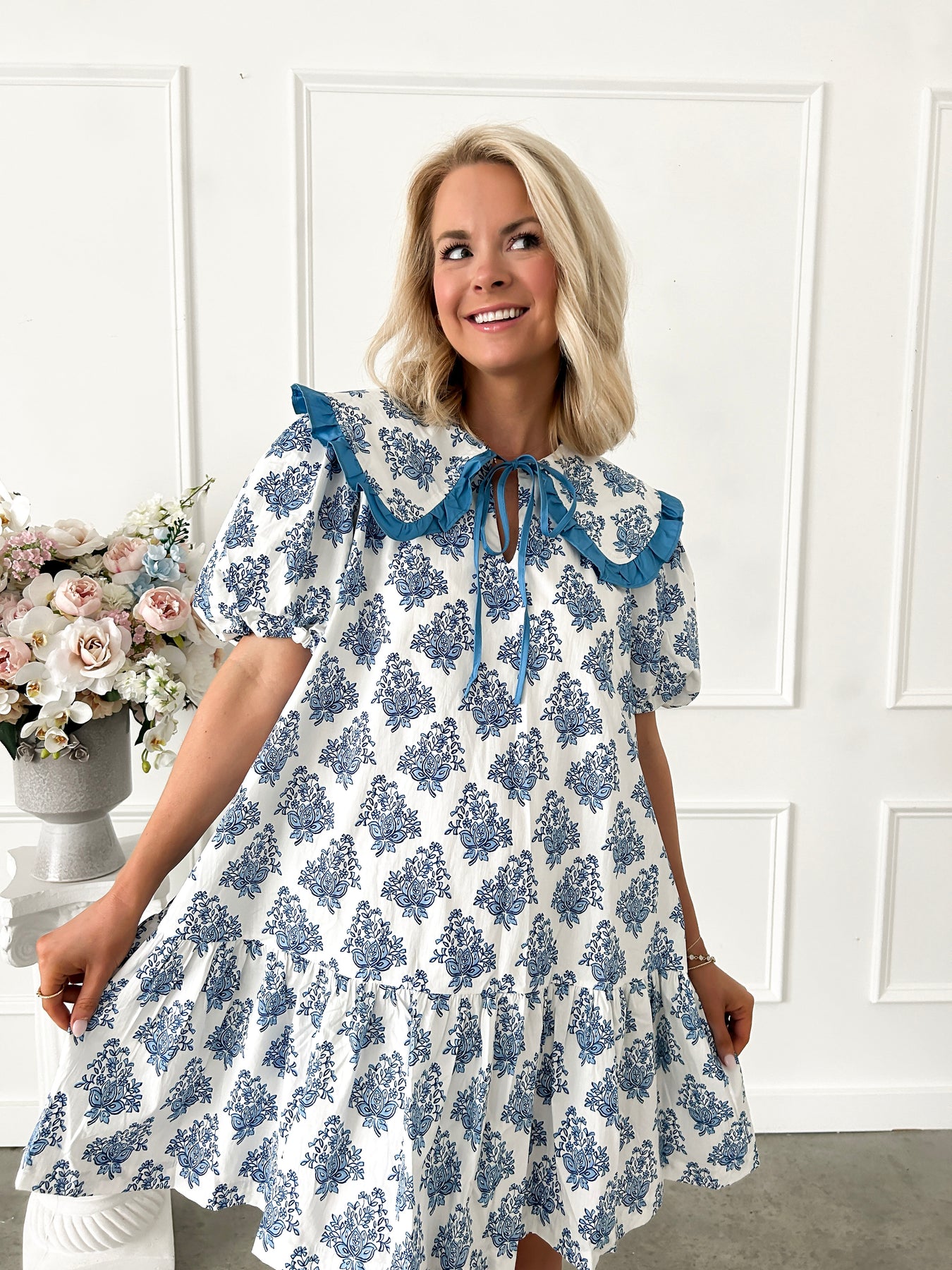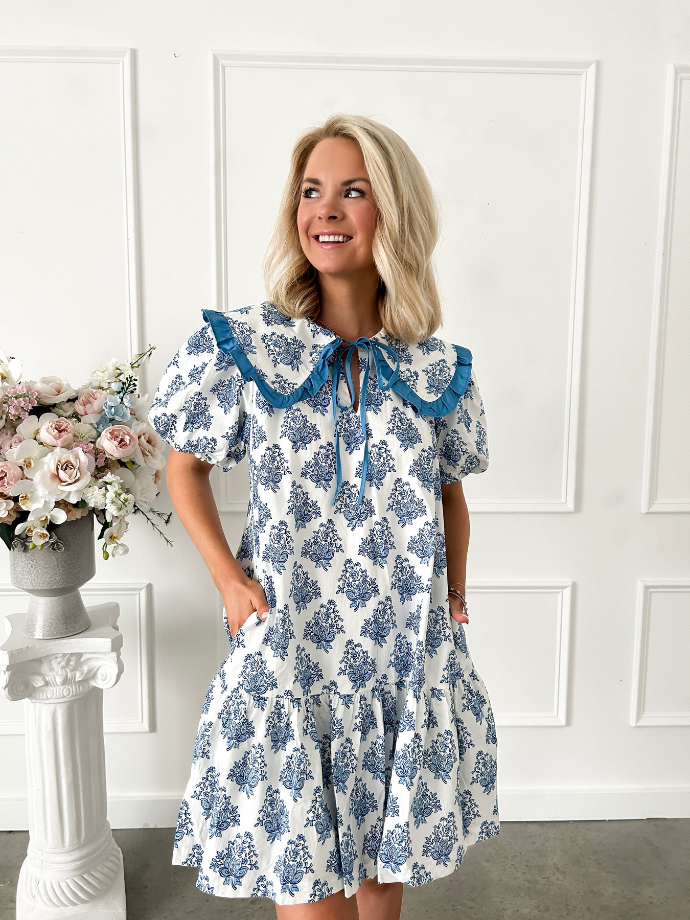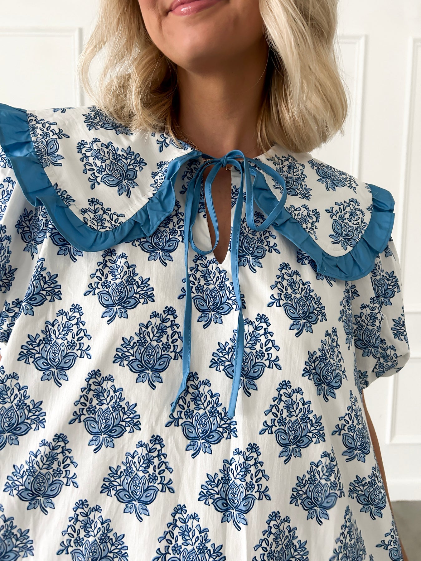 Embrace timeless elegance with this charming blue and white Ajrak print cotton mini dress. Featuring a delicate Peter Pan collar that adds a whimsical, sophisticated touch, this piece effortlessly blends traditional craftsmanship with contemporary style. The breathable cotton fabric ensures comfort throughout the day, while the classic print brings visual interest and versatility to your wardrobe. Perfect for casual outings or dressed-up occasions, this chic mini dress is a wardrobe essential that celebrates both comfort and refined taste.