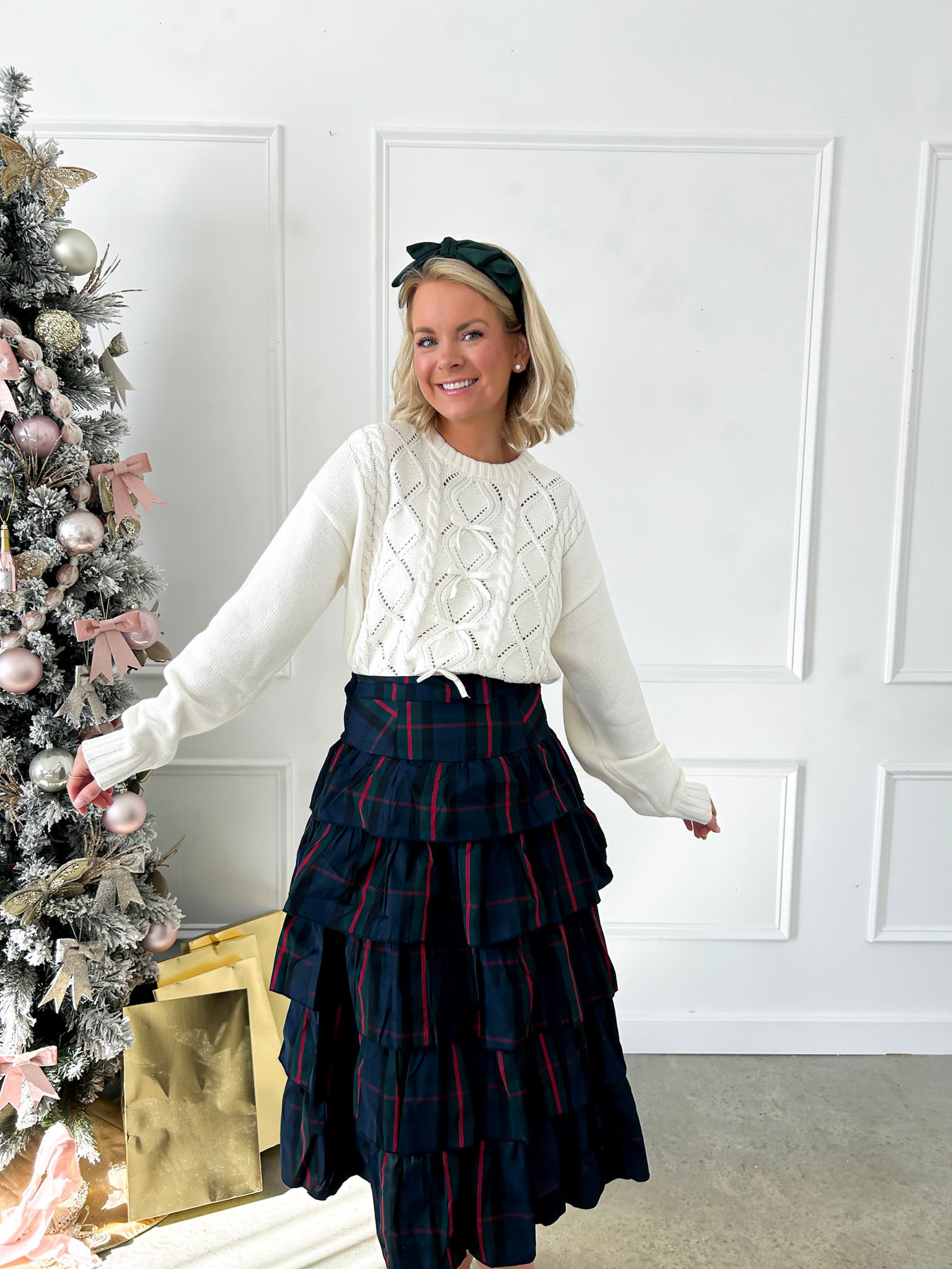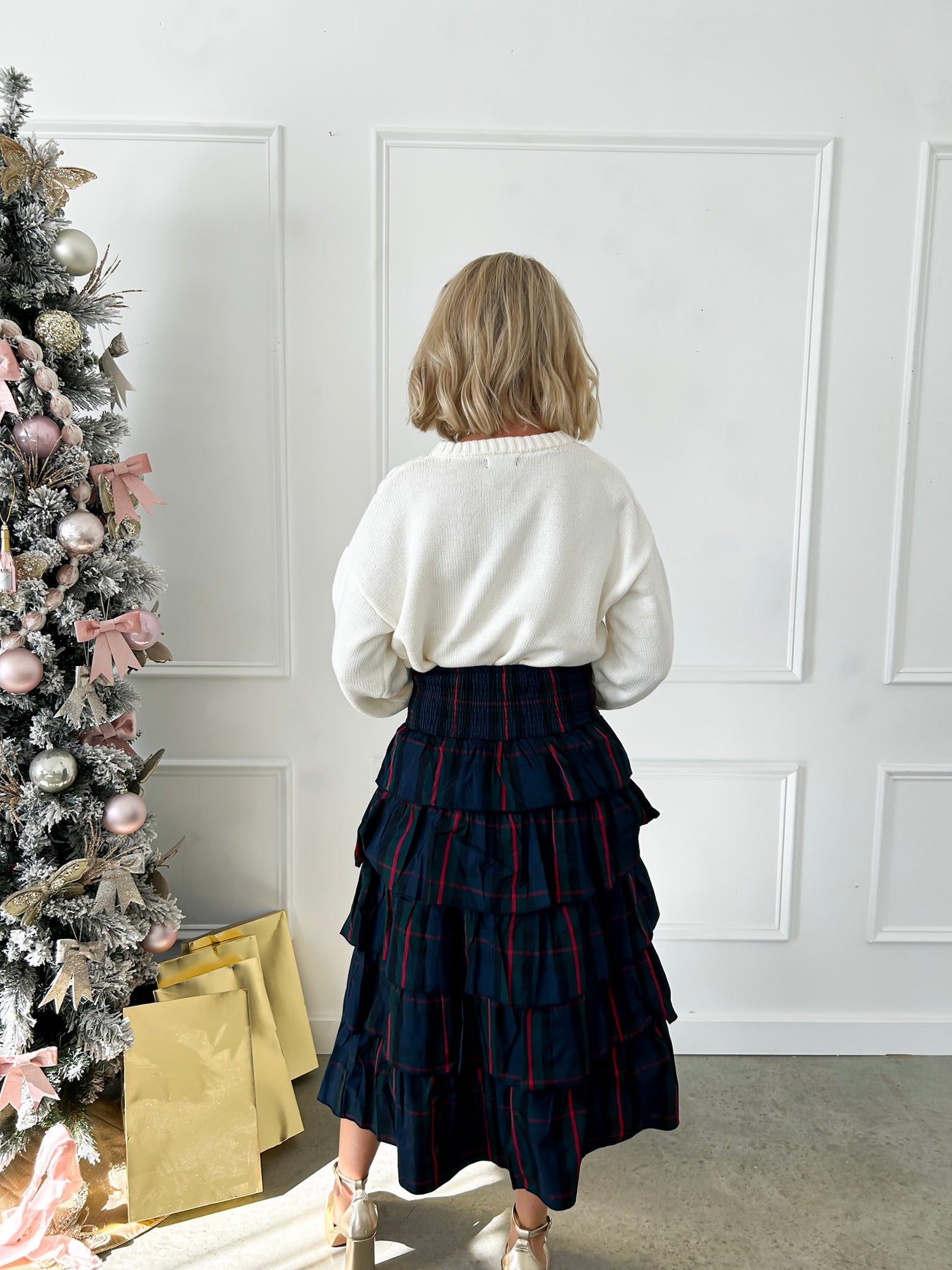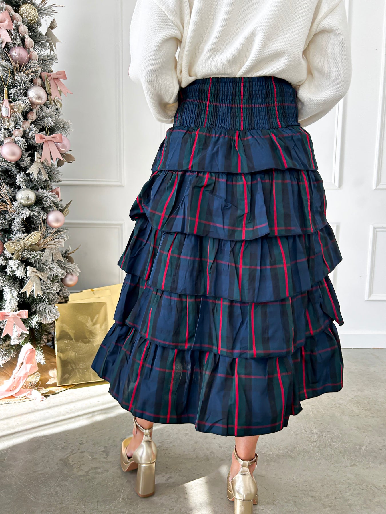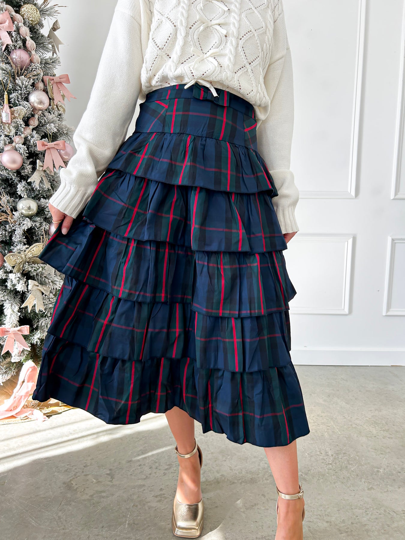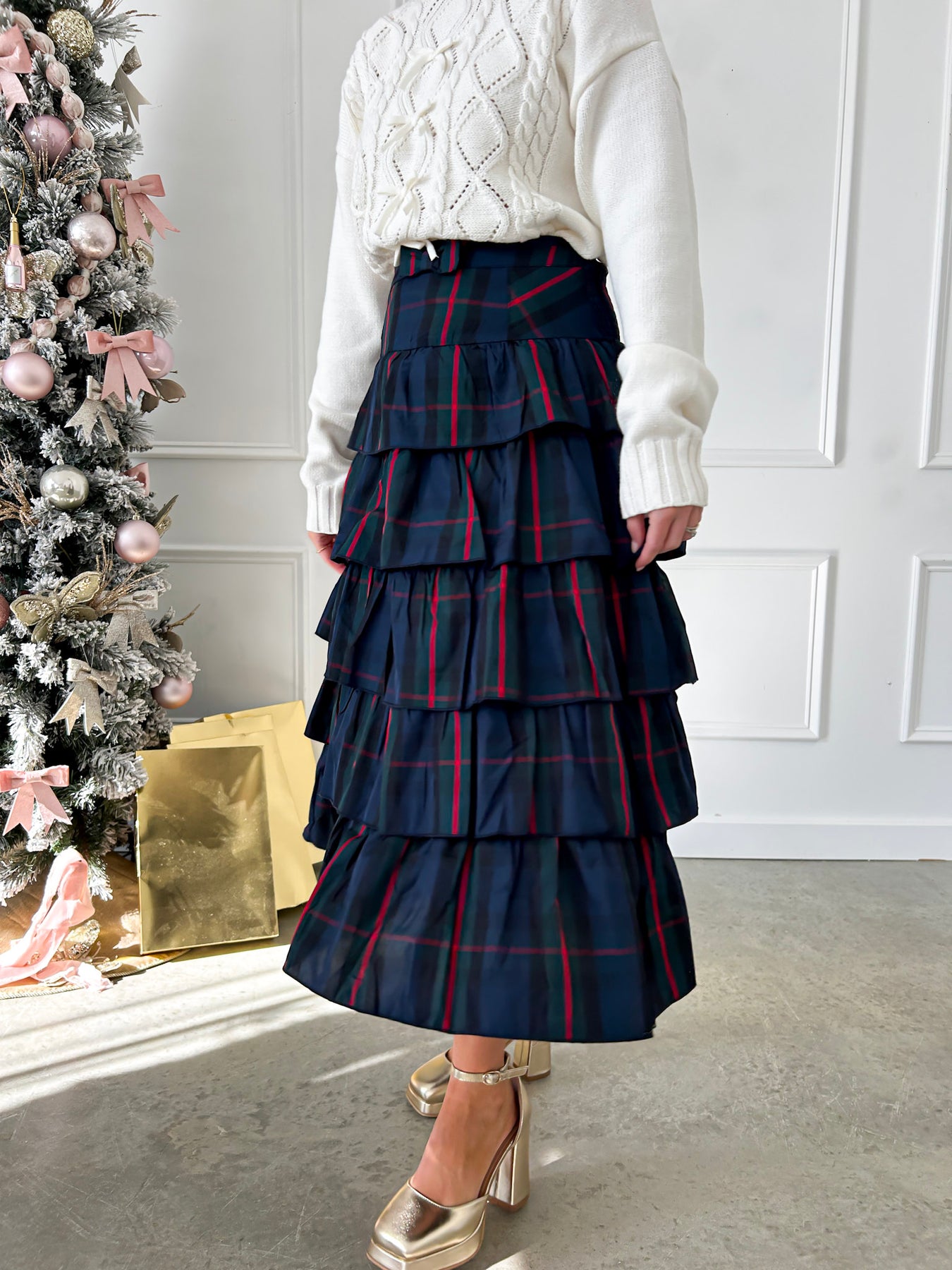 Twirl into joy with this navy-blue midi skirt that's bursting with personality! Featuring vibrant red and green stripes across multiple ruffled tiers, this high-waisted flared beauty delivers instant charm. The lightweight fabric keeps you comfortable all day, while the adorable bow detail at the waistband adds that extra touch of whimsy. Perfect for anyone who loves a skirt that makes a statement—playful, feminine, and utterly delightful.