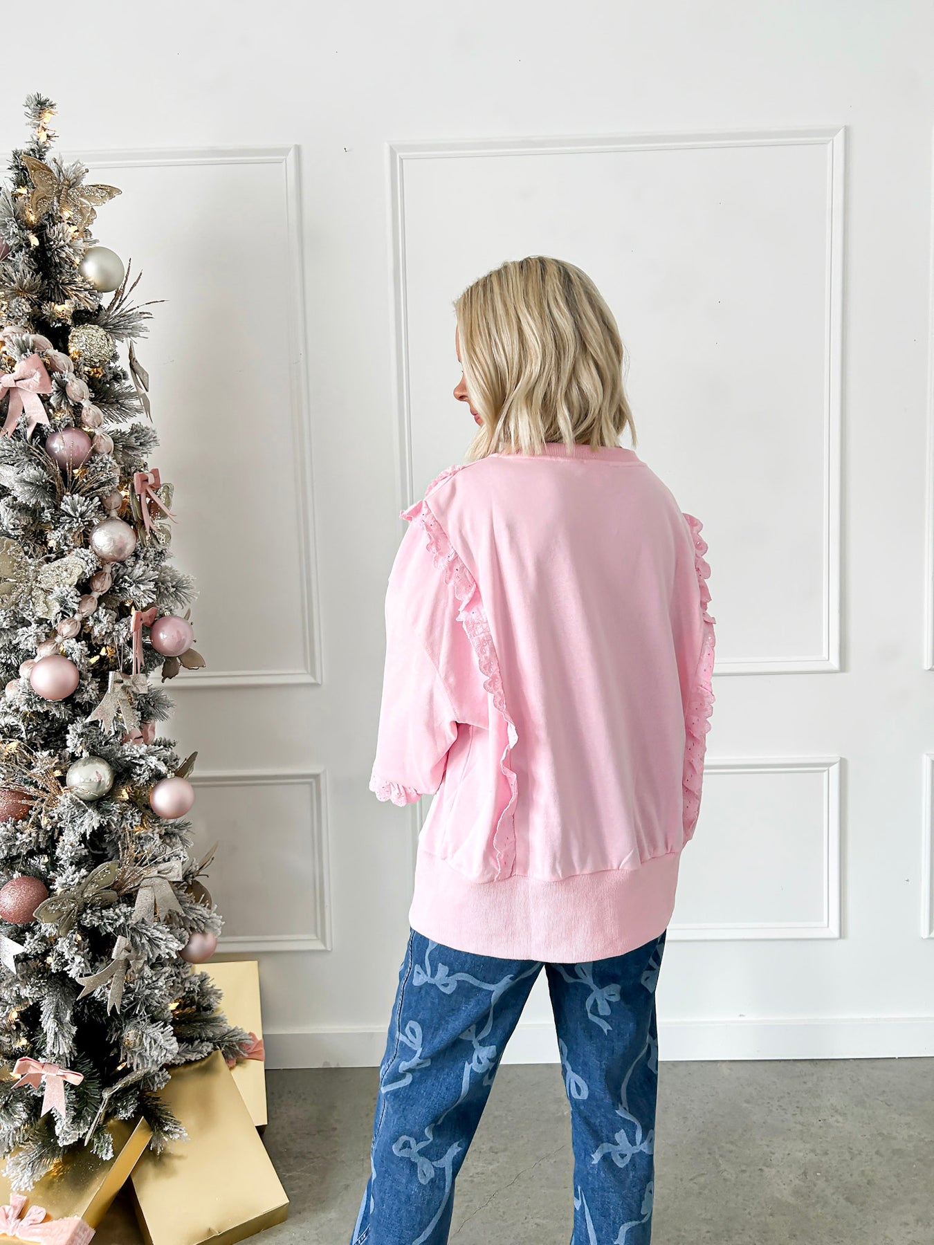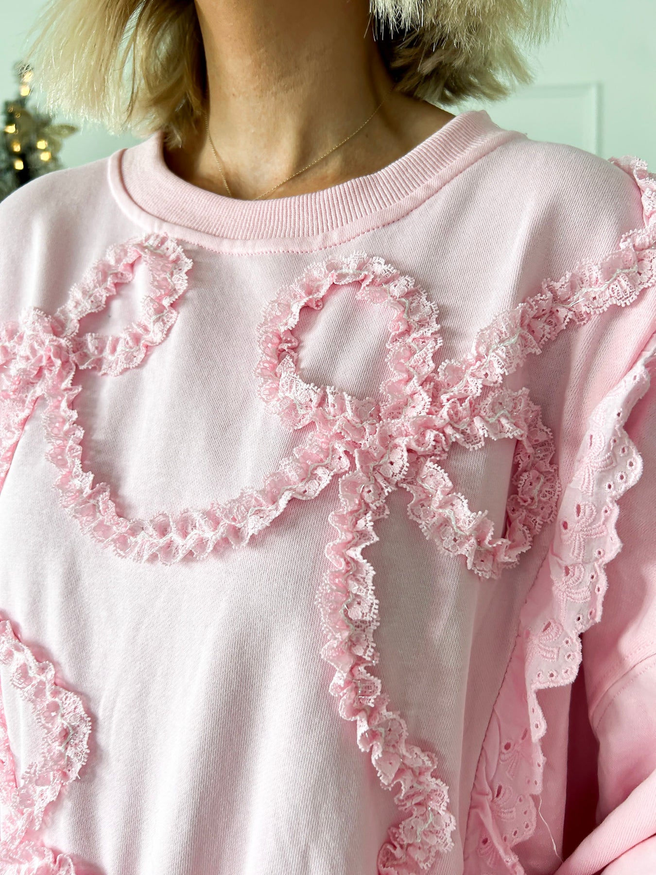 Add a playful twist to your cozy wardrobe with the Bow Please Pink Lace Sweatshirt. This relaxed-fit top features a classic crew neckline and charming eyelet lace bows across the front that brighten every look. Puffy sleeves with shirred cuffs create a fun, flirty shape, while delicate lace trim along the sleeves and shoulders adds a whimsical touch. Perfect for those who love comfort with a dash of sweet style.