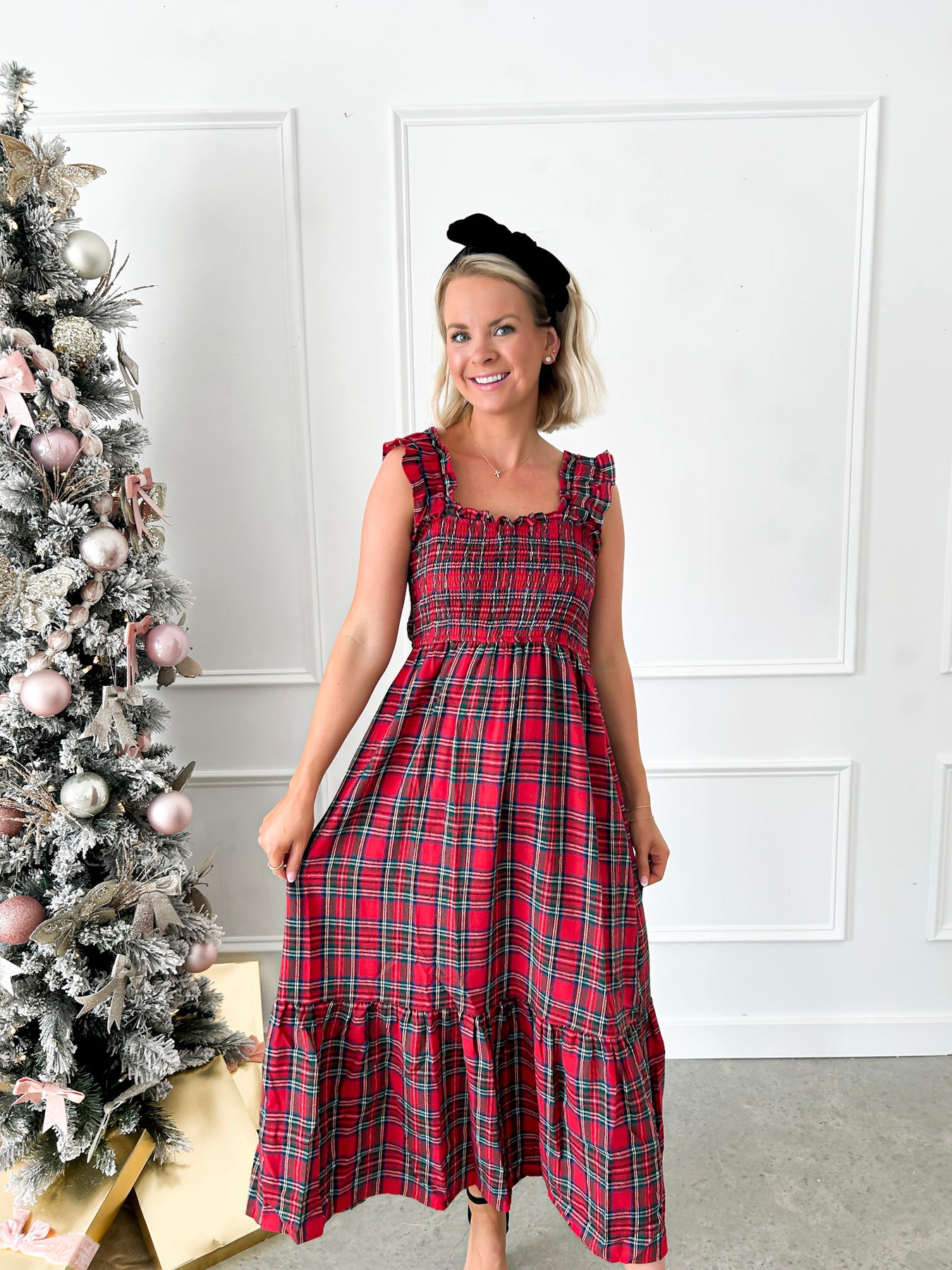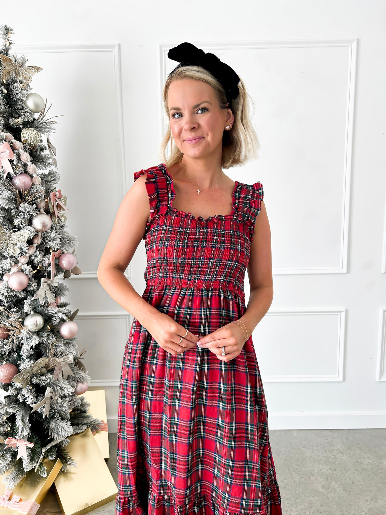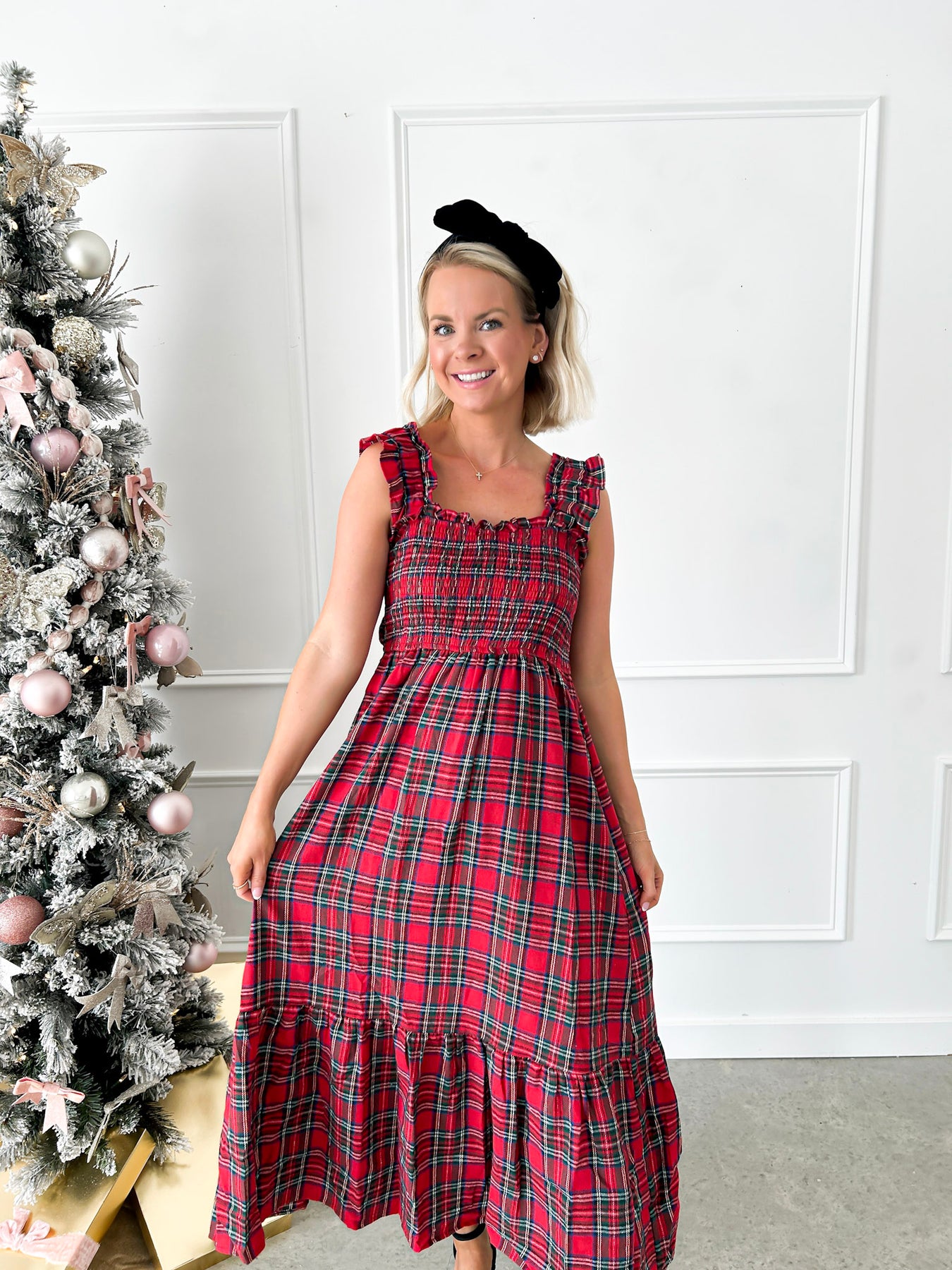 Celebrate the season in style with the Checked Twice Red Plaid Midi Dress. This playful holiday favorite features a comfy smocked bodice that hugs just right, paired with a flirty ruffle hem that moves with every twirl. Its vibrant red plaid makes it the perfect festive choice for Christmas parties and joyful gatherings.