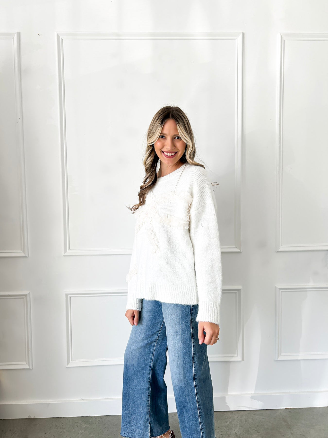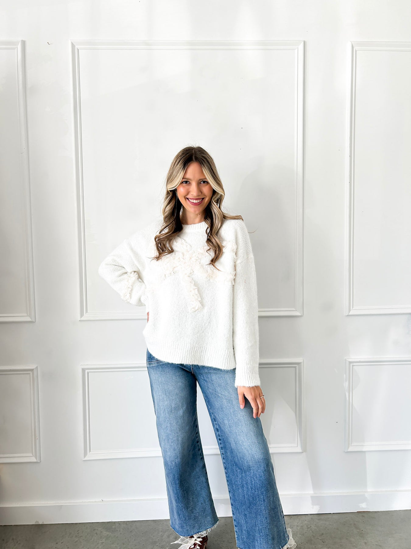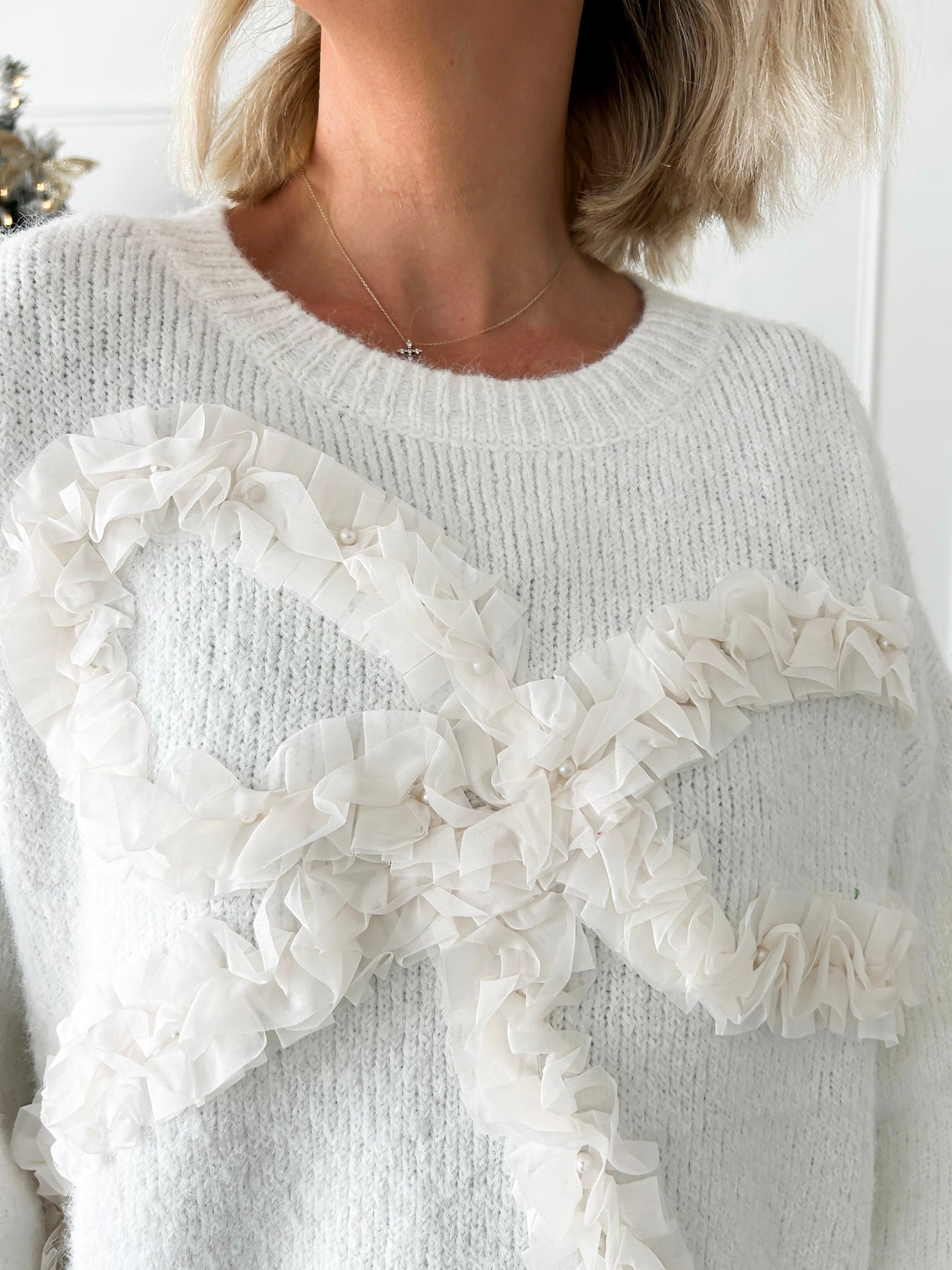 Wrap yourself in cozy charm with this creamy ivory knit sweater, featuring an adorable bow applique on the front. Perfect for chilly days, its soft knit keeps you snug while the playful bow adds a feminine touch that brightens any outfit. Embrace warmth with a side of sweetness!