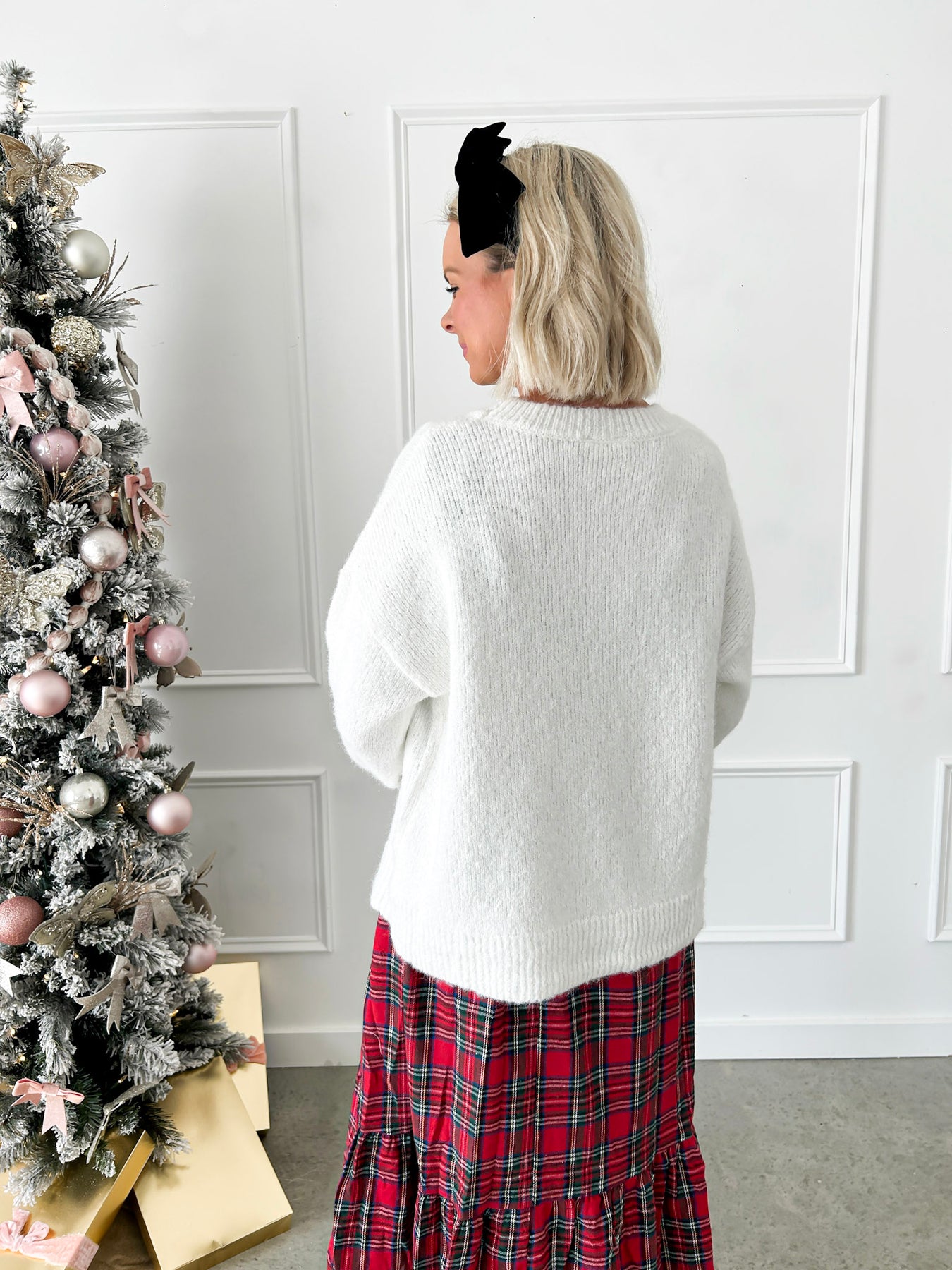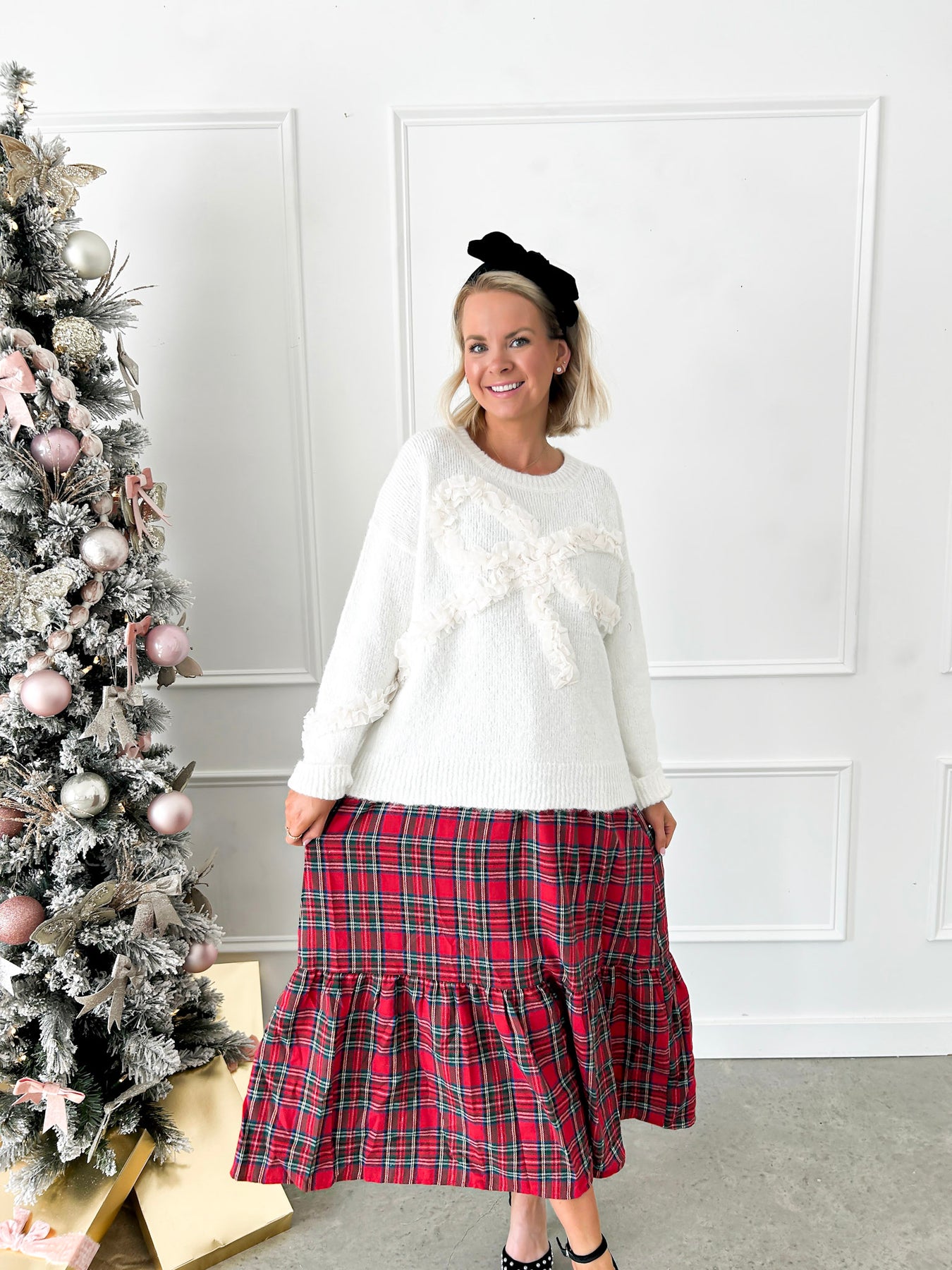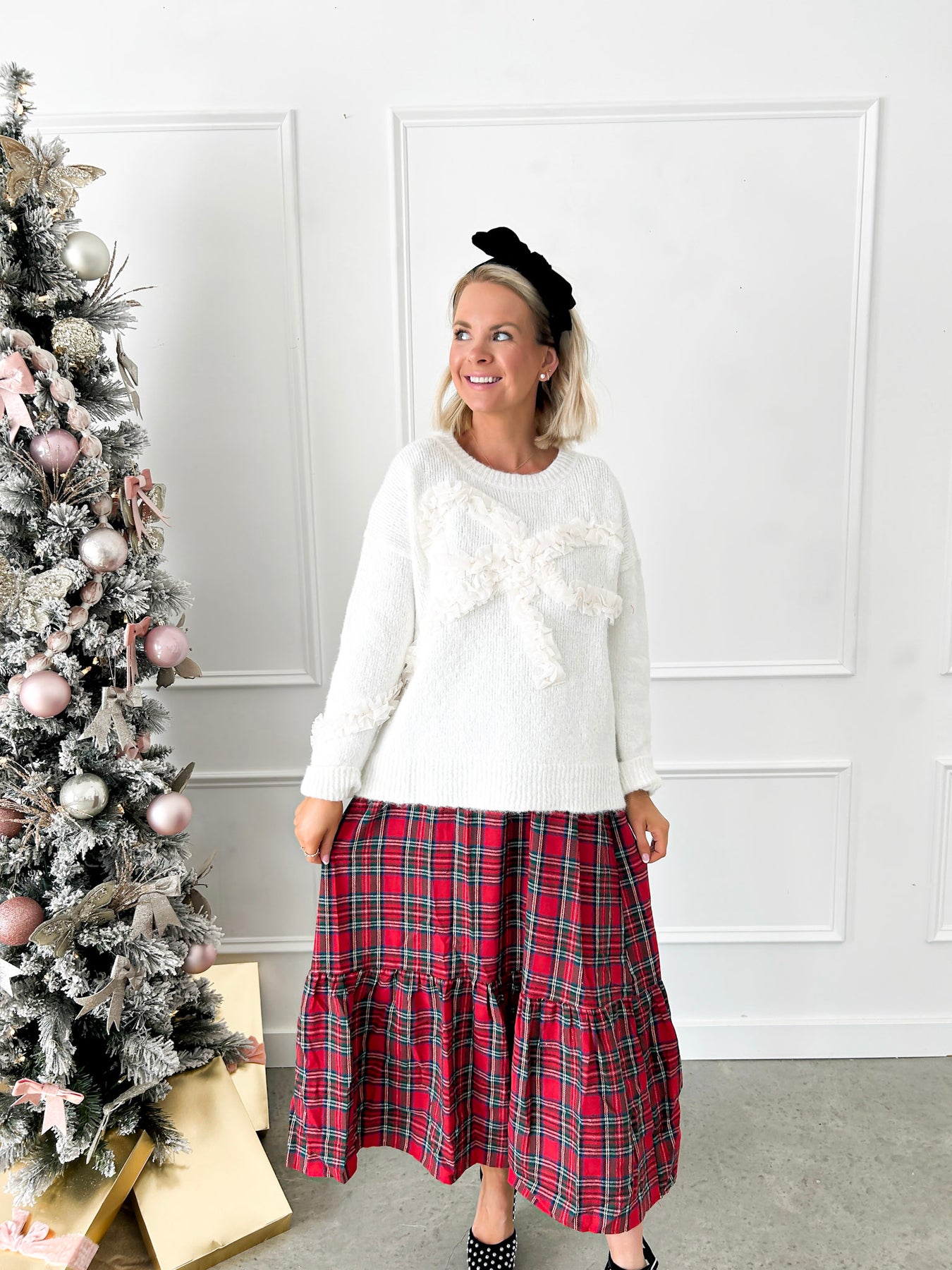 Wrap yourself in cozy charm with this creamy ivory knit sweater, featuring an adorable bow applique on the front. Perfect for chilly days, its soft knit keeps you snug while the playful bow adds a feminine touch that brightens any outfit. Embrace warmth with a side of sweetness!