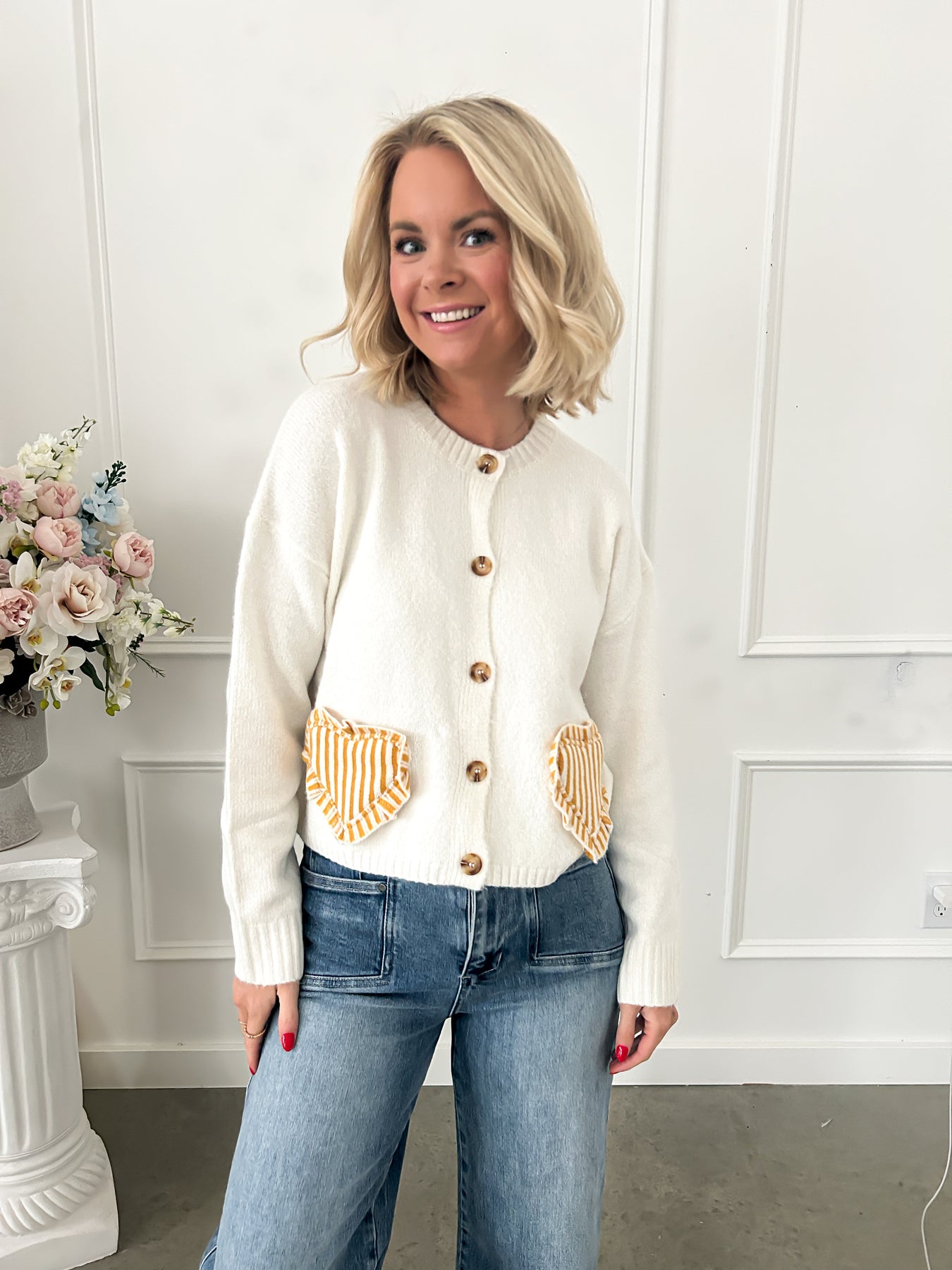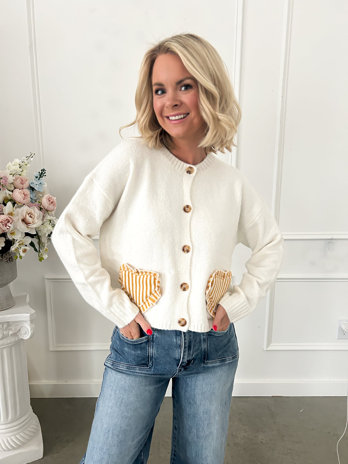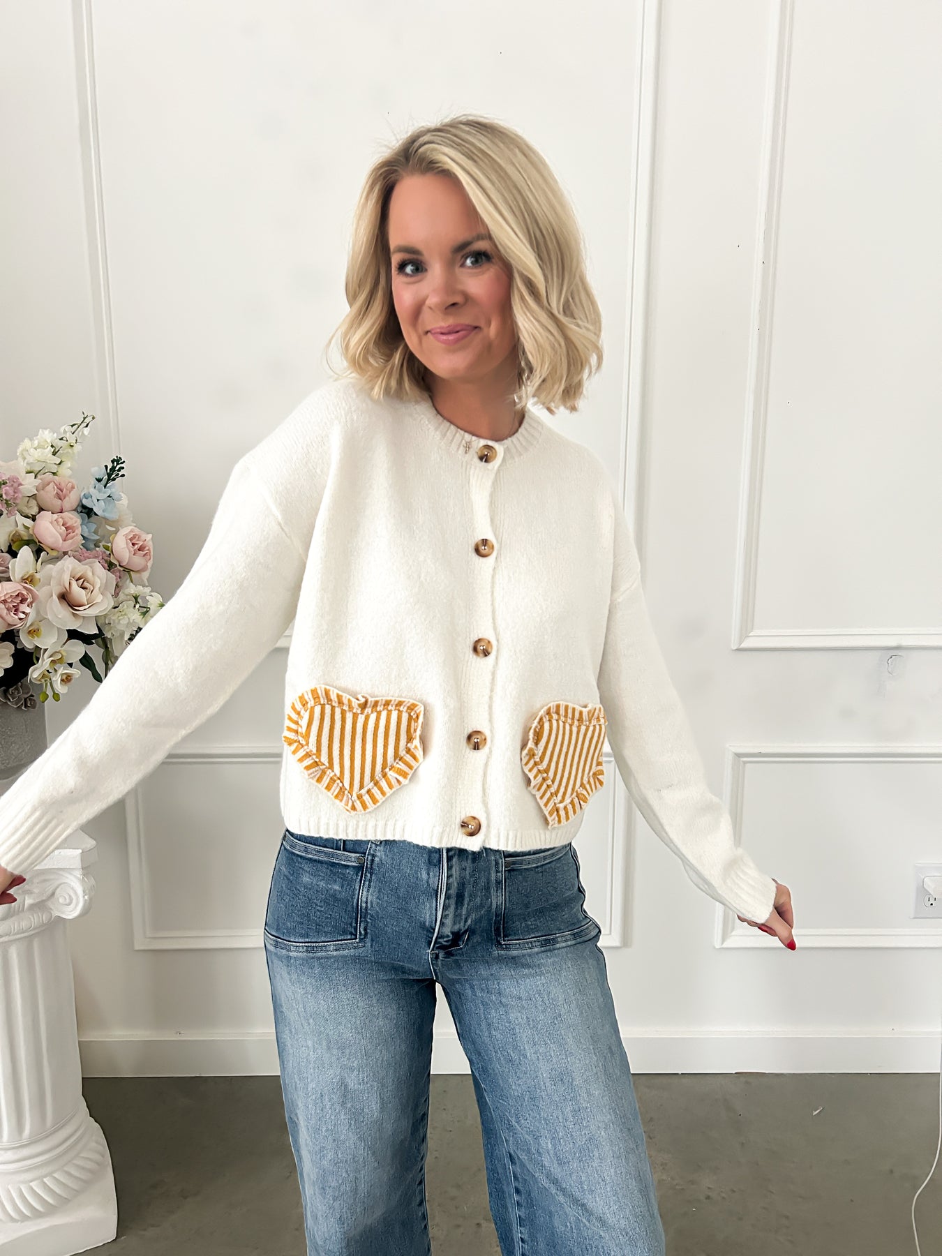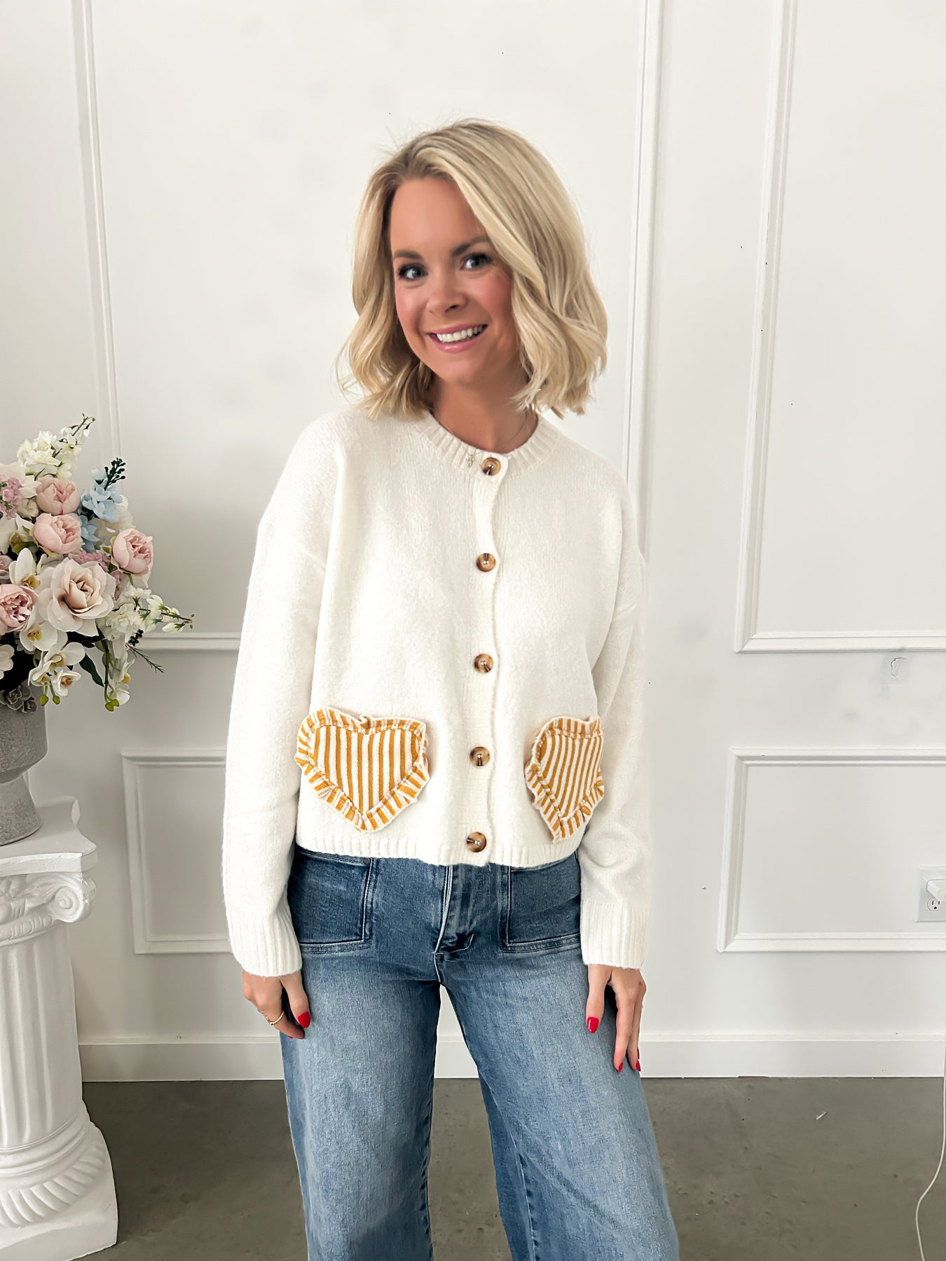 Snuggle into sweetness with this charming cream cardigan, complete with adorable mustard yellow striped heart pockets that'll make you smile every time you reach in. The soft, cozy knit pairs perfectly with your favorite jeans or dresses, while the classic button-down closure keeps things effortlessly put-together. Whether you're layering for warmth or adding a touch of whimsy to your outfit, this cardigan brings both comfort and personality to your wardrobe.