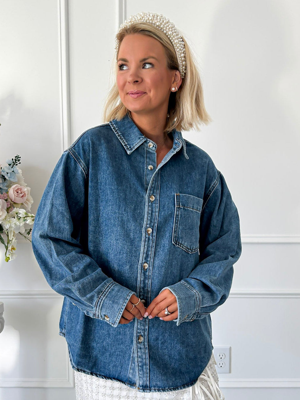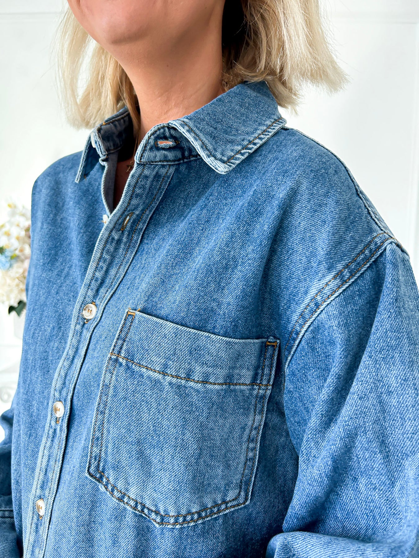 This oversized denim shirt puts a fresh spin on a classic favorite. Made from light and medium-wash blue denim, it drapes in a relaxed, slouchy way that’s perfect for a laid-back vibe. With charming details like a pointed collar, full button-down front, chest pocket, and buttoned cuffs, it’s made for endless styling fun.