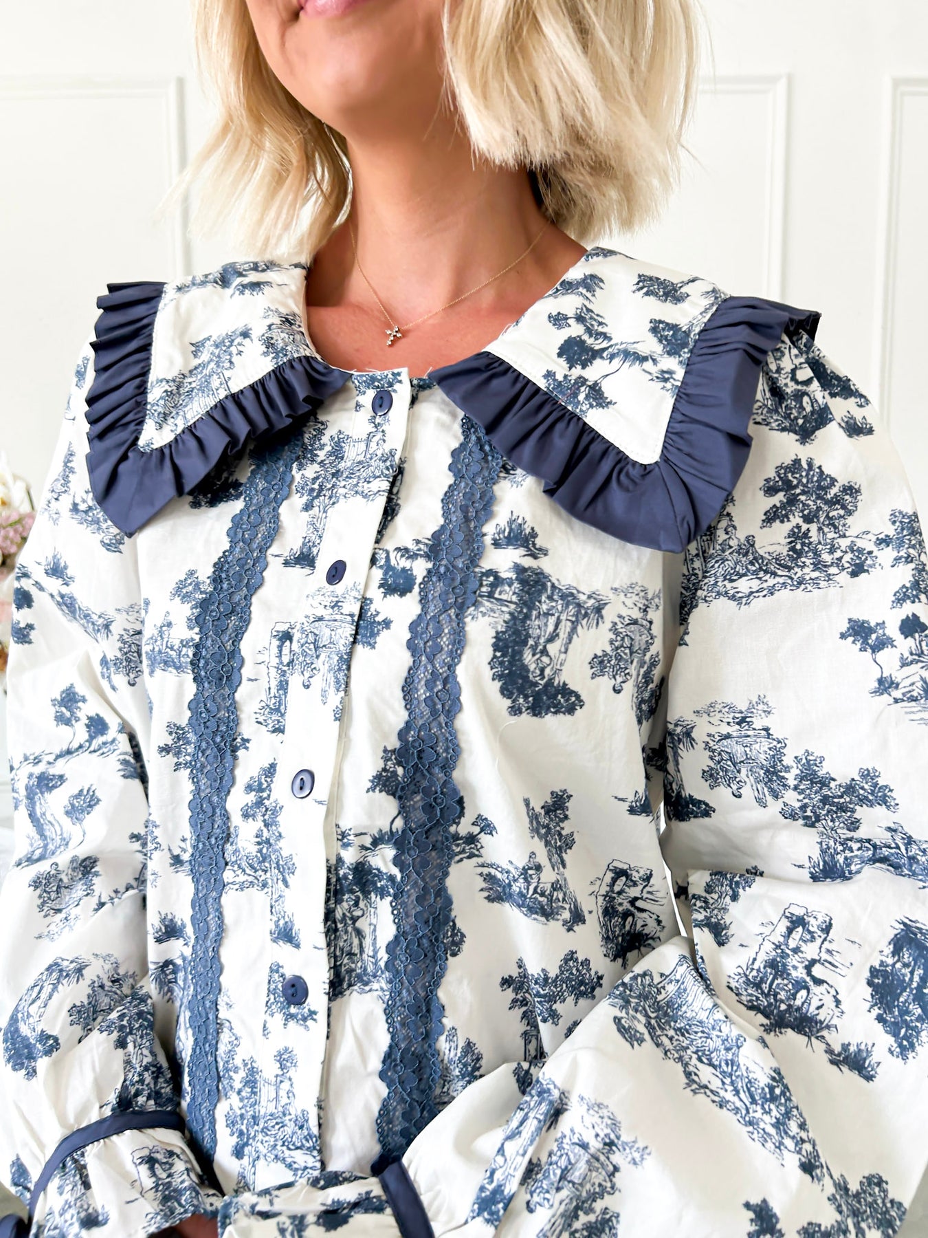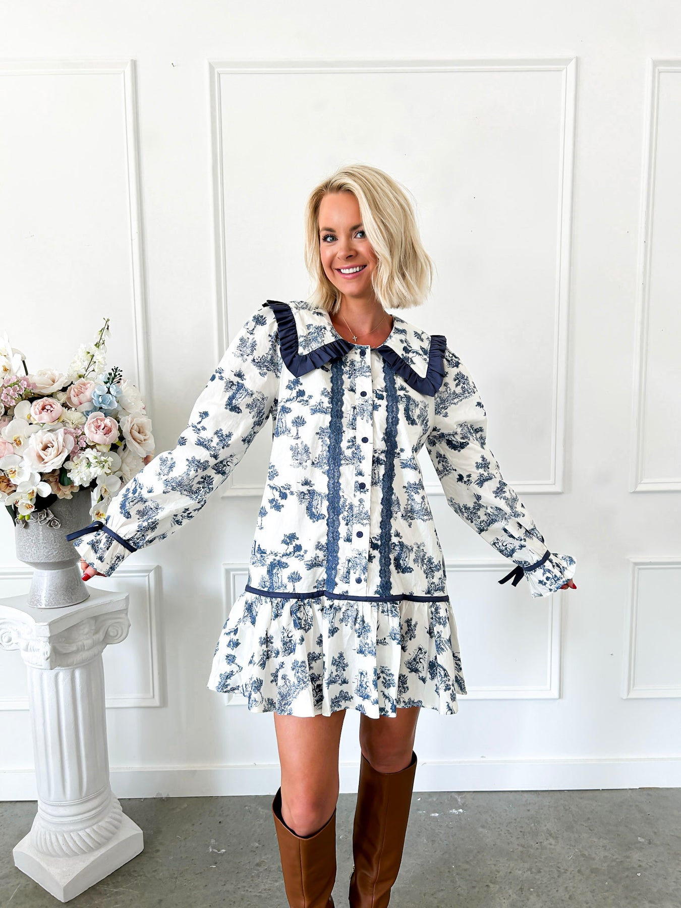 Step into storybook charm with the Ever After Navy Toile Dress. This playful piece features a classic blue and navy toile print paired with a sweet Peter Pan collar and delicate lace accents. Perfect for twirling through your day with a touch of vintage whimsy, this dress adds a fun yet timeless flair to your wardrobe.