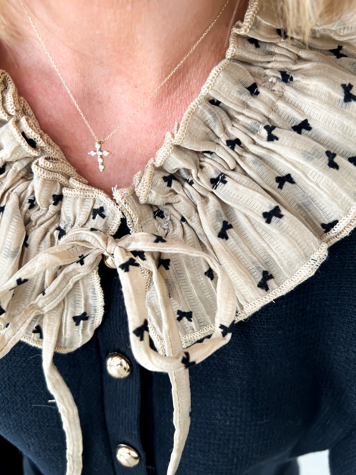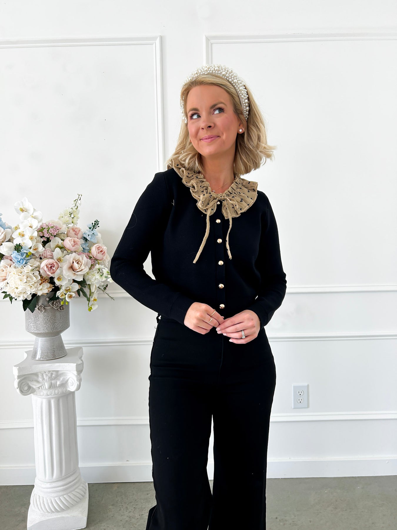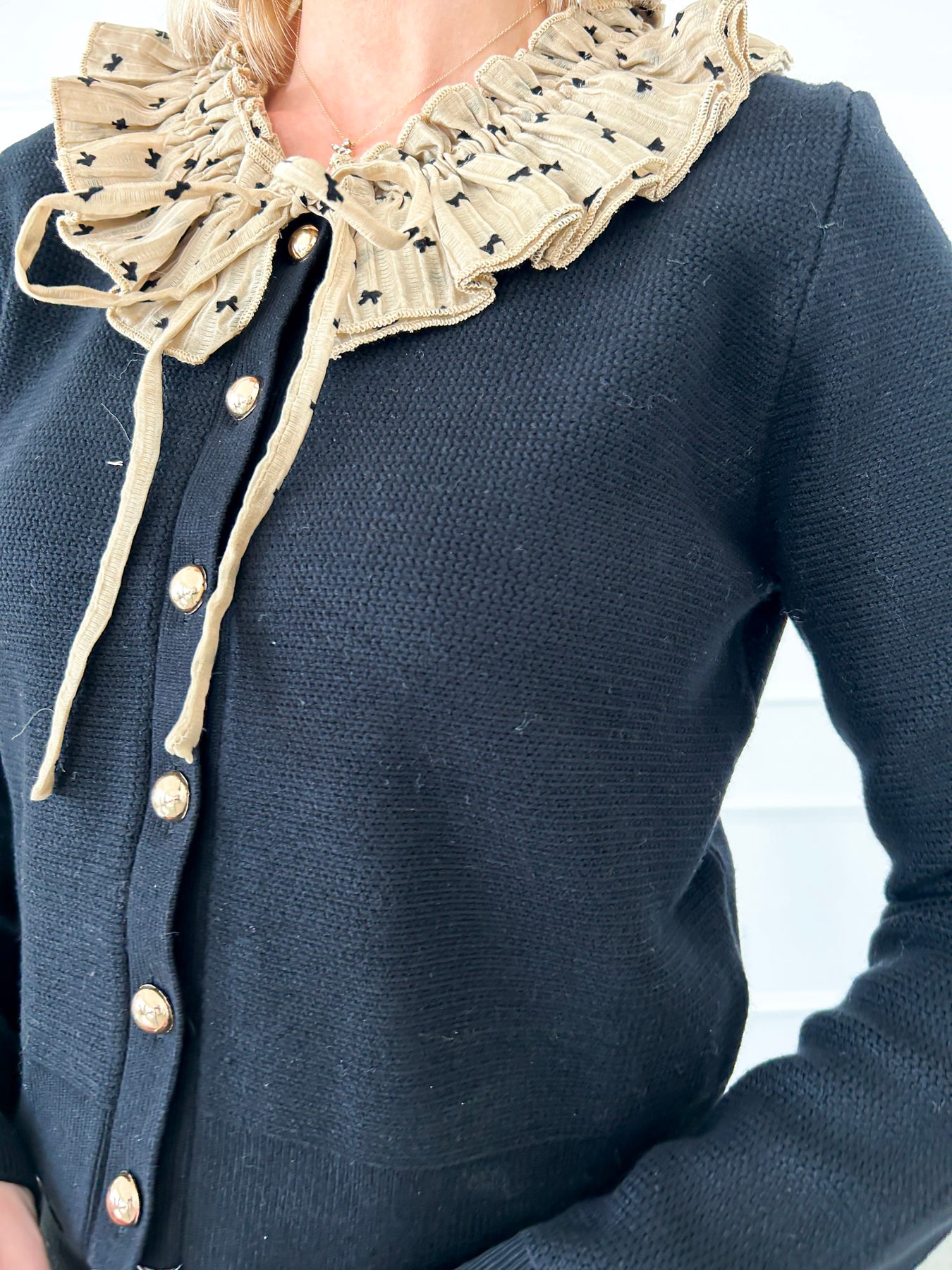 This cropped black cardigan brings effortless sophistication with a playful twist. The standout tan ruffle collar adorned with a charming black pow print adds personality and movement to your everyday look. Perfect styled as a chic top, it pairs beautifully with high-waisted skirts or tailored pants for an instantly polished ensemble. Classic meets fun in this versatile piece that proves cardigans are anything but boring.