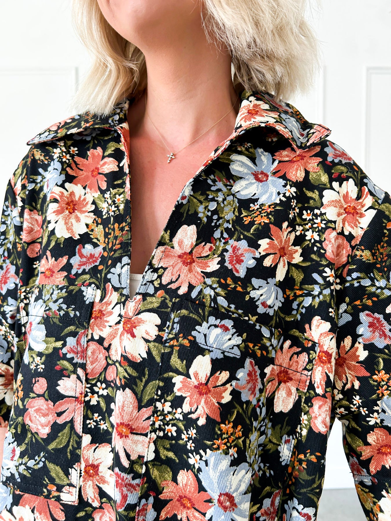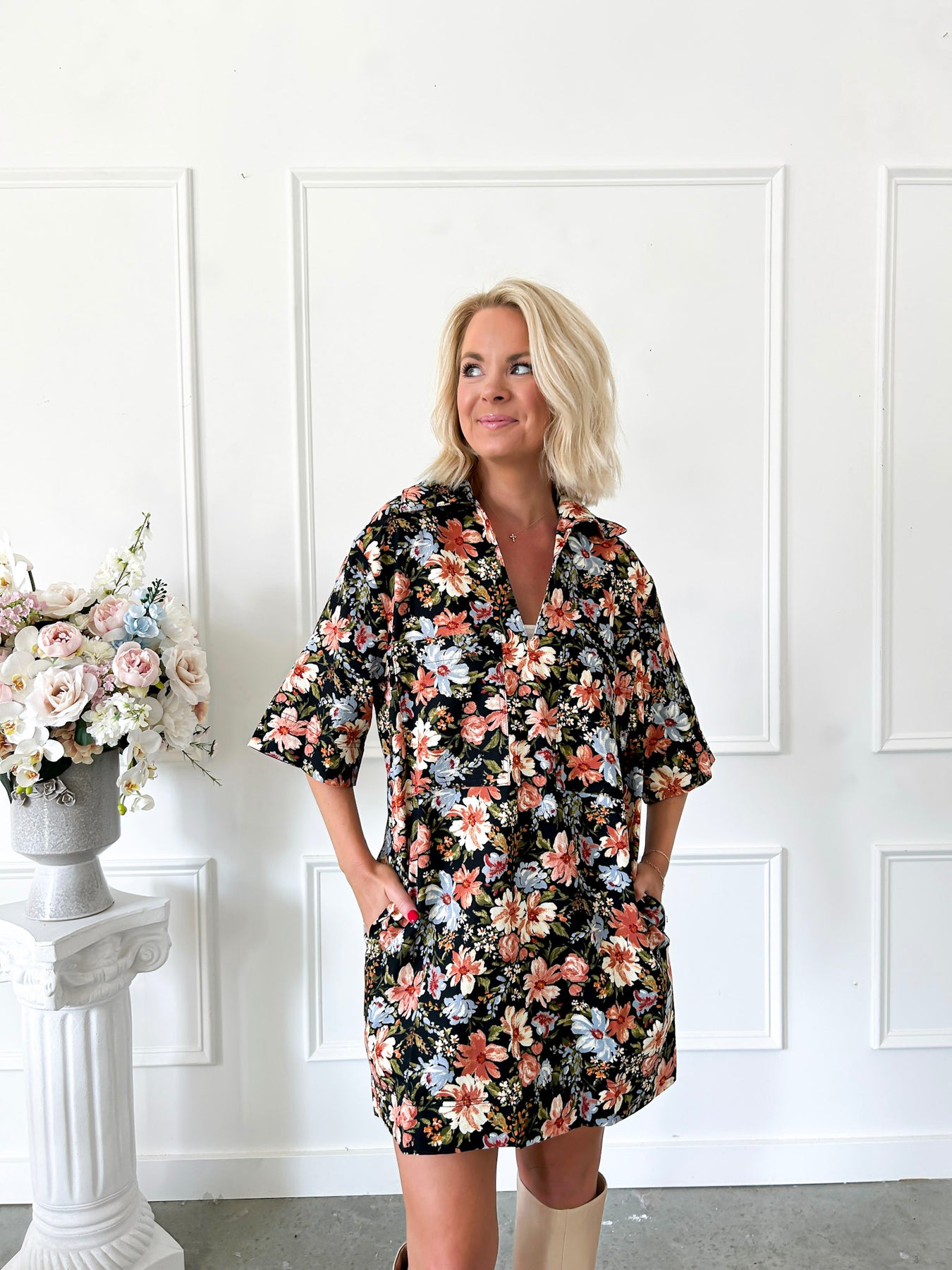 This black shift dress features a beautiful fall floral print with bright yet neutral tones that complement the season perfectly. Its flattering silhouette makes it easy to wear for any occasion, while the soft fabric ensures comfort all day long. Pair it with tall boots for a stylish and effortless autumn look you’ll love.
