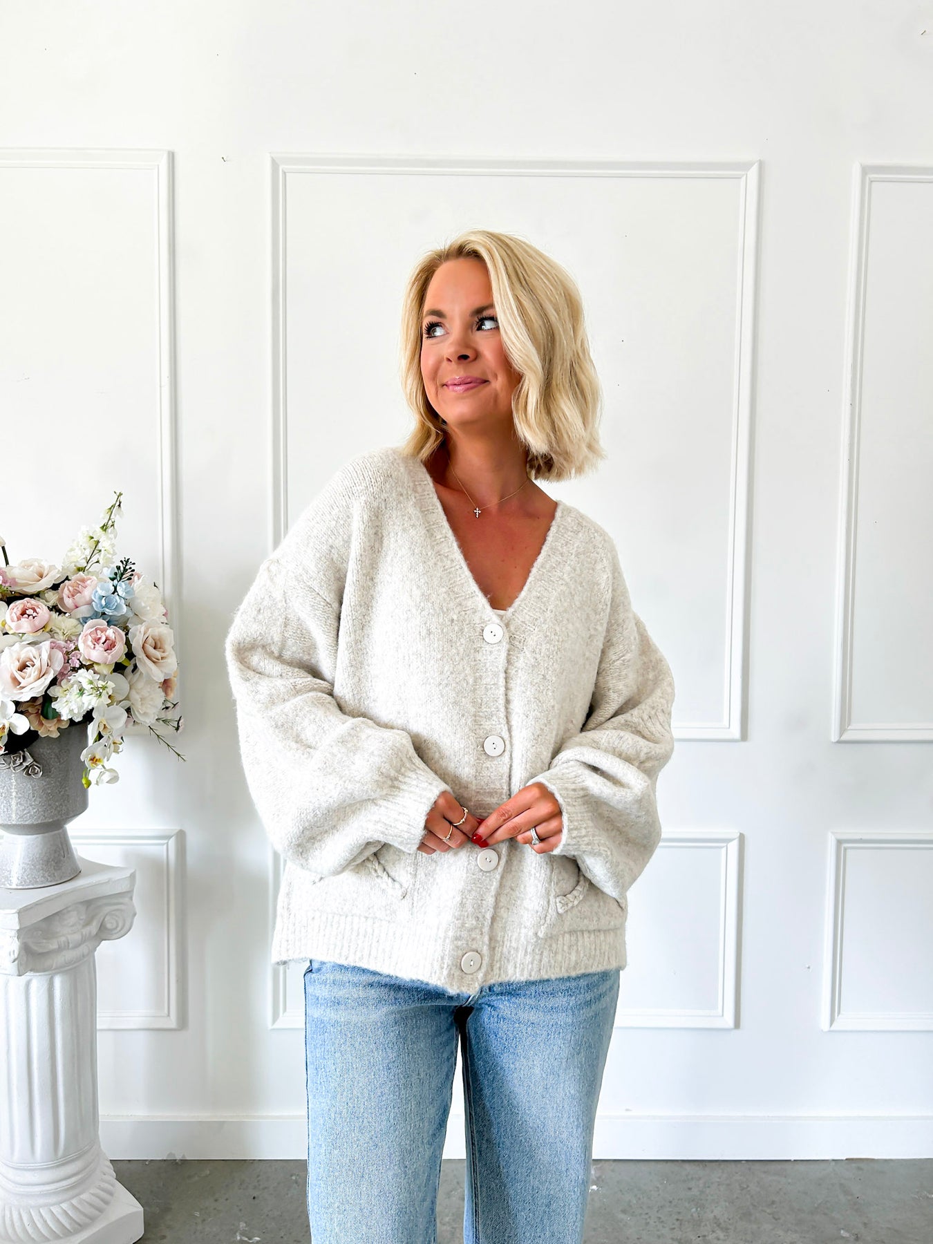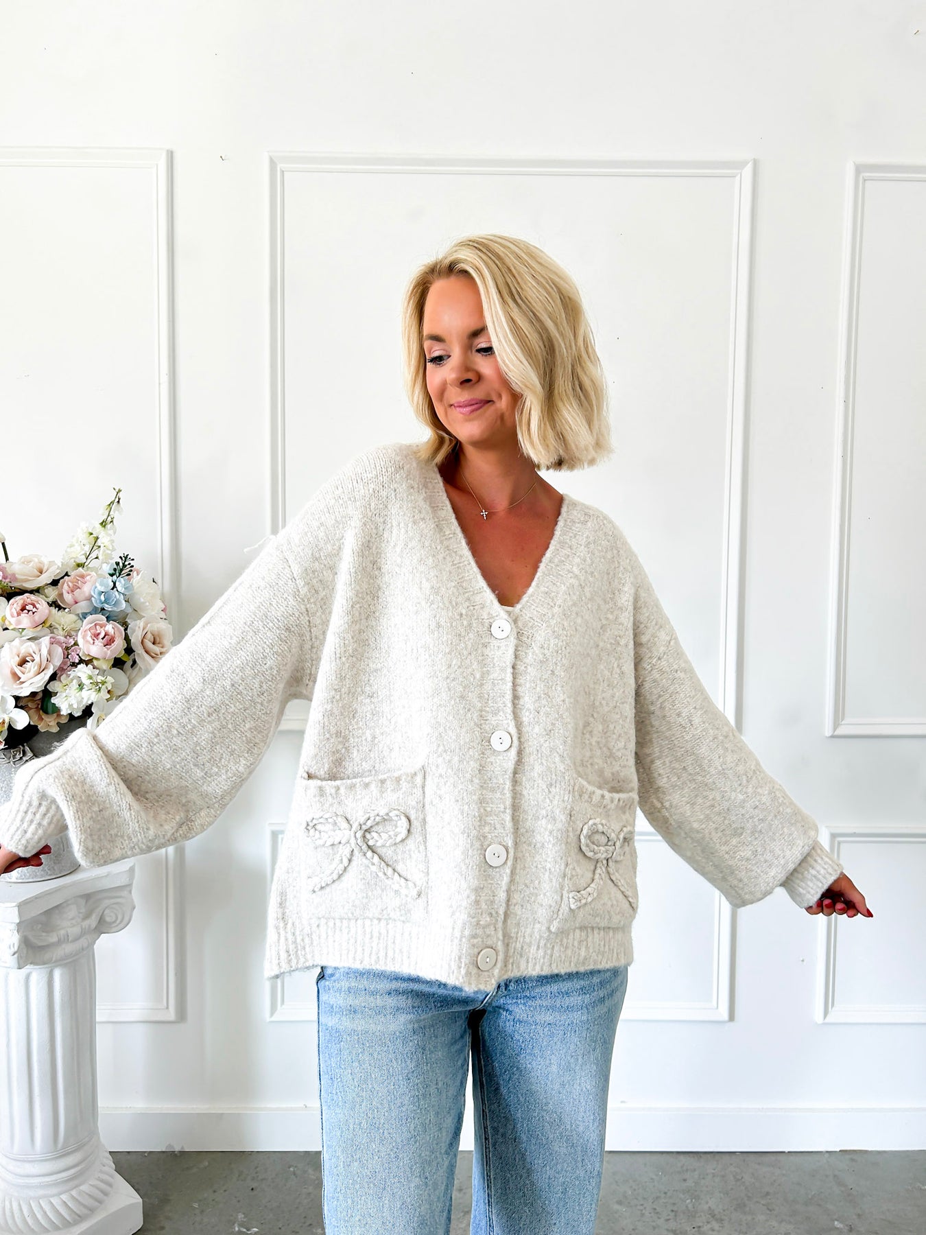 The Tied Just So Cream Bow Cardigan is a perfect companion for cooler days. Its soft cream fabric and braided rope bow details on the front patch pockets offer both warmth and a delicate touch of style. This cardigan is designed to keep you comfortable and confident throughout fall and winter, making it a reliable choice for your seasonal wardrobe.