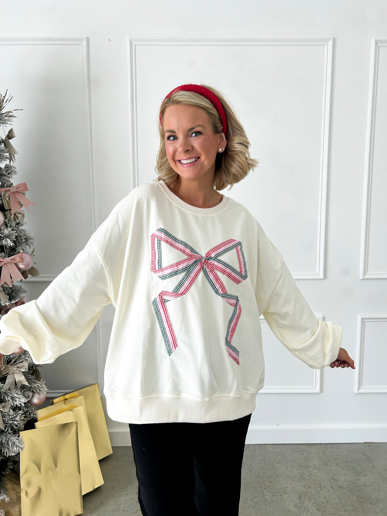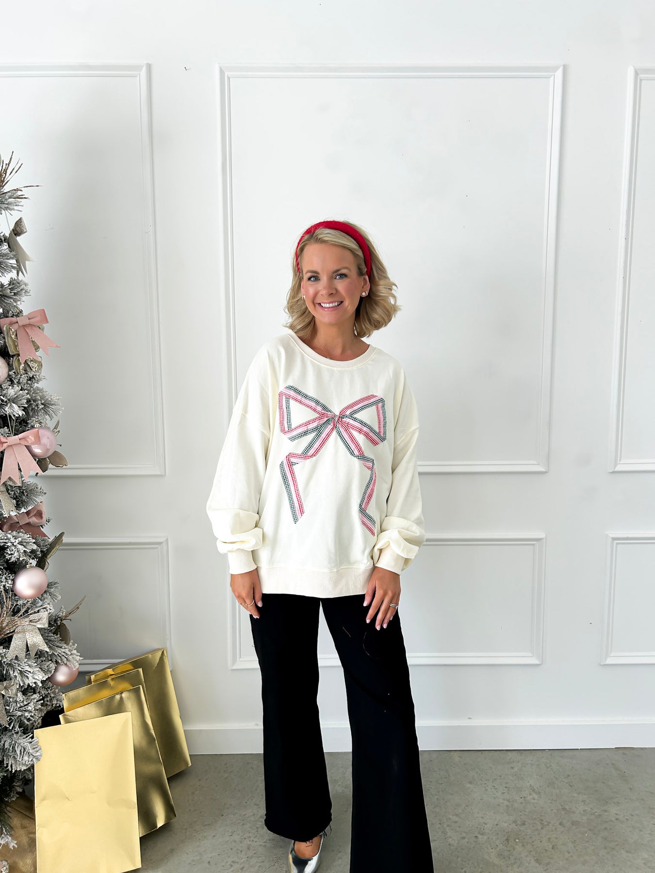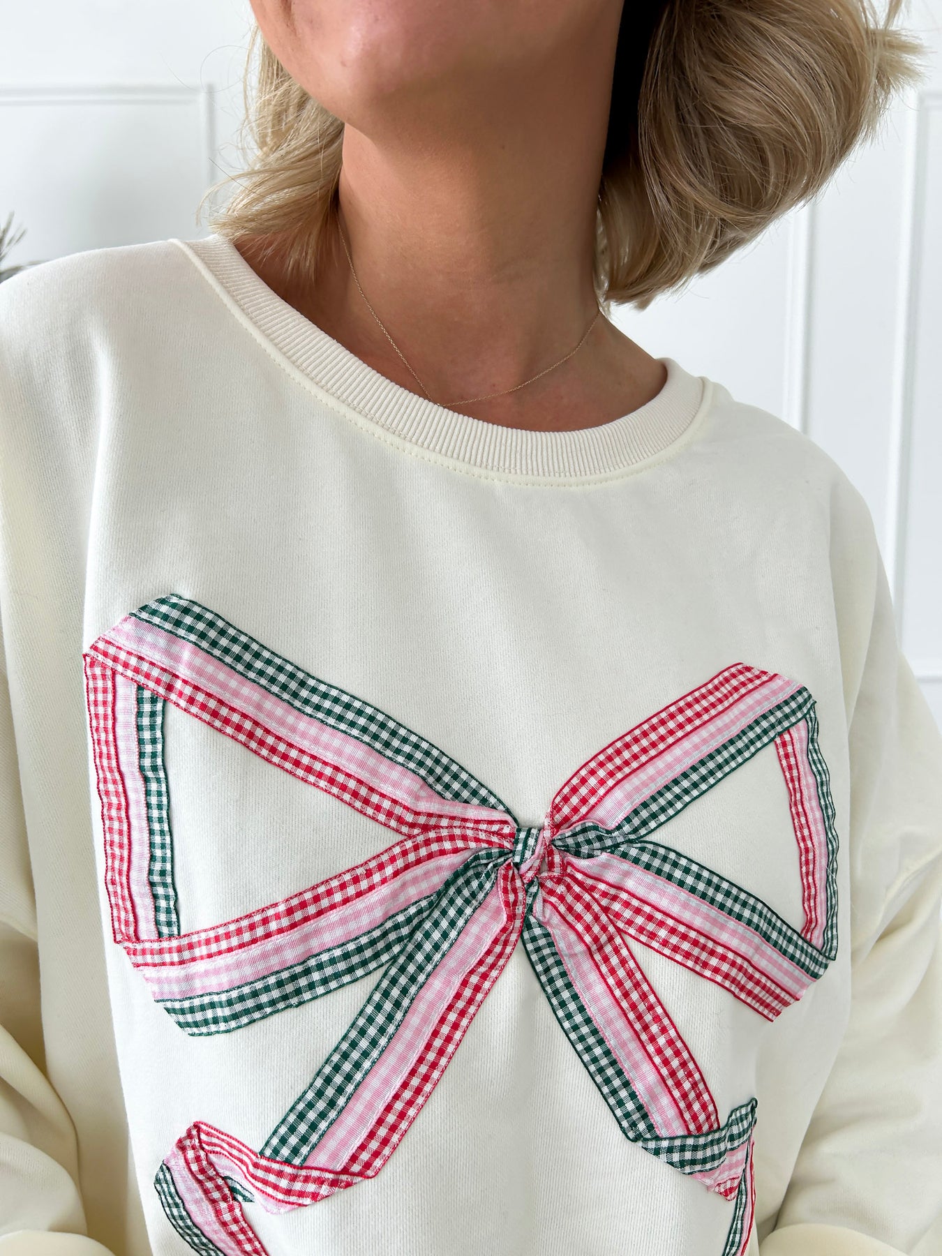 Spread holiday cheer in this charming ivory sweater, adorned with a vibrant red, green, and pink ribbon bow across the front. Perfect for festive gatherings and cozy celebrations, this playful piece brings instant joy to your seasonal wardrobe. The cheerful bow detail adds a touch of whimsy and elegance, making it an instant favorite for anyone who loves festive fashion with personality.