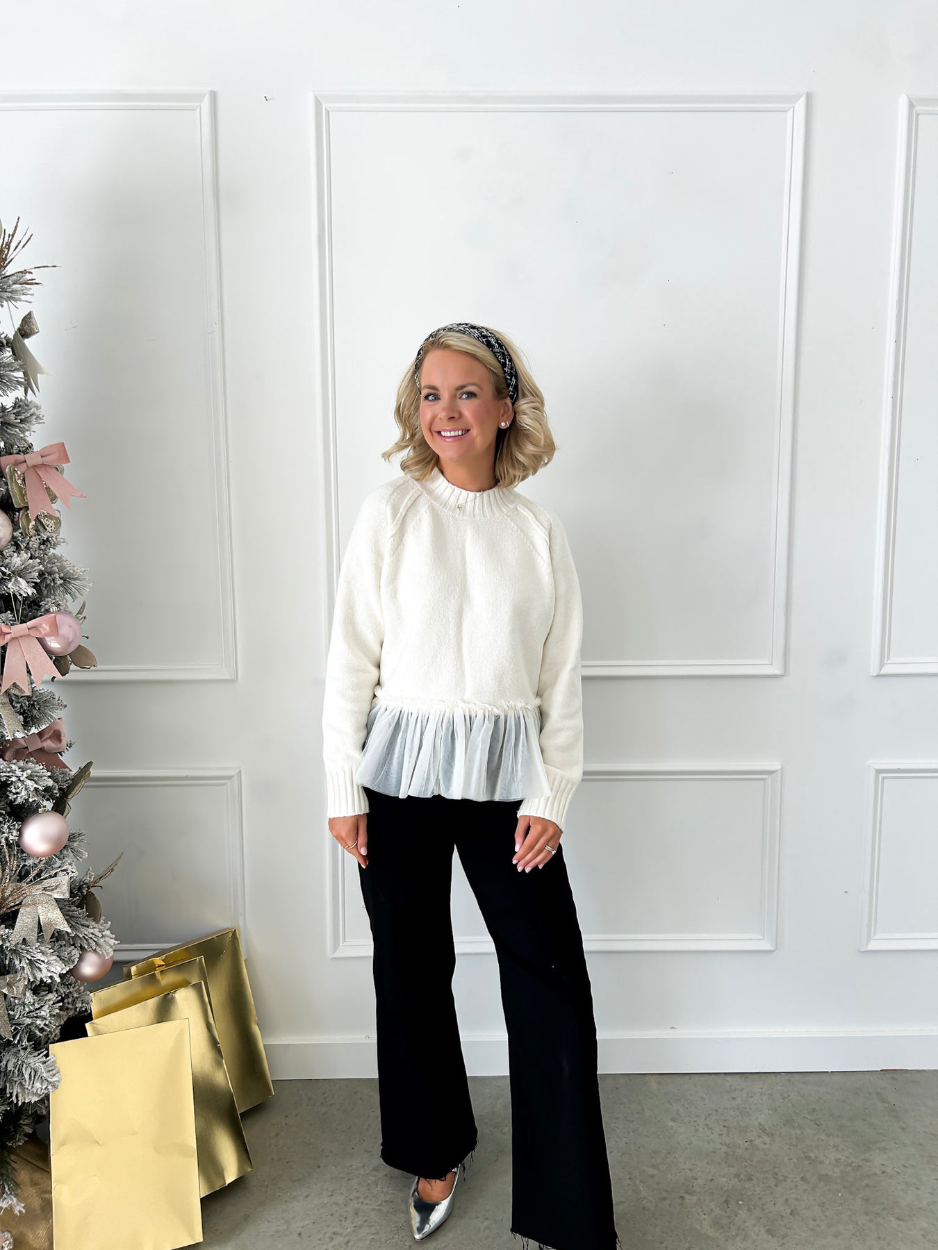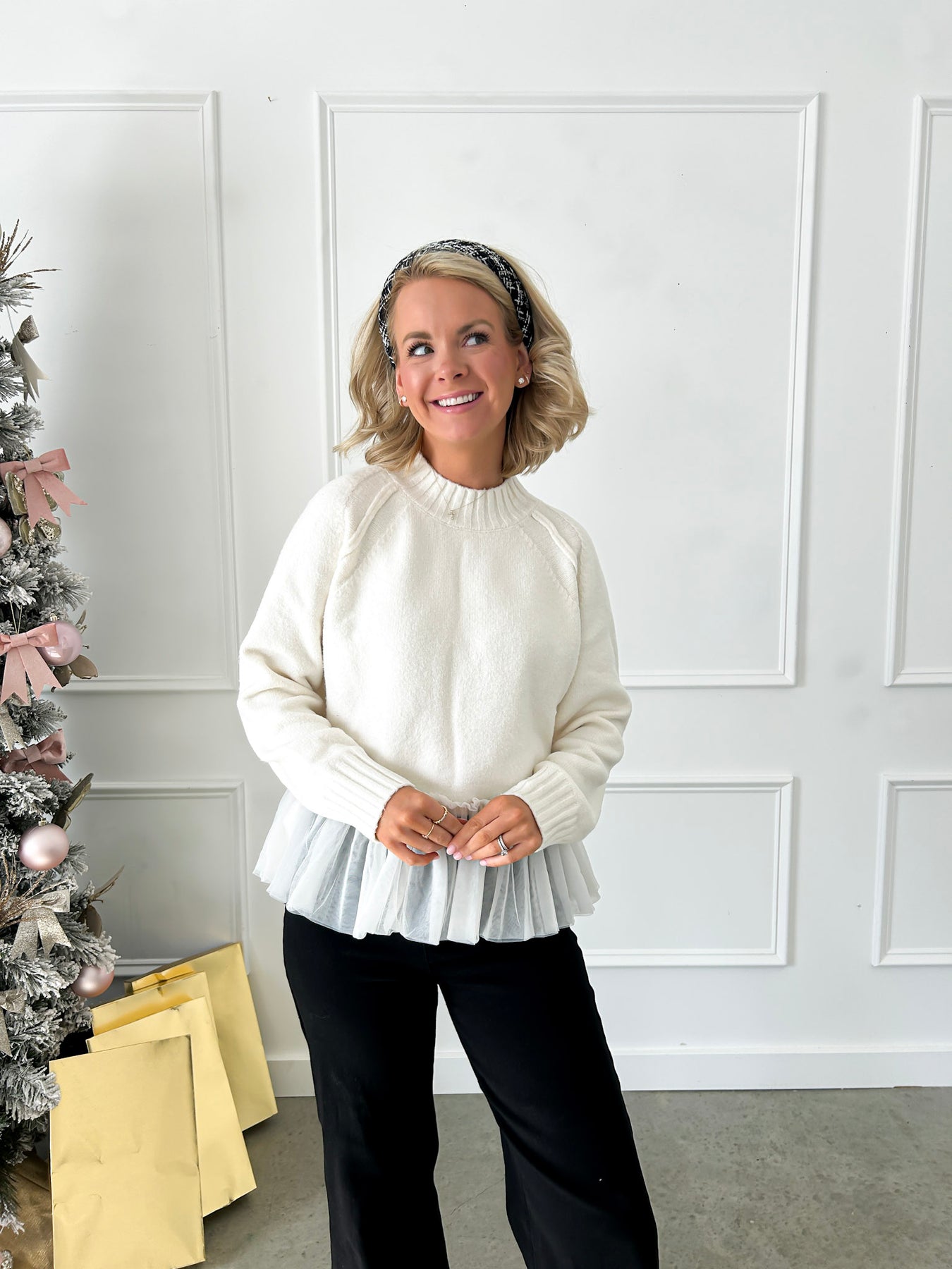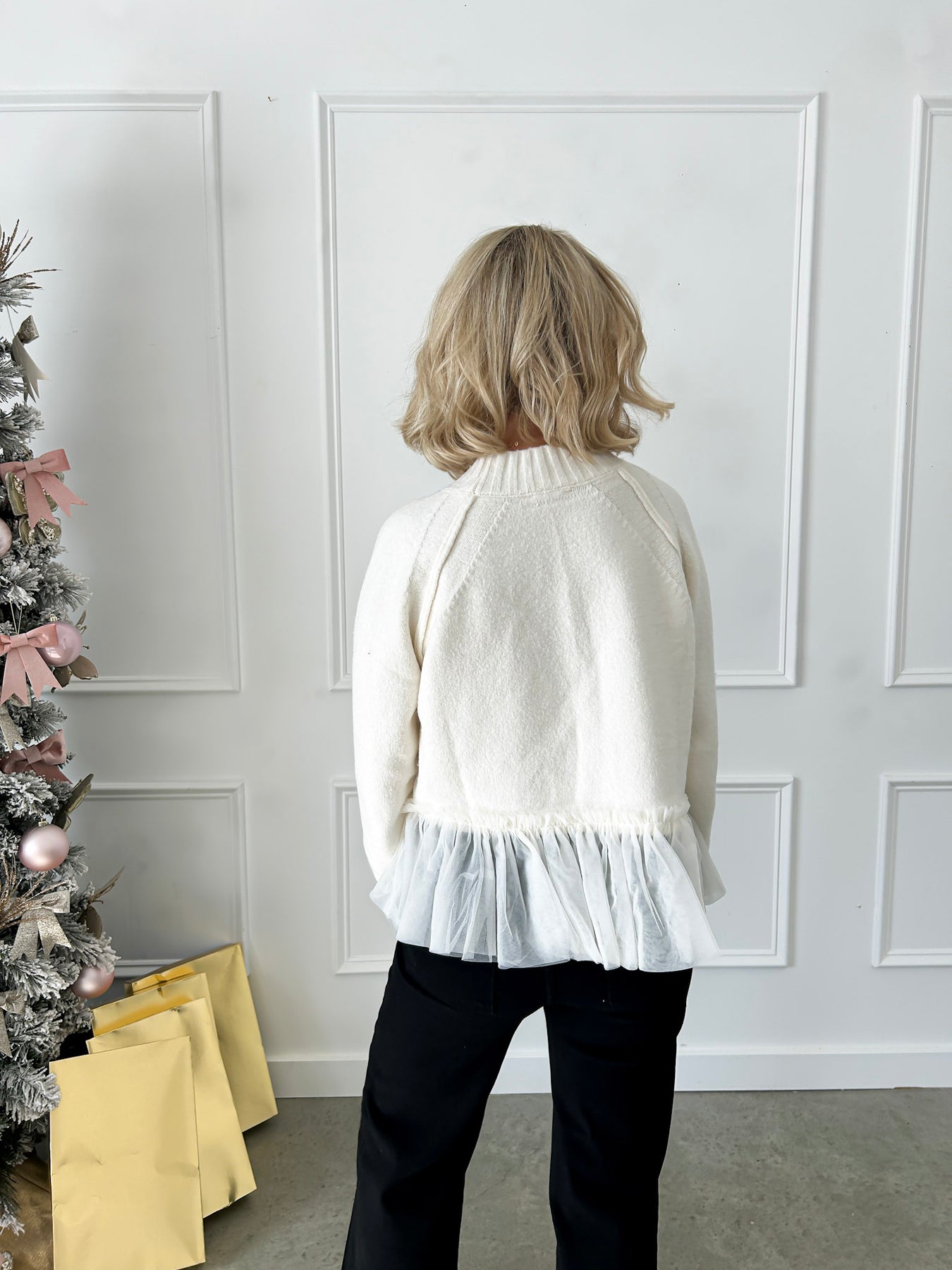 Elevate your everyday style with this whimsical cream tulle sweater that brings joy to cozy dressing. The ultra-soft mock neck and gathered tulle peplum hem add a delightful feminine flair, while the relaxed fit keeps you comfortable all day long. Ribbed detailing at the neck and cuffs ensures a polished finish that works beautifully with your favorite jeans or skirts. Perfect for boutique lovers who refuse to choose between comfort and charm—this sweater proves you can have both!