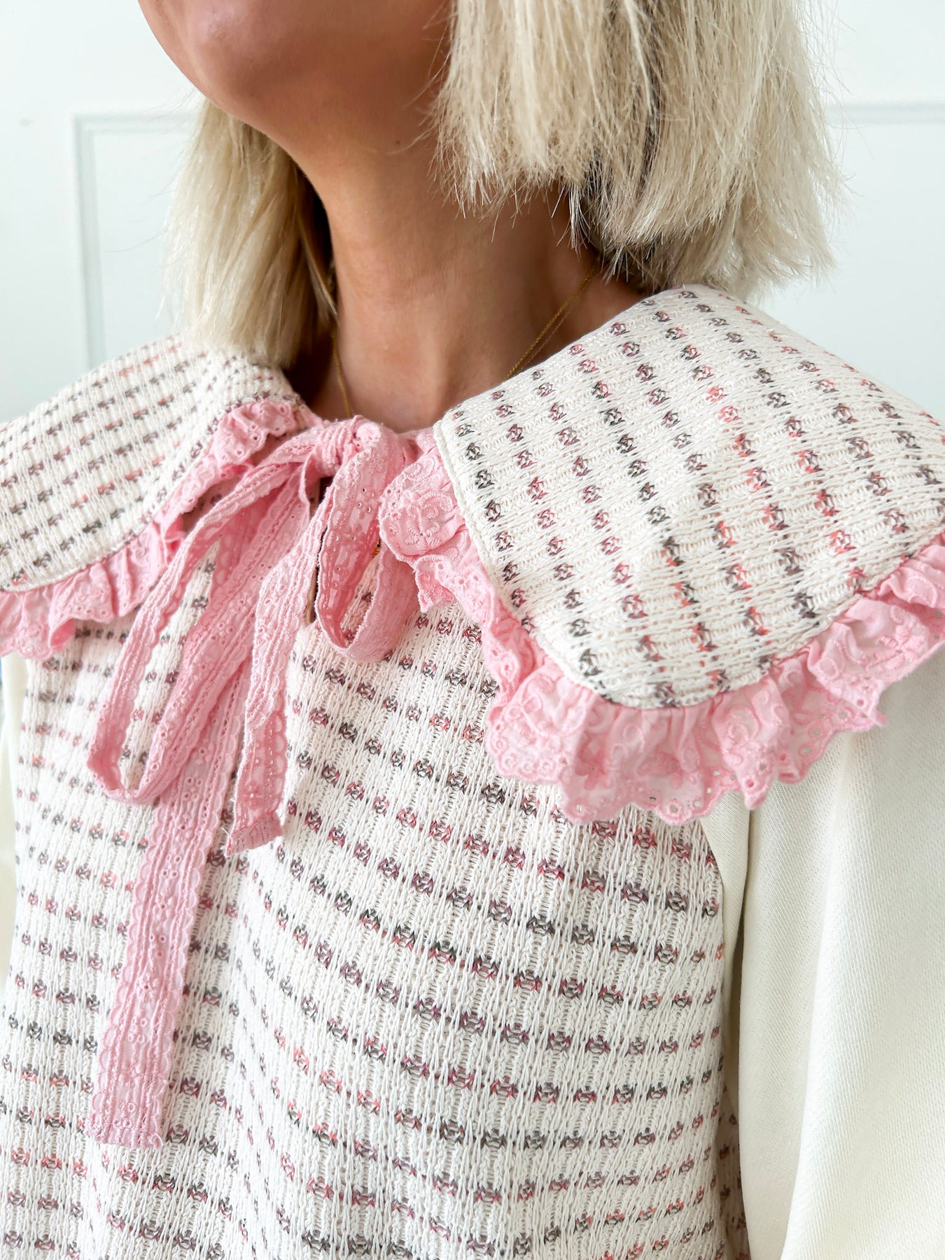 This Whipped Rose Pink & Ivory Skort Set blends charm with a playful vibe. Featuring a classic Peter Pan collar and delicate pink ruffle trim, it's perfectly accented by a sweet bow detail at the bust. The ivory and pink color palette adds a fresh, flirty touch, while the skort design keeps it fun and flirty for any sunny day out.