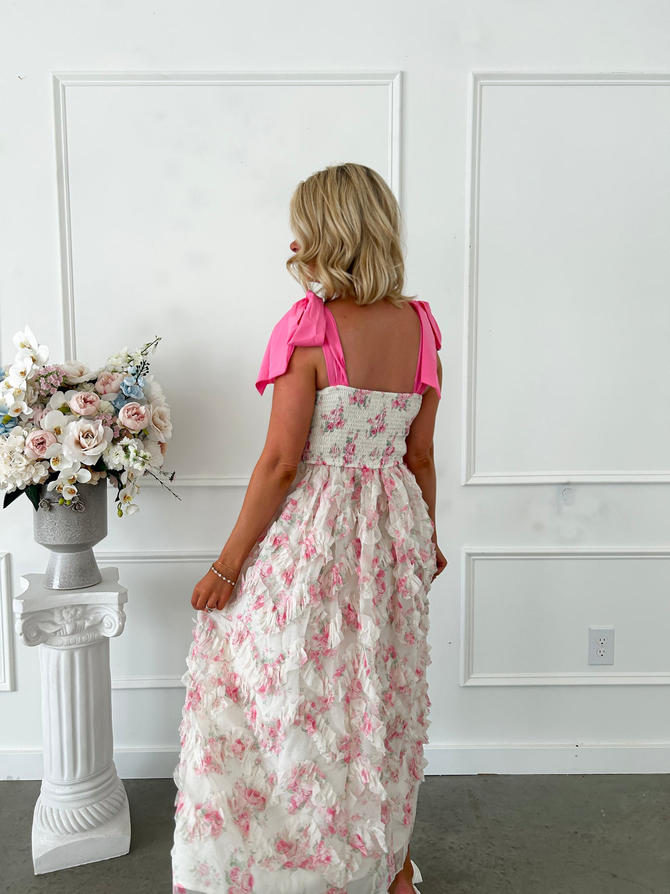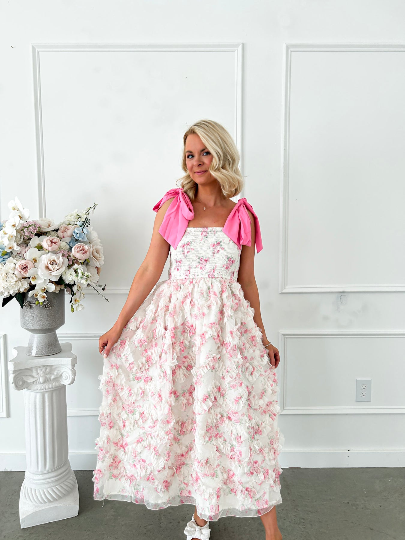 Elevate your special occasion wardrobe with this enchanting midi dress, designed for those who appreciate refined elegance. The square neckline frames the shoulders beautifully, while delicate floral smocking details add texture and visual interest to the bodice. A charming pink bow tie strap serves as a sophisticated accent, and voluminous organza ruffles create a graceful flared silhouette that moves with effortless poise. Perfect for weddings, garden parties, or upscale events, this dress combines playful femininity with polished sophistication for a truly memorable look.