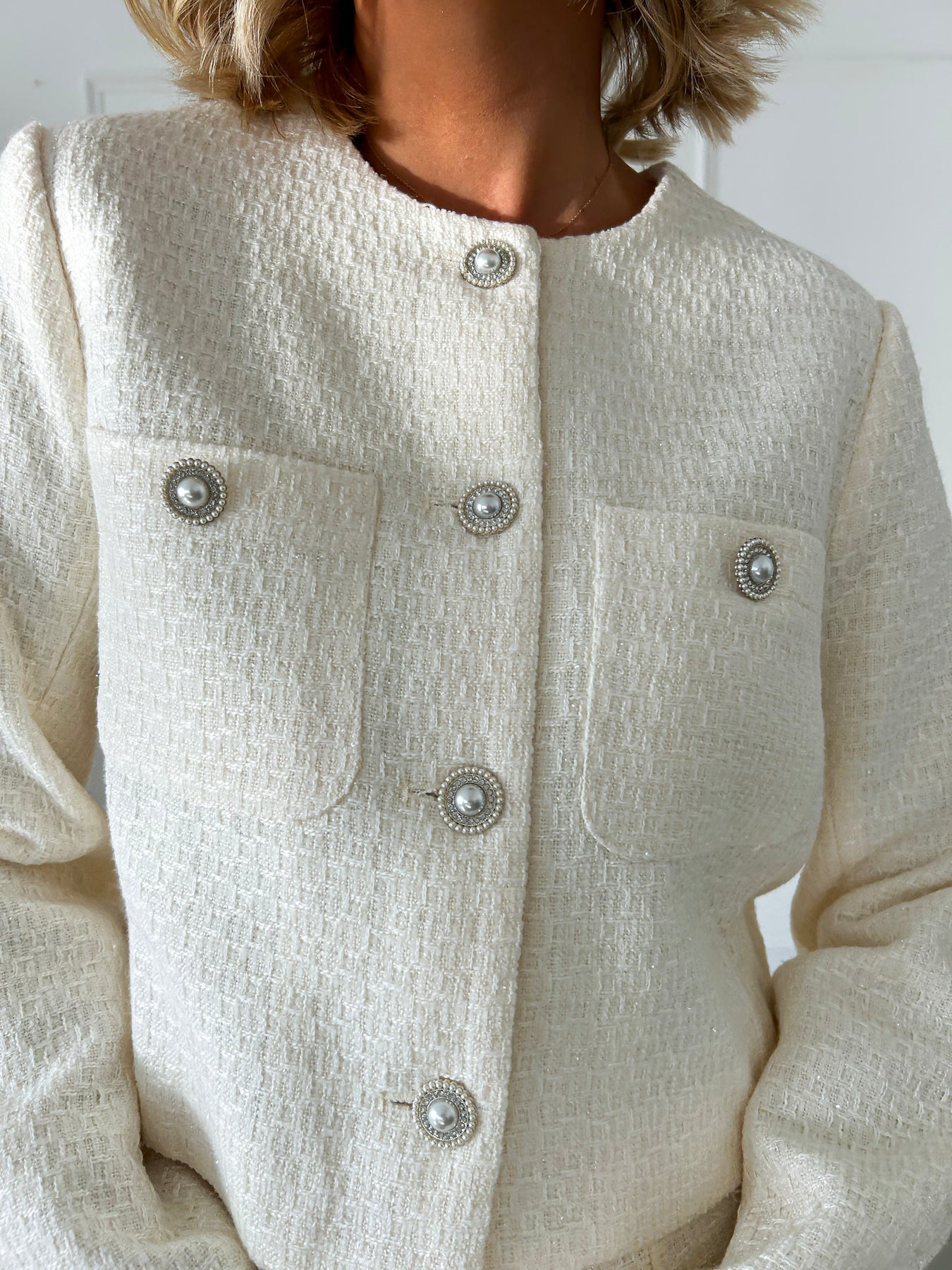 Elevate your everyday power moves in this cream tweed pant set—where sophistication meets fun! The semi-cropped jacket strikes the perfect balance between polished and playful, while lustrous pearl buttons add that extra touch of elegance. Pair it with your favorite heels or sneakers for a look that's ready to conquer the boardroom or brunch. This chic two-piece is your new go-to for making a statement without saying a word.