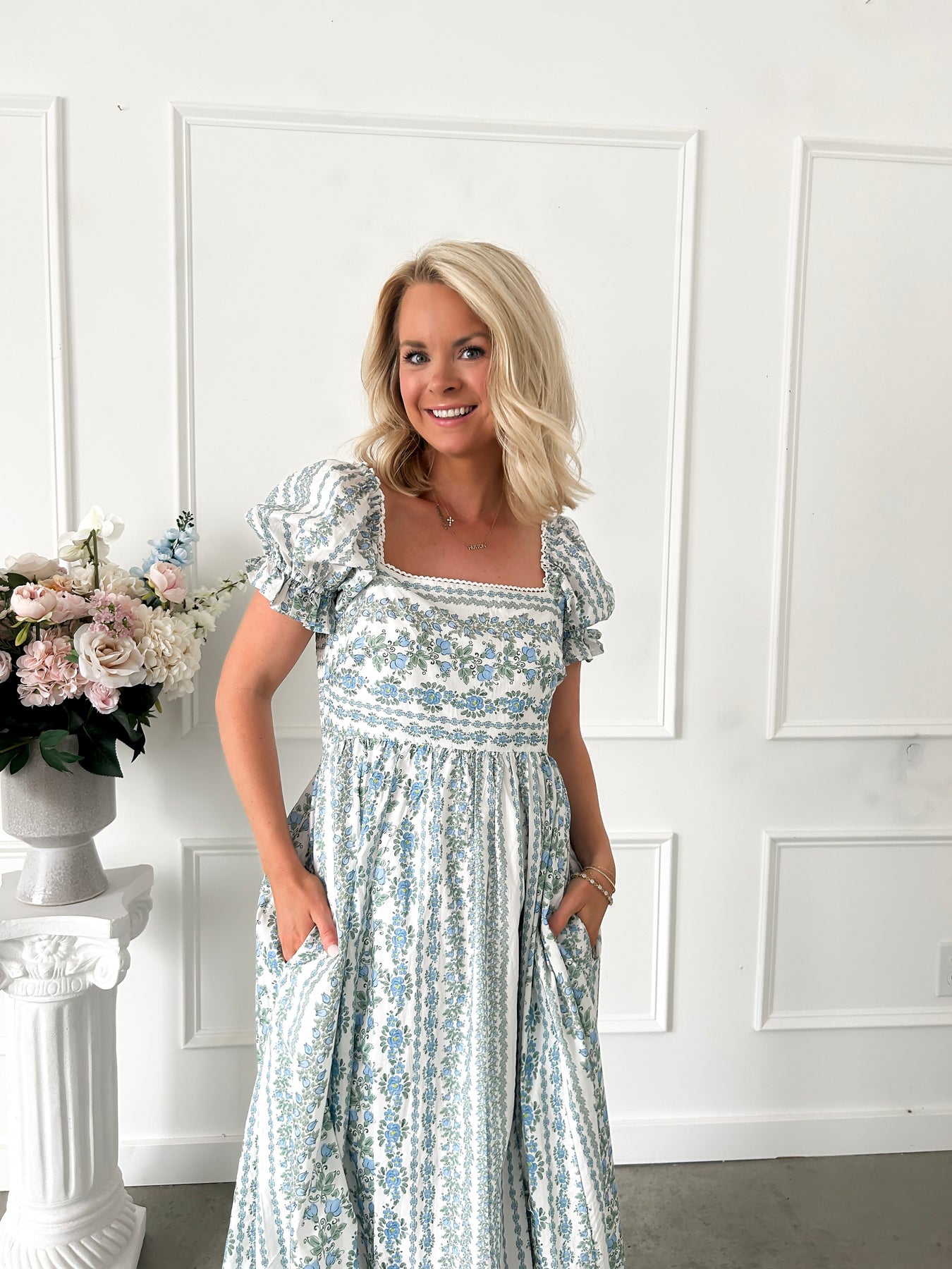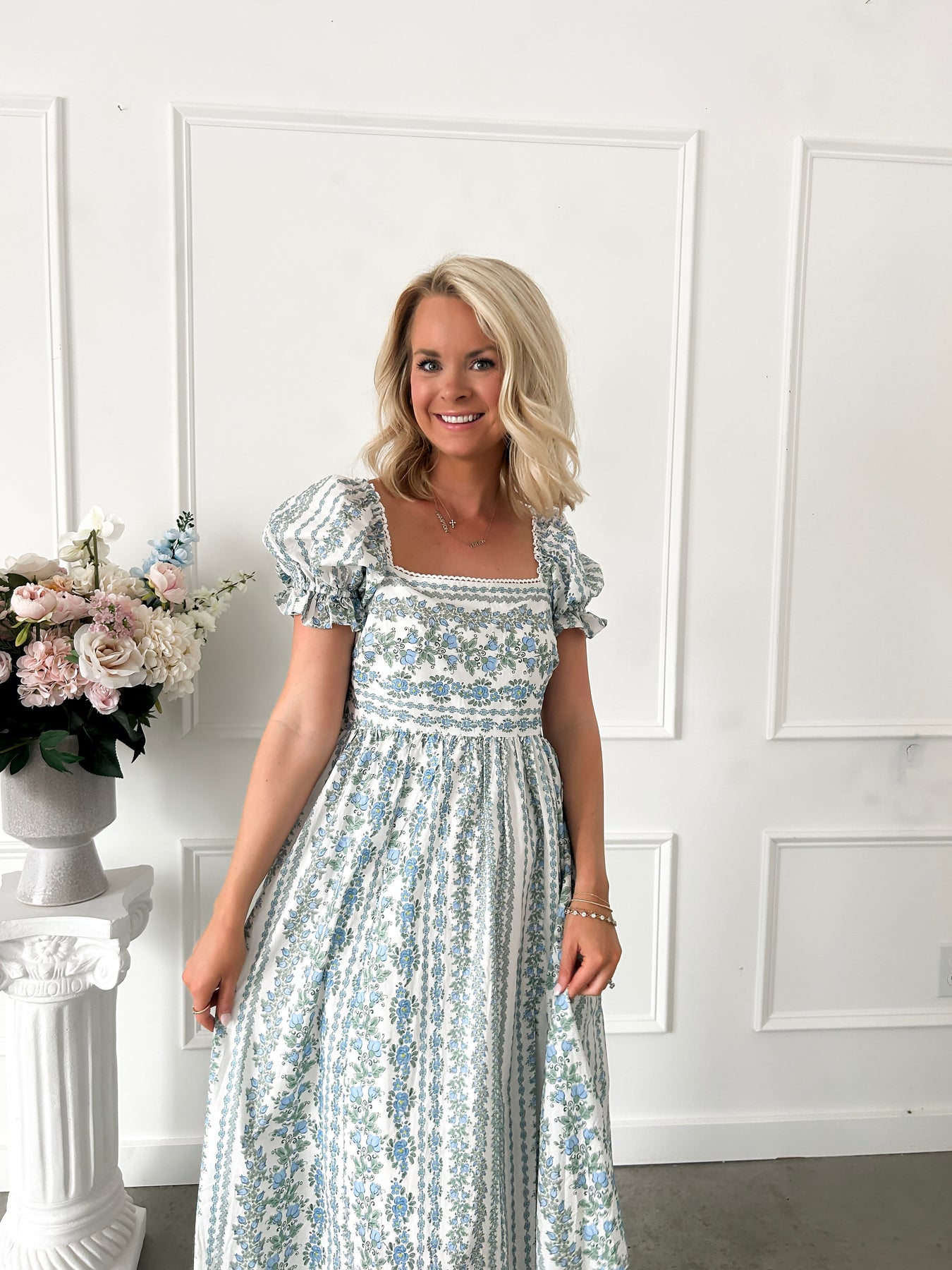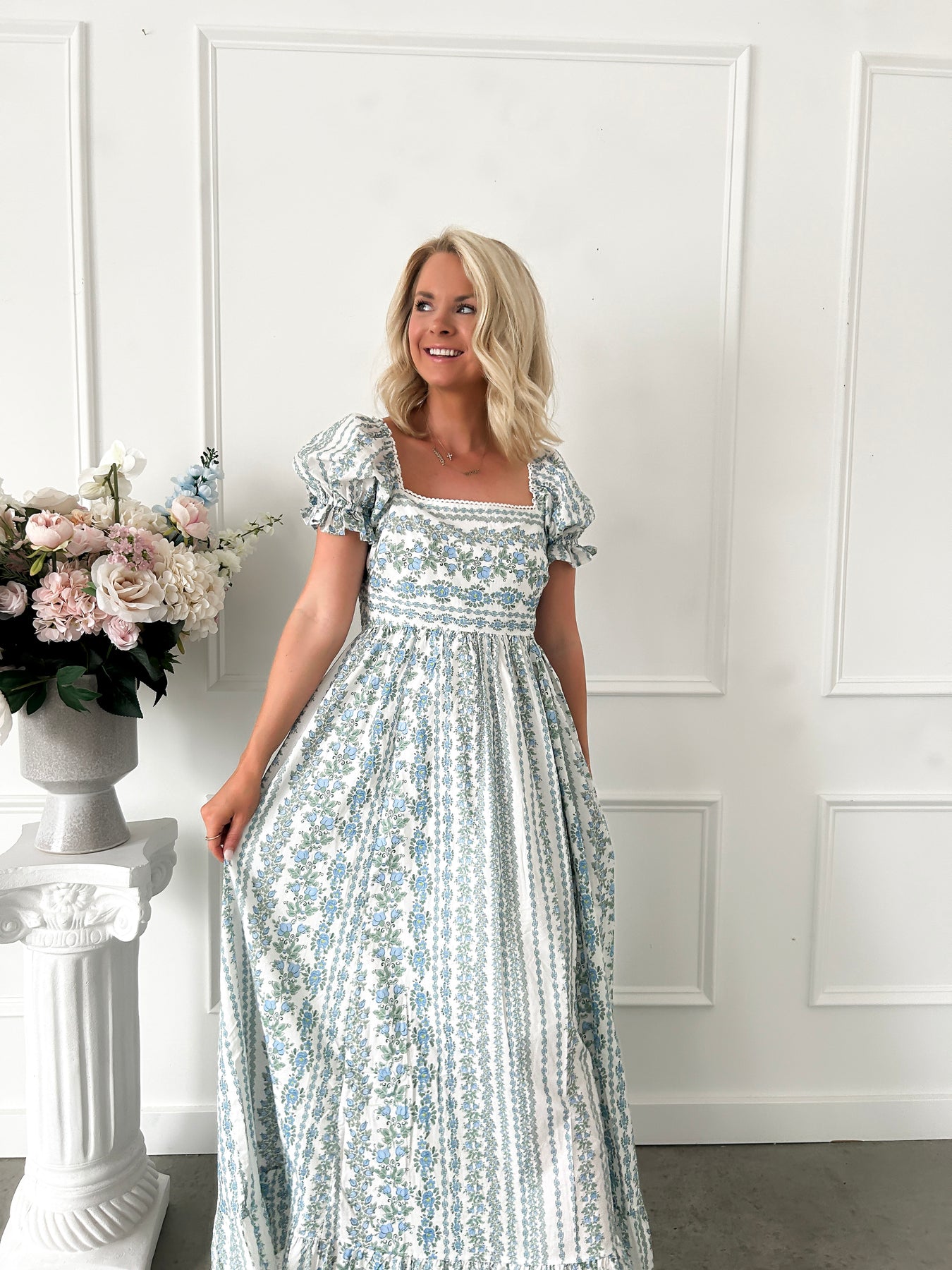 Embrace effortless elegance in this charming Bloom And Breeze french blue maxi dress. Crafted from soft cotton, it features delicate cap sleeves and romantic scallop lace trim that adds a girly, chic touch. The smocked back provides a flattering silhouette while the hidden side zipper ensures a seamless fit. Fully lined for comfort and confidence, this dress is perfect for garden parties, weddings, or any occasion calling for timeless femininity.