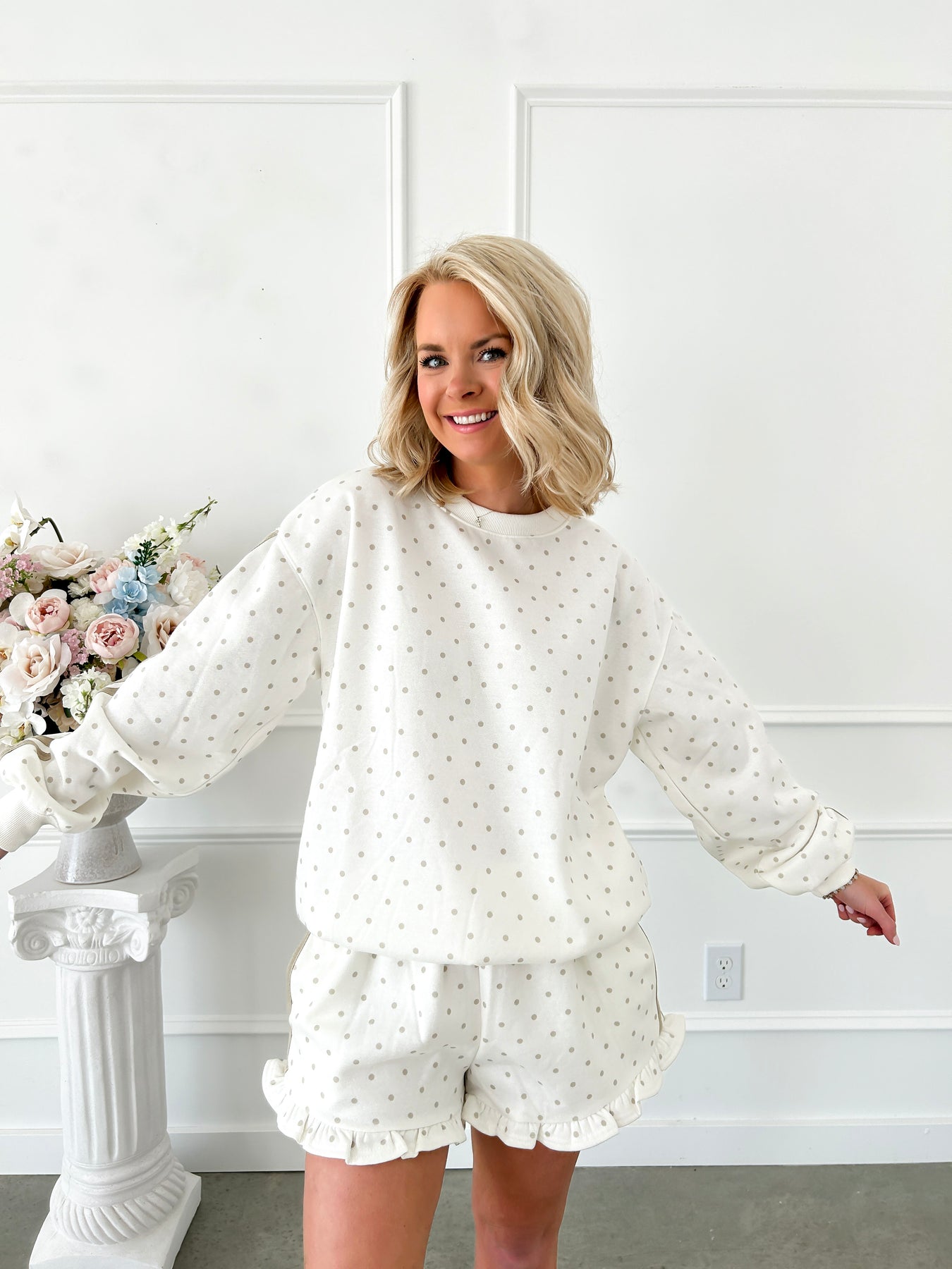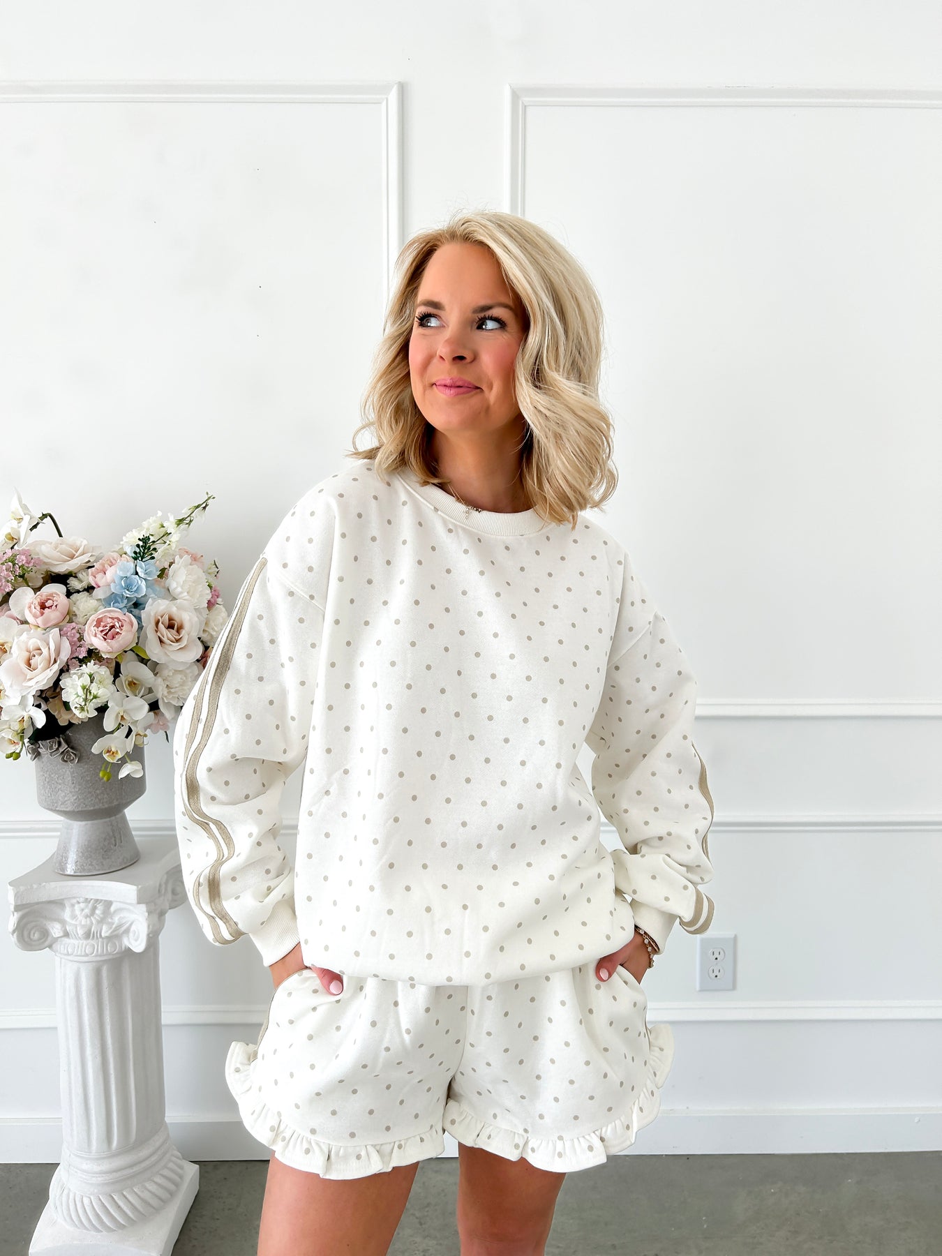 Slip into effortless comfort with this charming sweatshirt that blends cozy loungewear vibes with understated style. Featuring a classic polka dot pattern in warm cream and tan tones, the soft French terry fabric feels like a gentle hug against your skin. The side solid band detail adds a modern touch that keeps things fresh and interesting. Perfect for lazy mornings, work-from-home days, or casual outings—this piece proves that looking put-together doesn't require any effort at all.