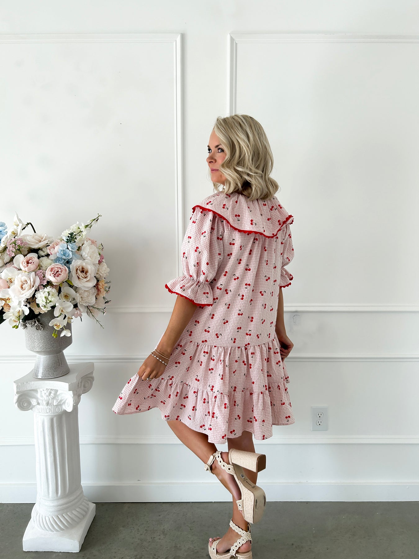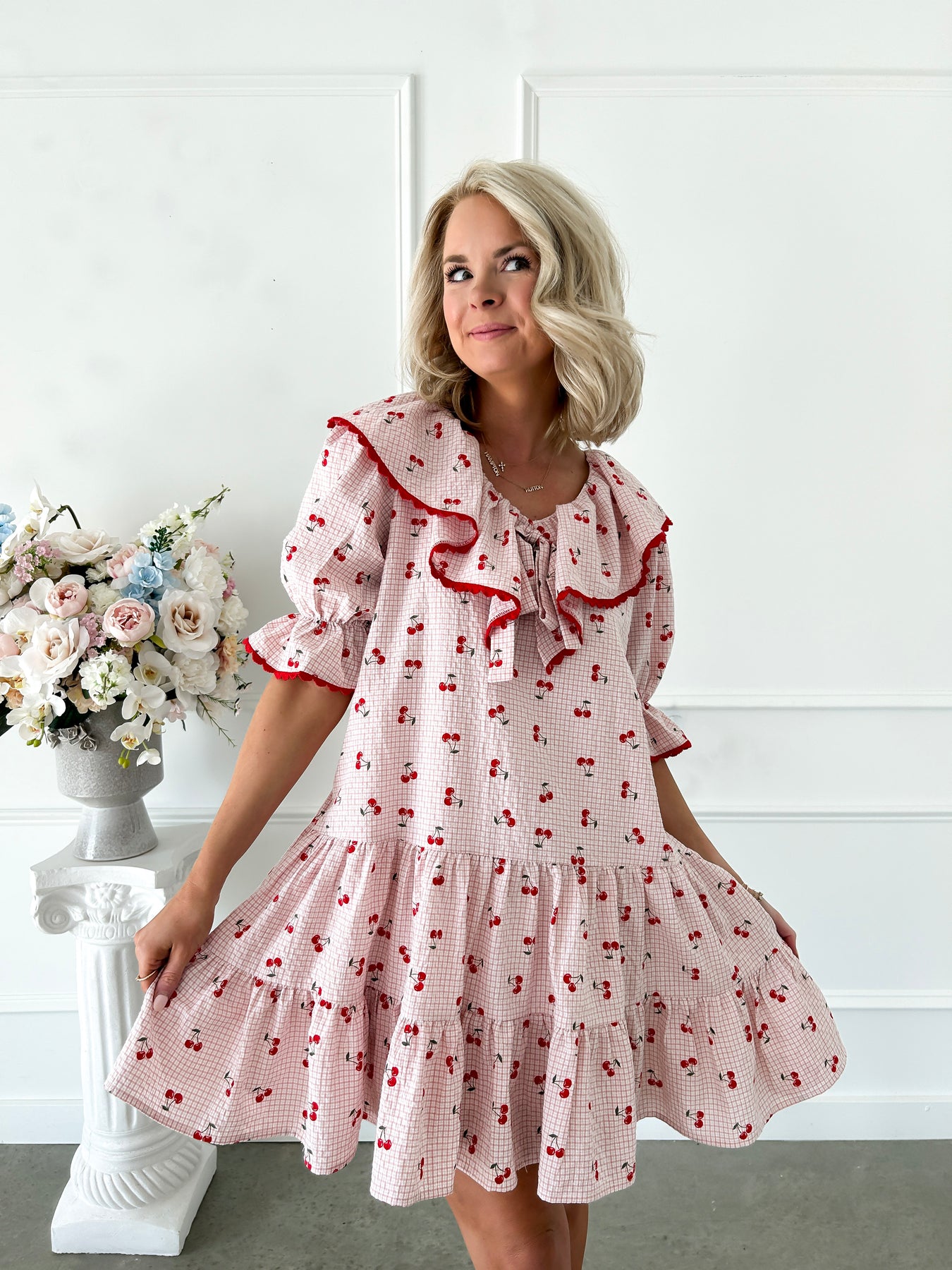 Step into sweetness with our Cherry Tea Time Pink Dress, a playful take on romantic style. This charming mini features delicate cherry-printed gingham in soft pink, complete with a flattering V-neckline and cascading ruffle-trimmed tiers that twirl with every move. Perfect for garden parties, brunch dates, or whenever you want to channel vintage-inspired whimsy with a modern twist. A dress that celebrates the joy of getting dressed up.