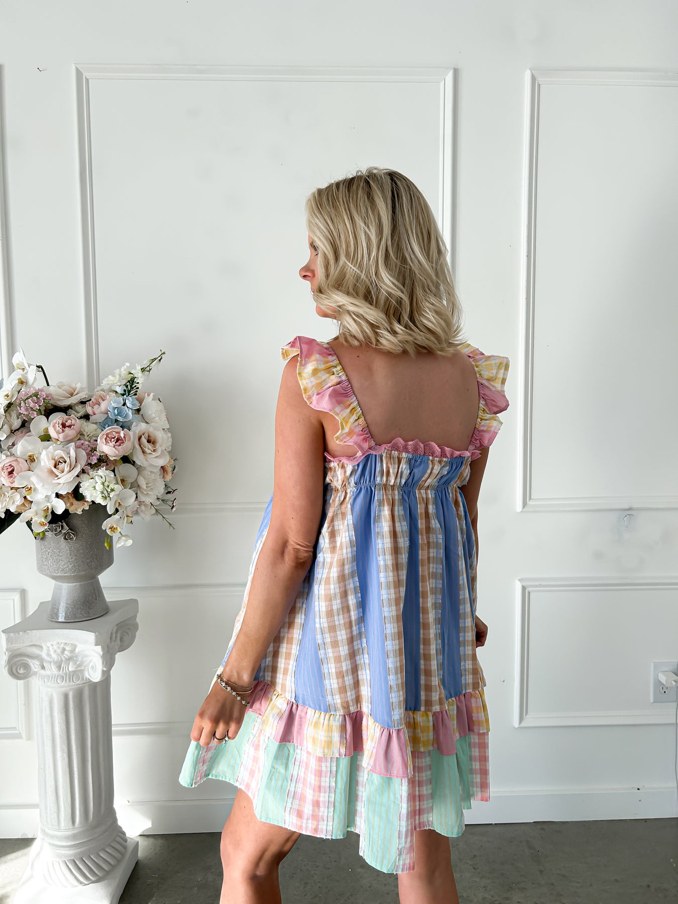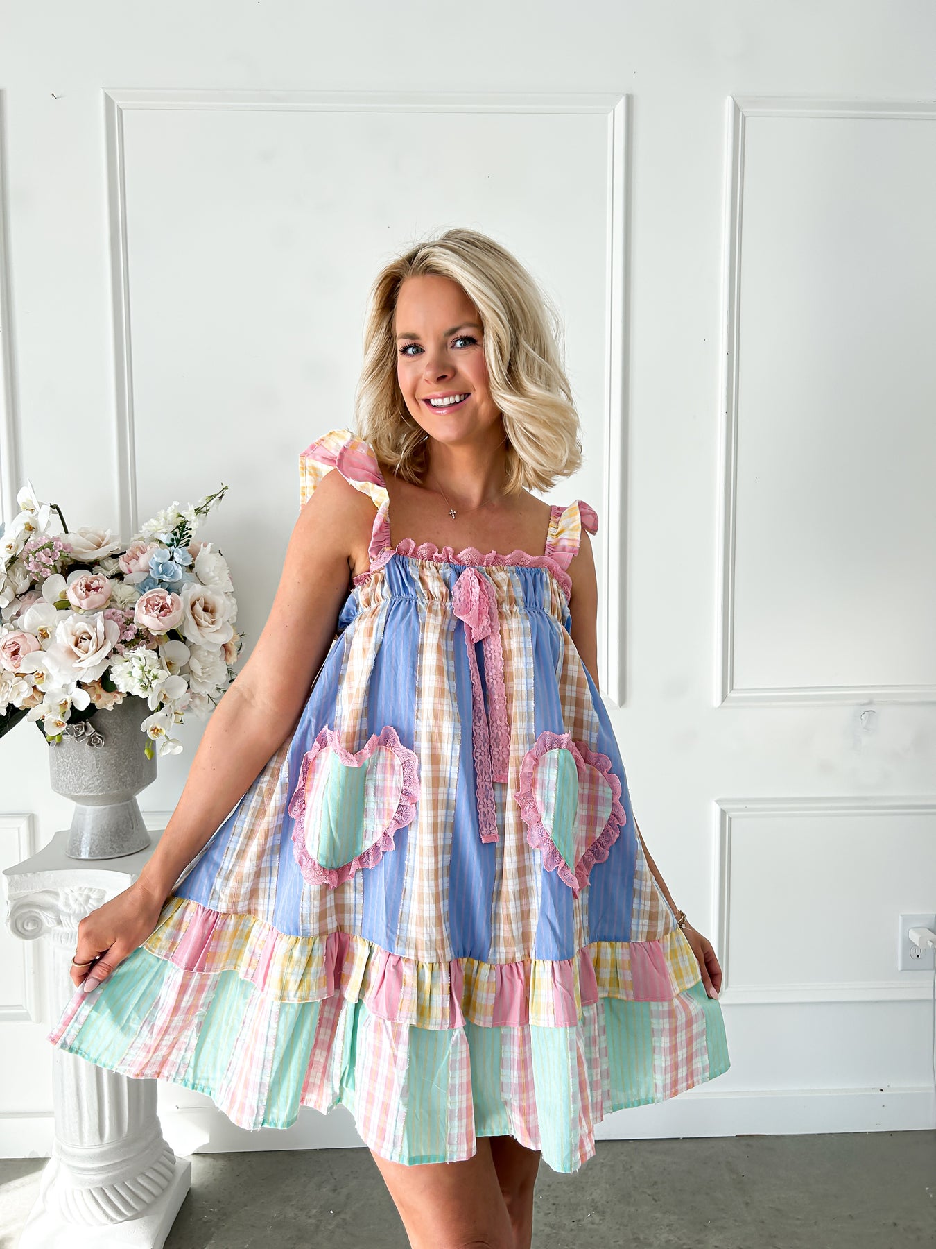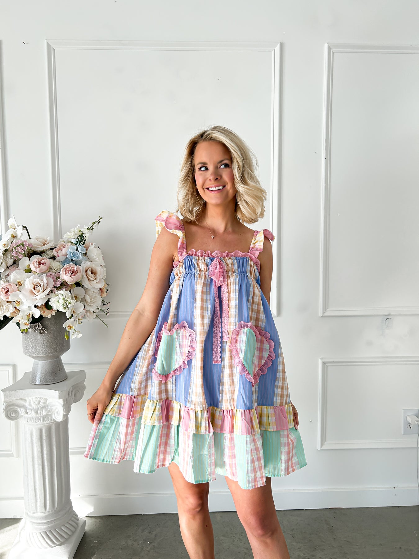 Embrace your inner dreamer with this whimsical patchwork mini dress, where pastel checks and stripes dance across soft cotton-blend fabric in shades of pink, blue, yellow, and mint. The square neckline features elastic gathering and ruffled shoulder straps, while a delicate pink lace ribbon tie adds feminine charm. Adorable heart-shaped patch pockets trimmed with pink ruffles bring playful personality, and a tiered ruffle hem creates beautiful movement. Perfect for spring adventures, lazy afternoons, or whenever you want to feel like you're wrapped in a candy-colored cloud.