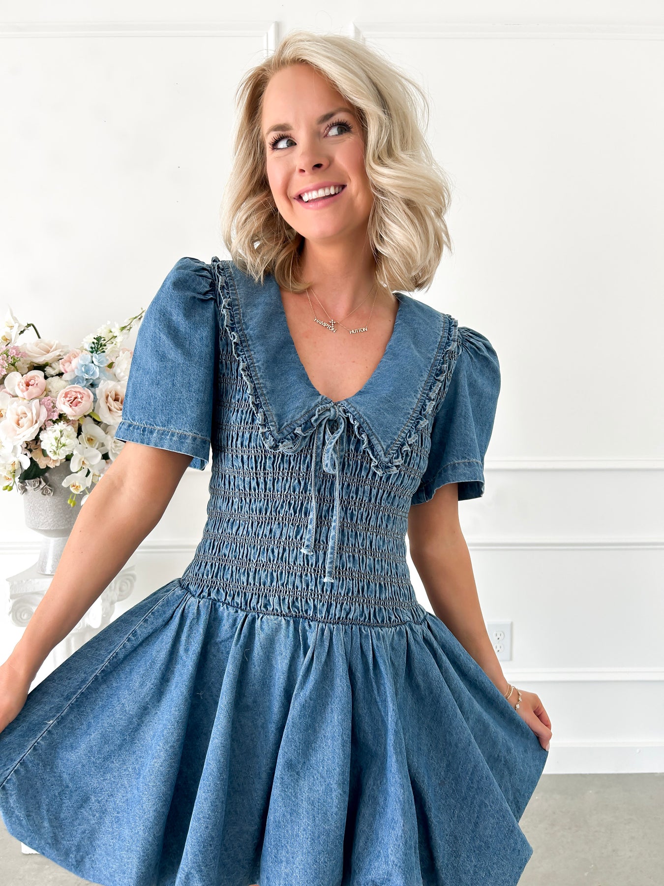 Twirl into denim dreams with this charming mini dress featuring a whimsical Peter Pan collar and delicate smocked bodice. Crafted from soft denim, it captures that perfect girly-girl aesthetic with vintage-inspired details that feel fresh and modern. The fitted smocking adds flattering texture while the playful collar brings instant personality to your wardrobe. Perfect for casual outings, weekend adventures, or whenever you want to channel effortless feminine style. A versatile piece that pairs beautifully with sneakers, boots, or sandals for endless outfit possibilities.