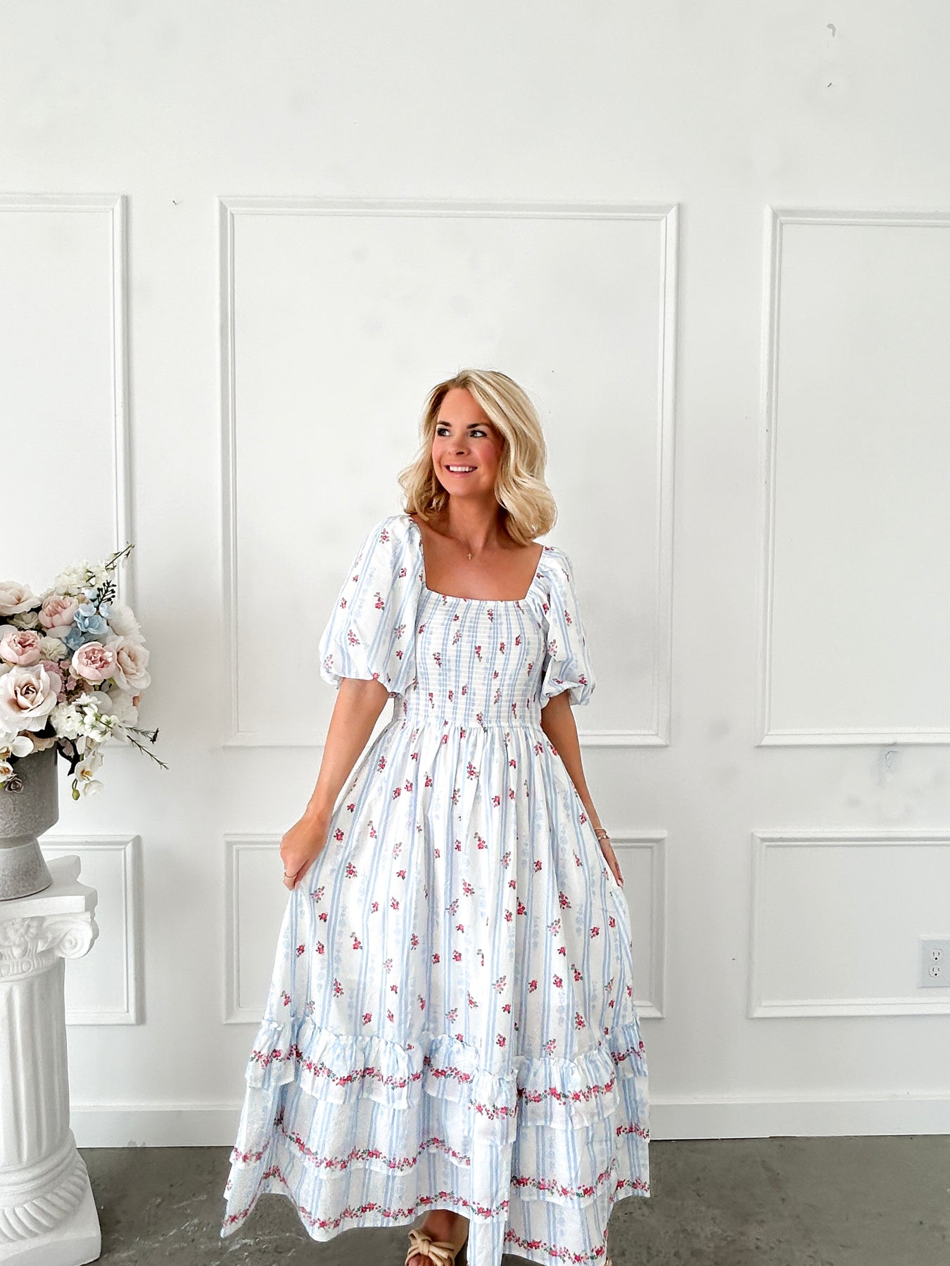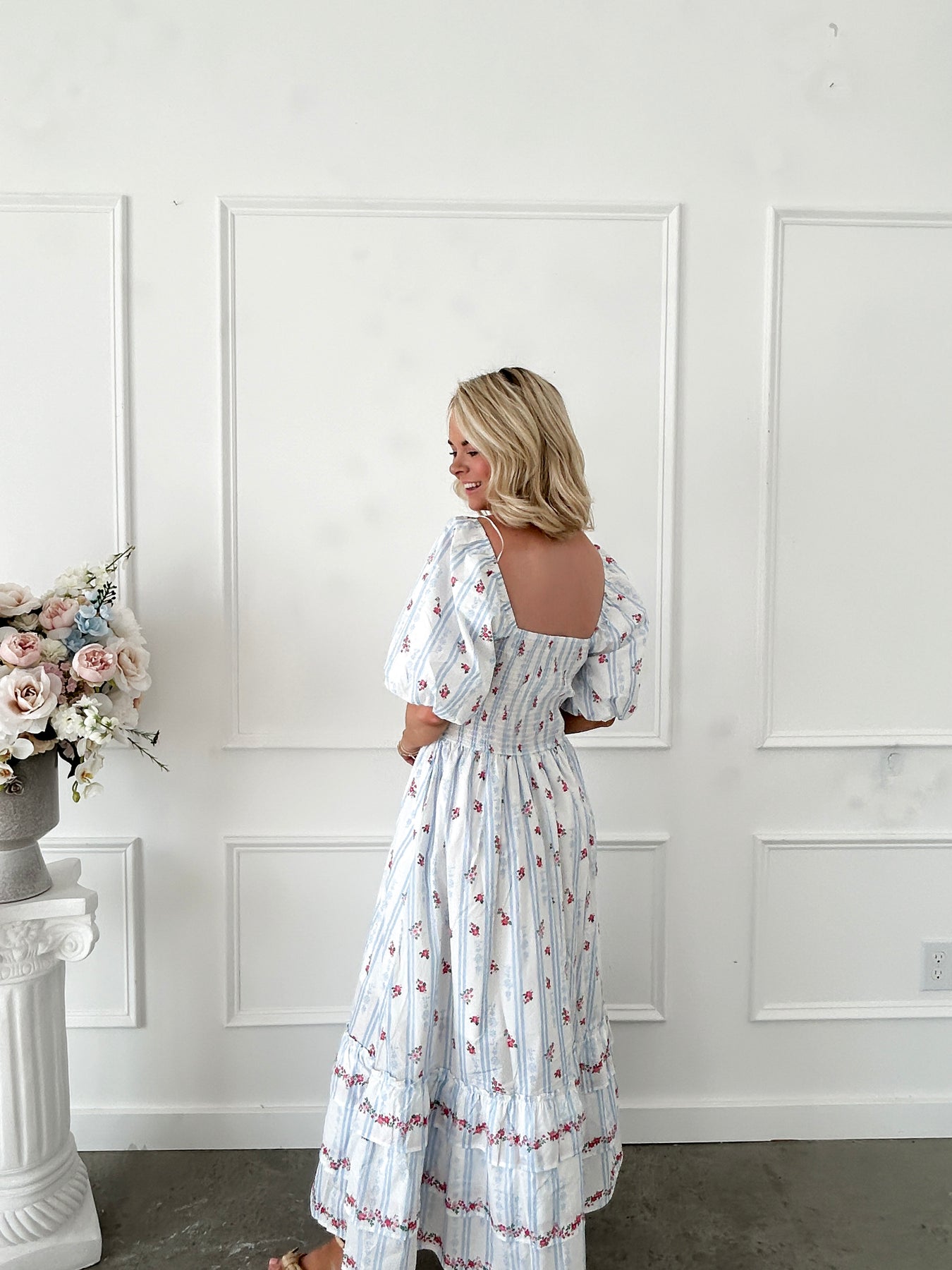 Step into a world of botanical bliss with the Garden Of Grace Blue Floral Maxi Dress. This enchanting cotton poplin creation whisks you away to sun-dappled gardens with its delicate floral print and dreamy blue palette. The playful short bubble sleeves add a touch of whimsy and feminine charm, while the flowing maxi silhouette promises effortless elegance for lazy summer days, garden parties, or any occasion calling for a dash of natural beauty. Perfect for those who believe getting dressed should feel like picking flowers.