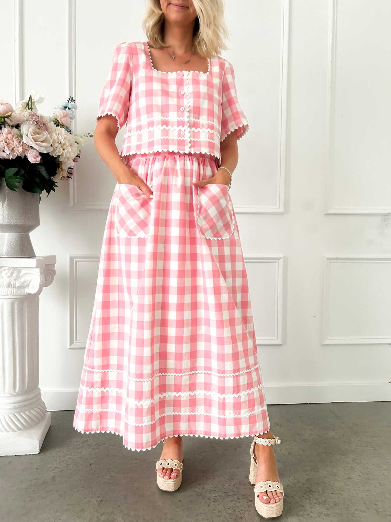 Twirl into springtime style with this charming pink gingham midi skirt. Featuring classic ric rac trim that adds a playful, girly touch, this skirt brings vintage-inspired sweetness to any wardrobe. The cheerful gingham pattern and flowy midi length create an effortlessly cute silhouette perfect for garden parties, casual outings, or pairing with coordinating pieces. Part of a coordinated set, mix and match for endless styling possibilities. Lucky as can be—this skirt is your ticket to feel-good fashion.