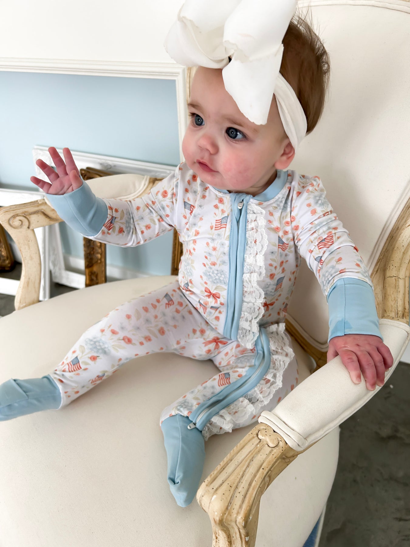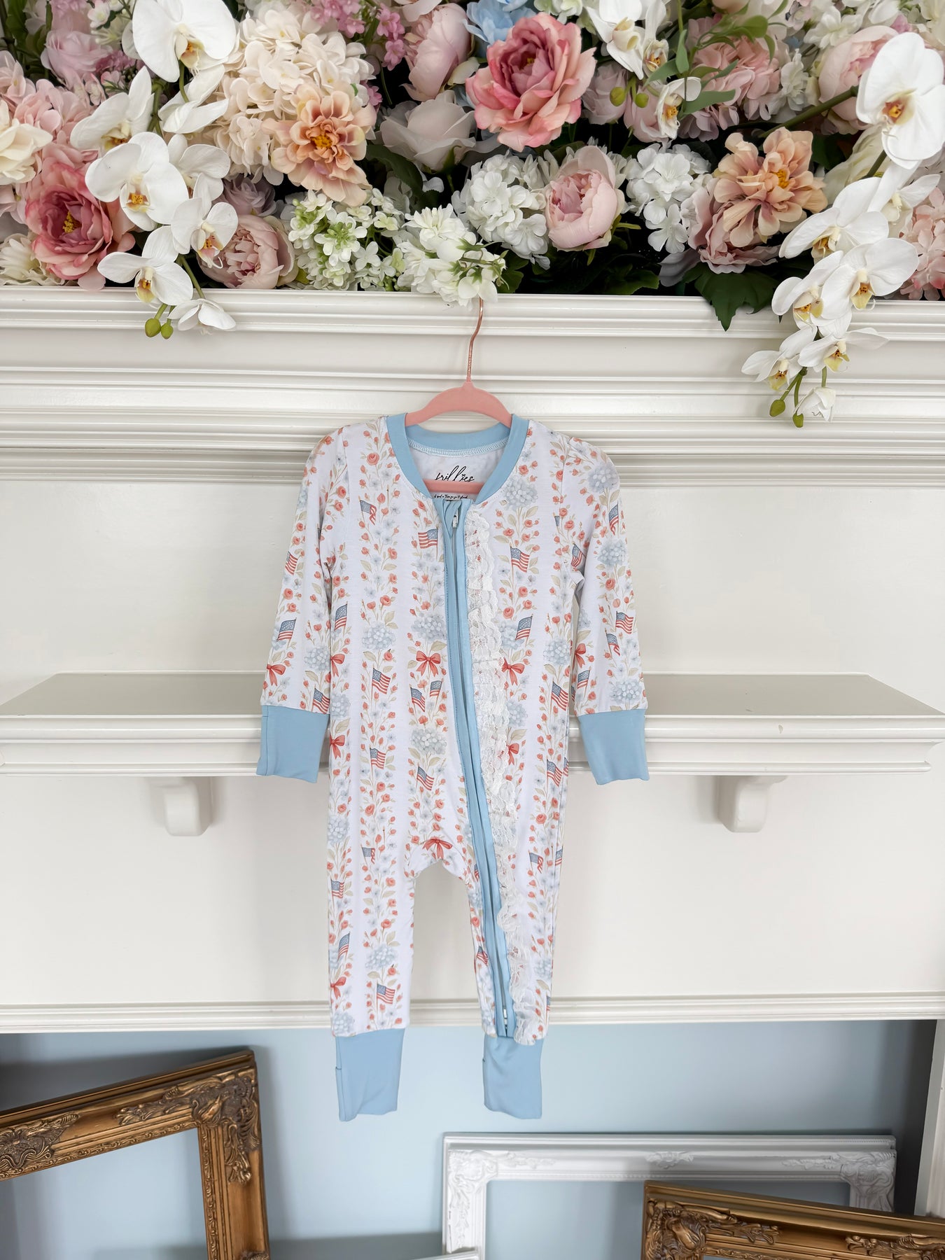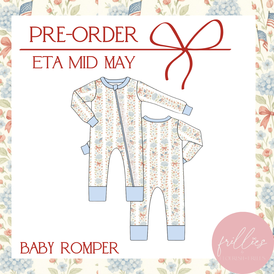 Wrap your little one in patriotic charm with the Liberty And Lace Romper! This adorable one-piece features a festive red, white, and blue color palette adorned with delicate floral patterns and sweet bows. Perfect for celebrating holidays or adding a touch of whimsy to everyday playtime, this romper combines comfort with patriotic spirit. Ideal for cozy bedtime or special occasions, it's a must-have for any baby's wardrobe. Available for preorder with an estimated delivery in mid-May.